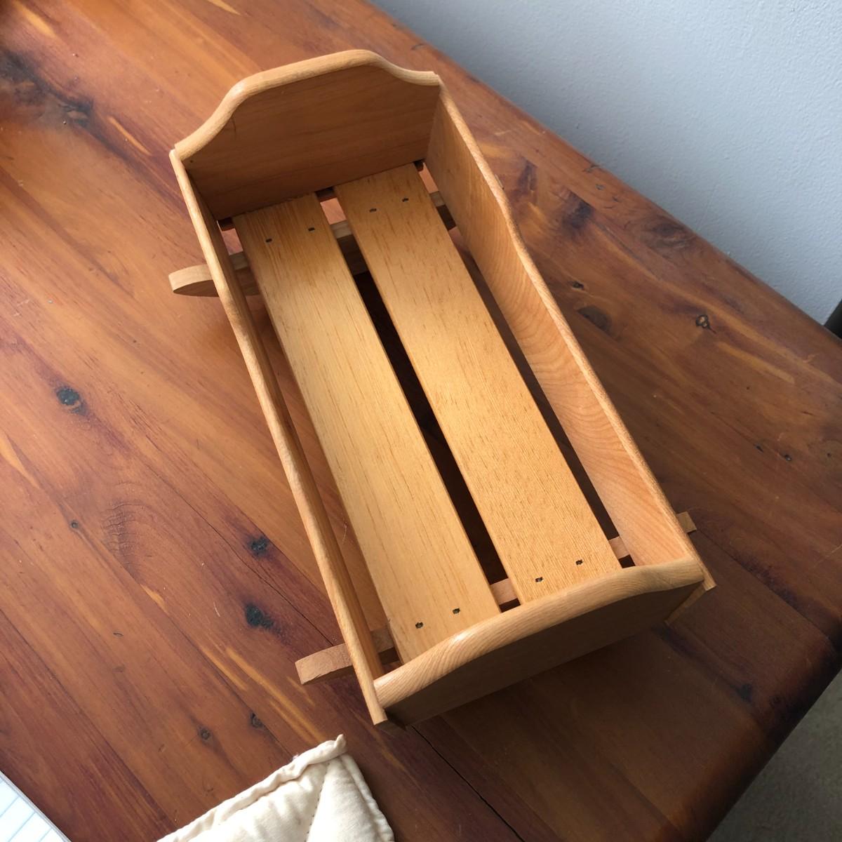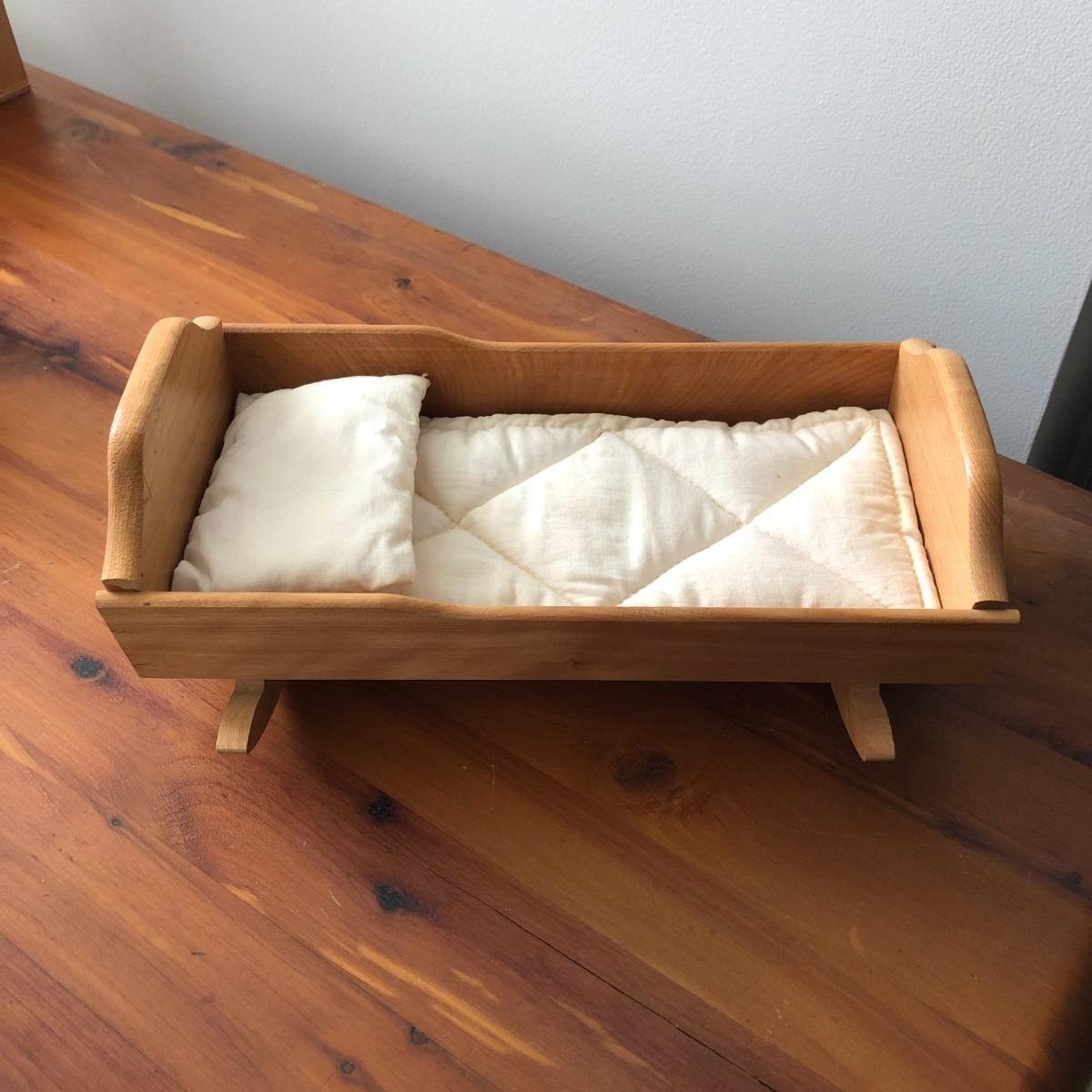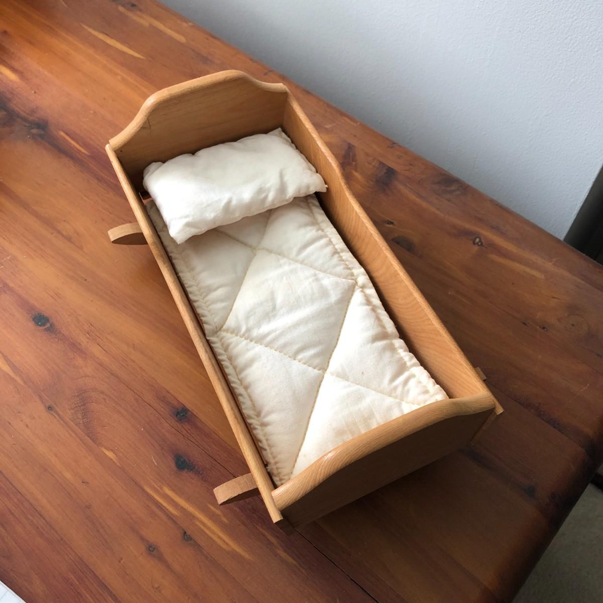 This set is from the consignor's childhood (1950s) and in excellent condition. The pad and pillow are original to the cradle. The cradle is about 10.25" long and 5" wide.