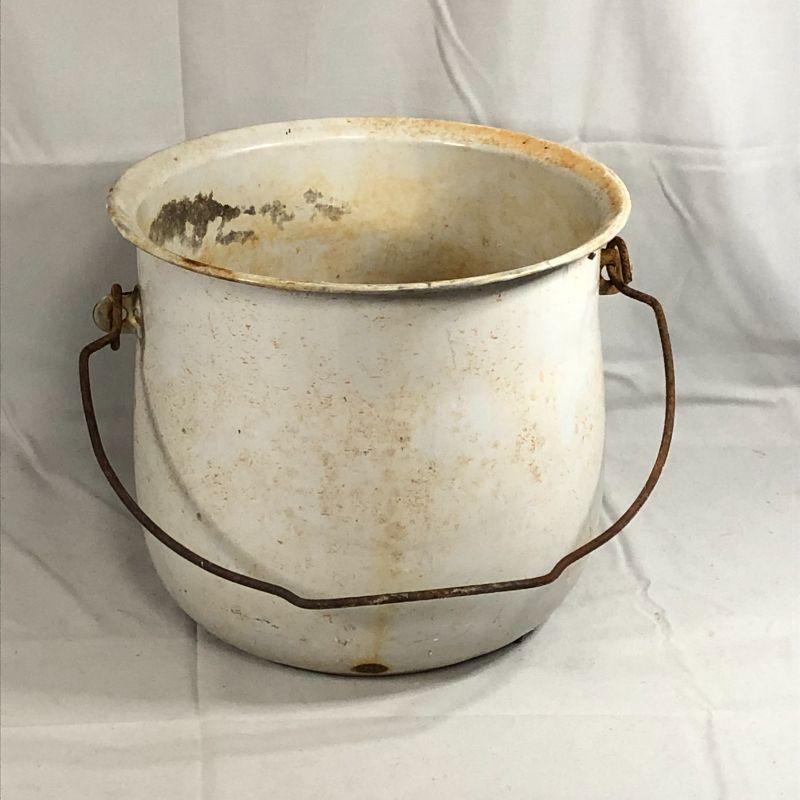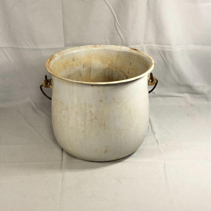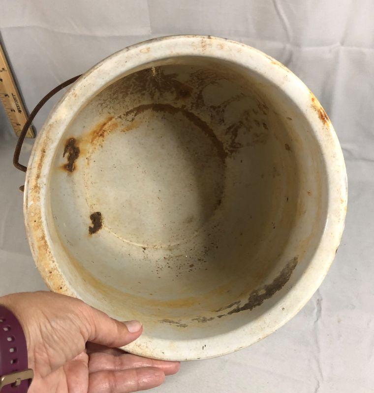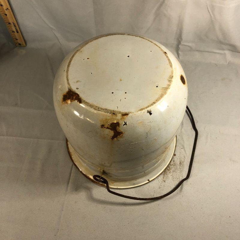 This almost looks like a chamber pot, but I may be wrong. It is about 8.5" tall and about 9.75" in diameter. It is in overall good condition, and I think that if it got a bath, it would look even better. There are a couple of spots of rust and enamel chips.