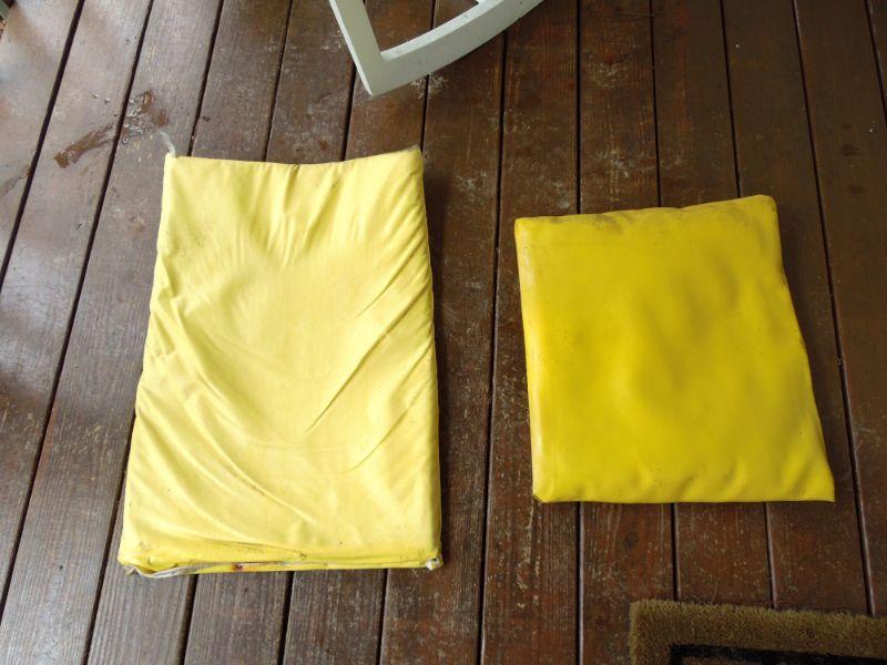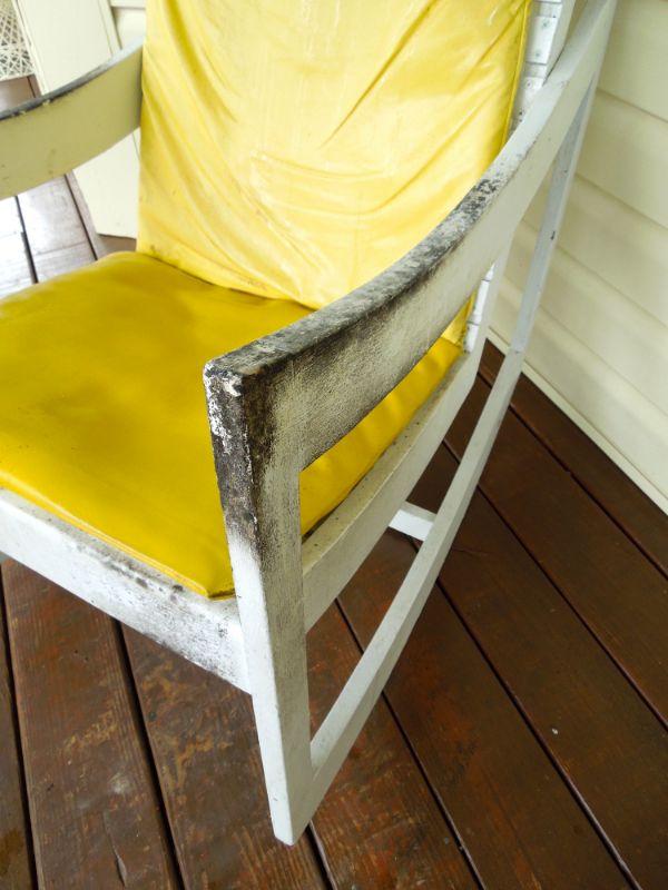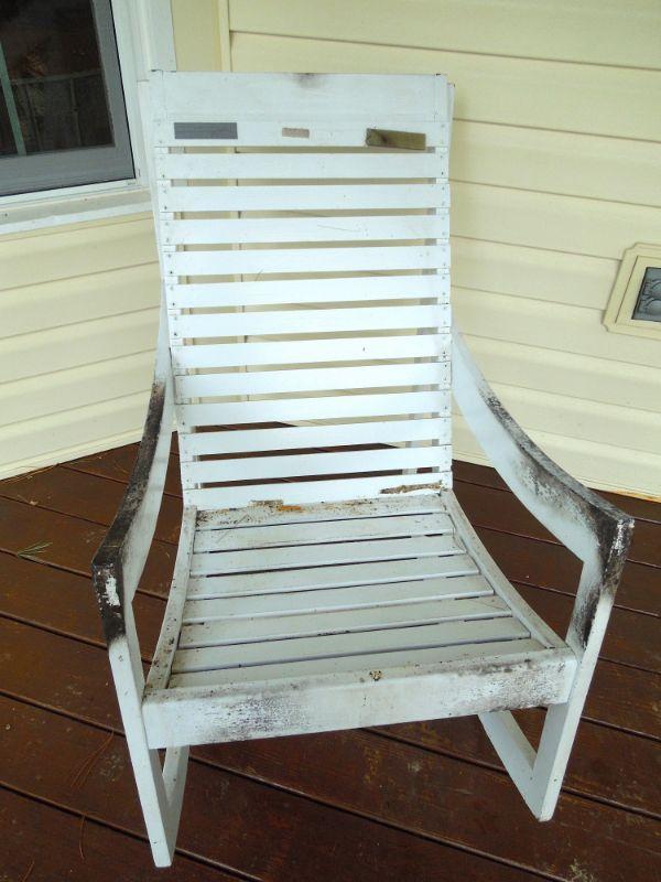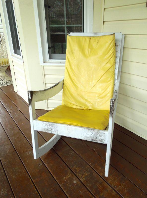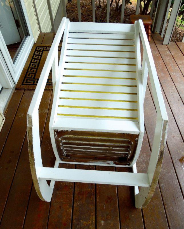 Painted wood slat design sleek rocking chair. 23" W x 38" H x 31" D. Paint on arms has mildewed and did not wipe clean. Cushions are lightly mildewed and wiped clean but will need more work. No splits in wood or damaged slats.