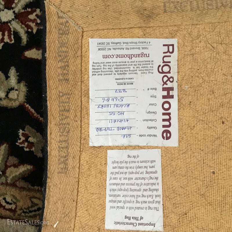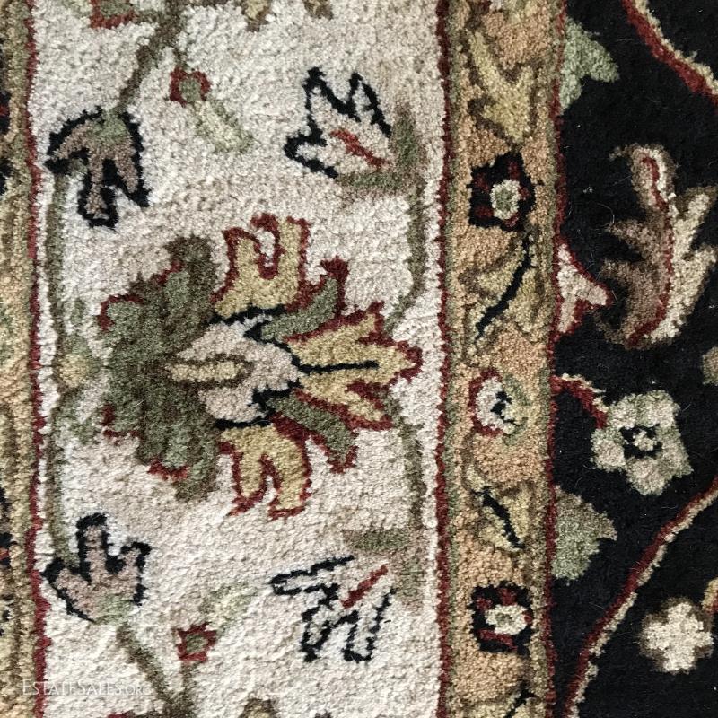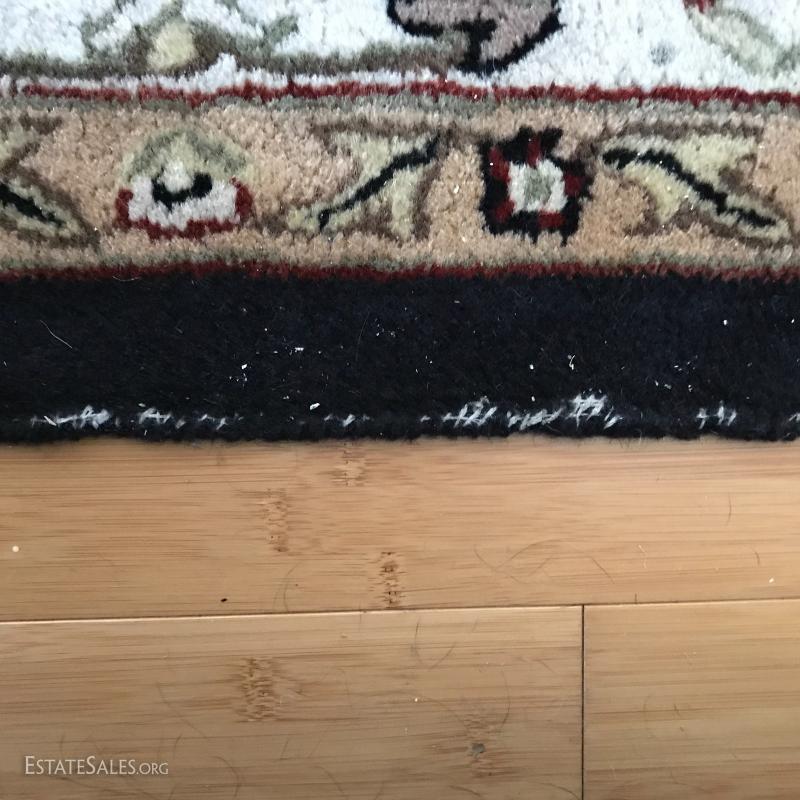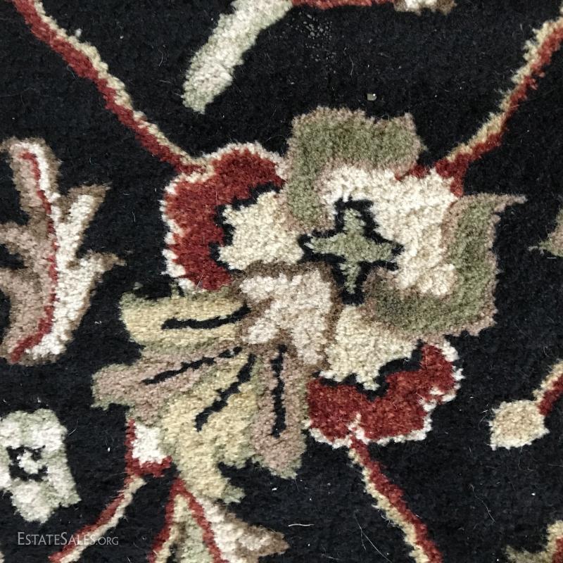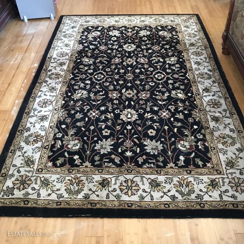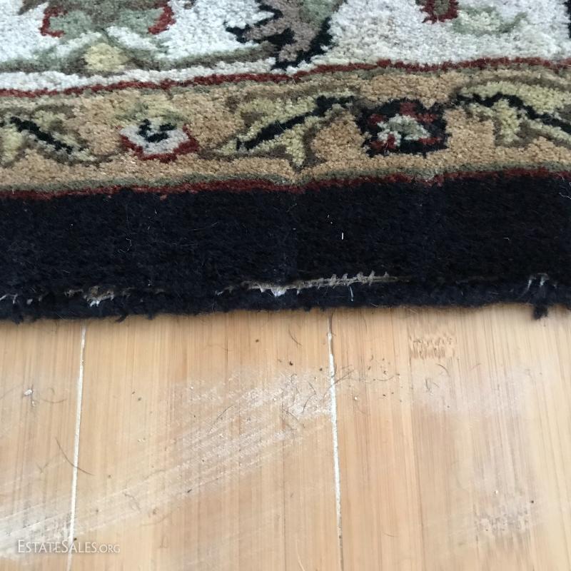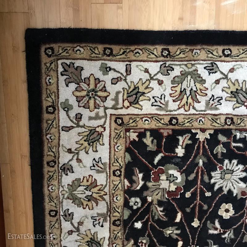 Hand-tufted wool rug in tones of black and ivory. Slight wear on two edges (see photos). 101"l x 66"w. In home that had cats.