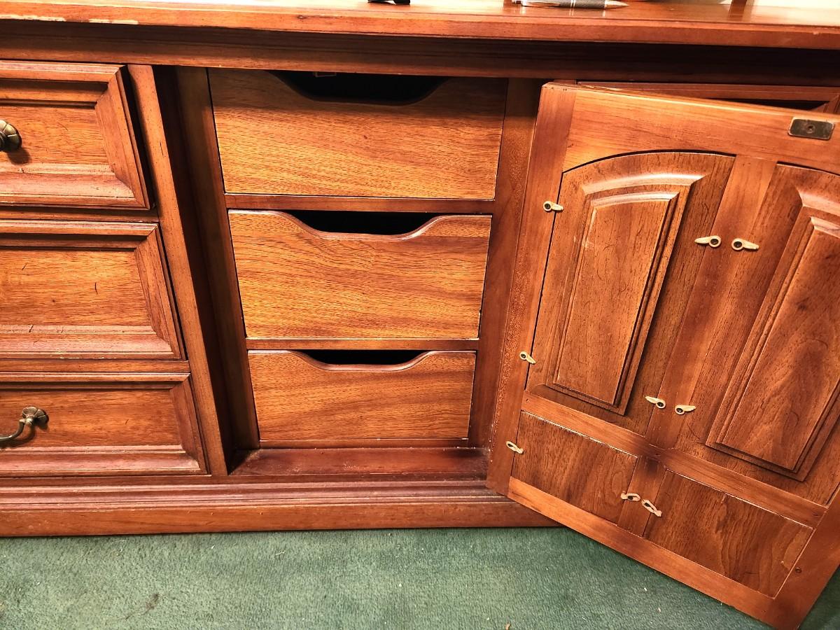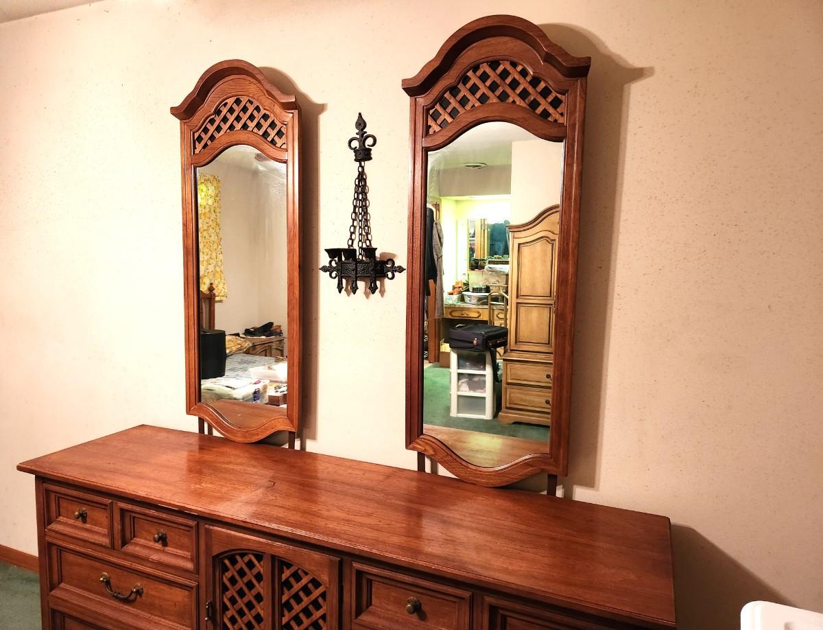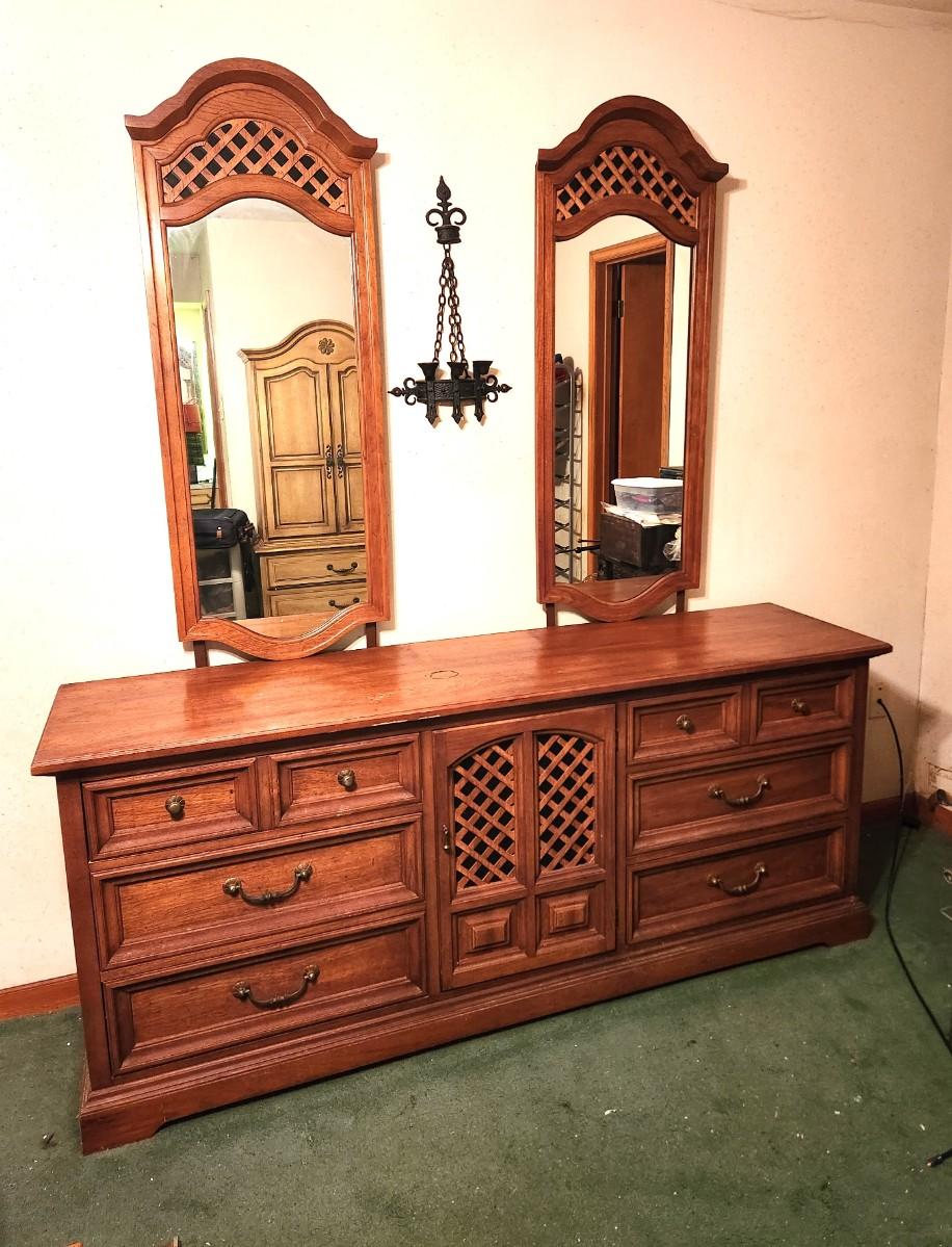 Mirrors are removeable - center lattice doors open to reveal more drawers - no maker's mark noted - 32" tall without mirror, mirros add another 51". 19" deep, 75 " long. 1970's style - good vintage condition.