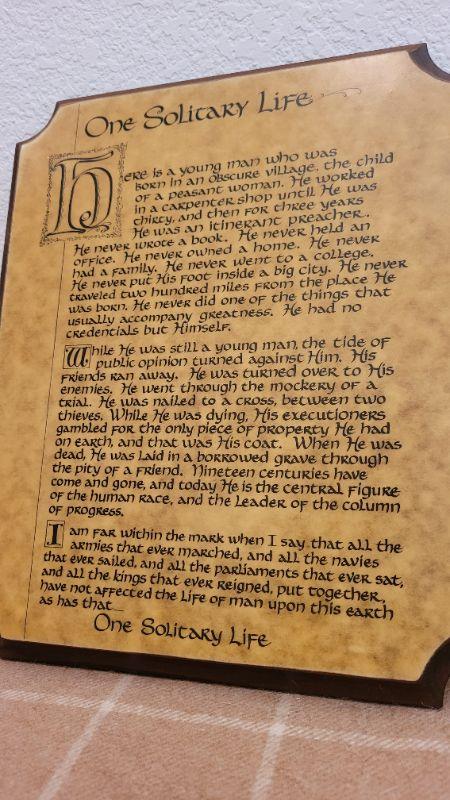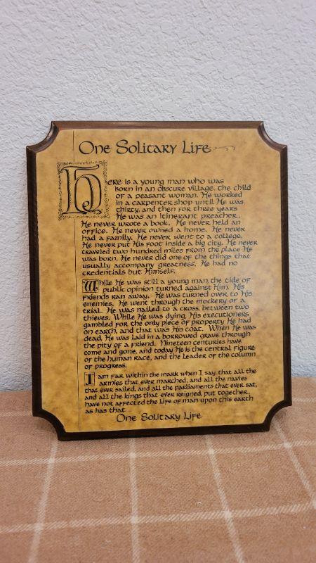 Lot 230: Vintage WOODCRAFT BY KEN "One Solitary Life" Hanging Home Deco