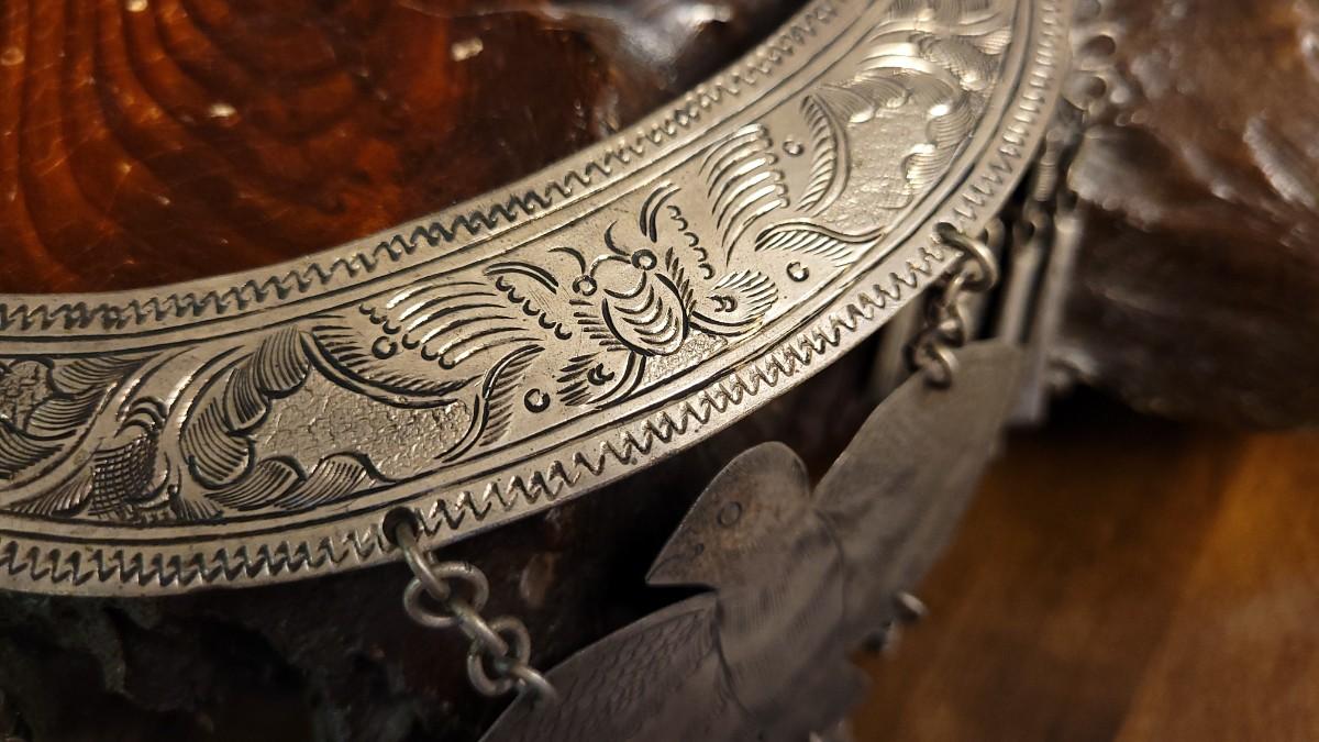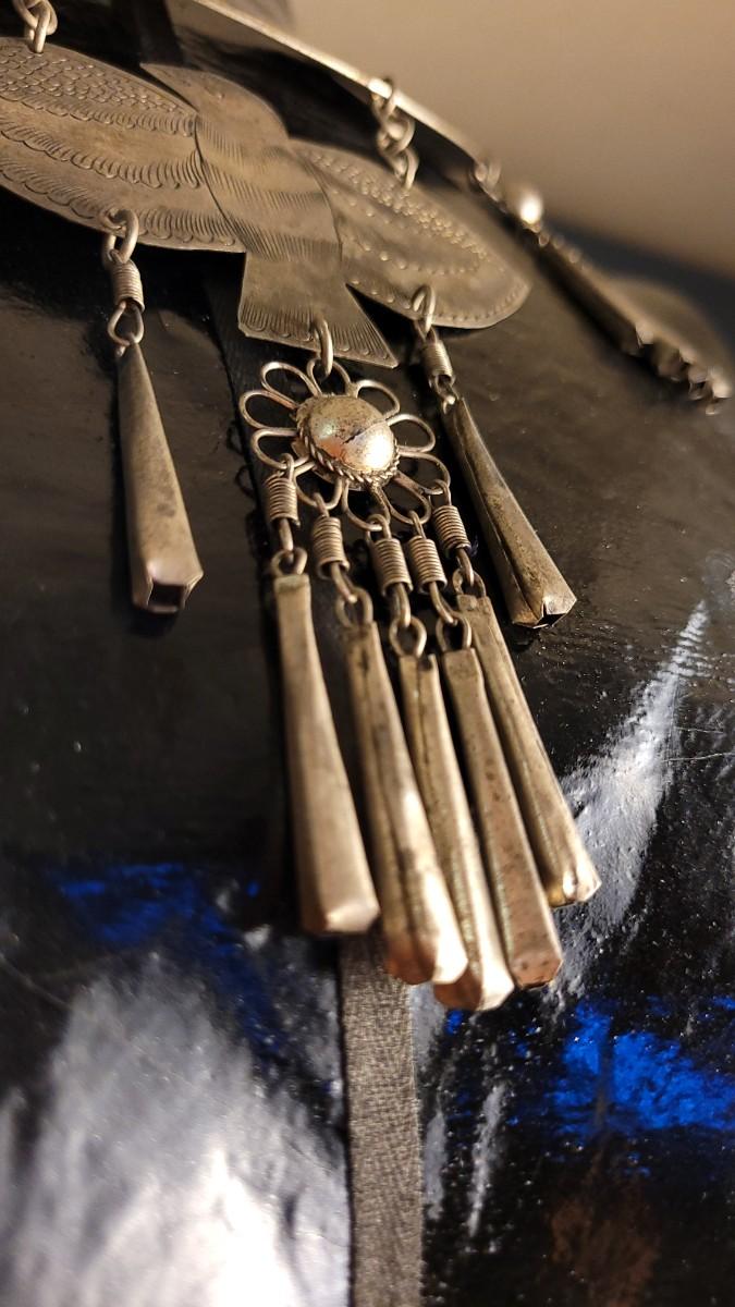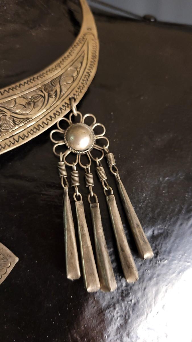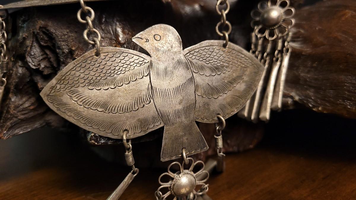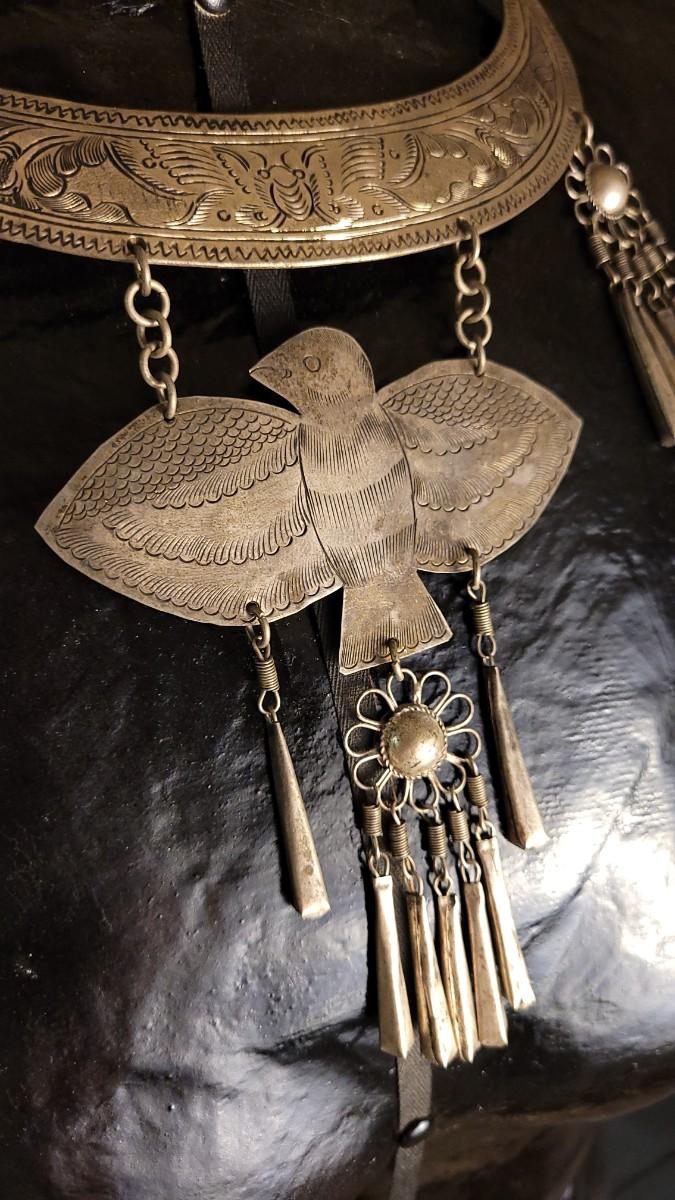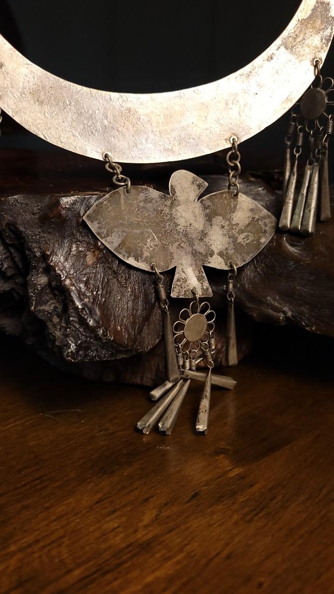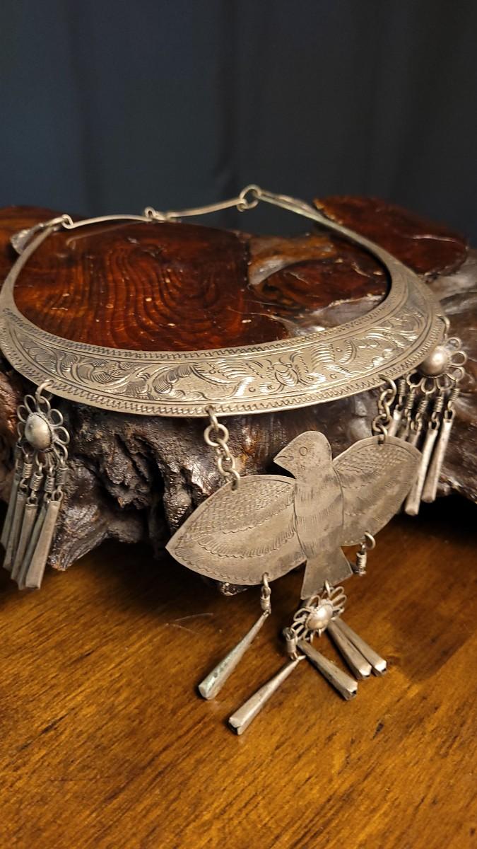 Lot 230: Vintage Sterling Repousse Handmade Stamped Bird Fetish Collared Necklace with Barrel Dangles