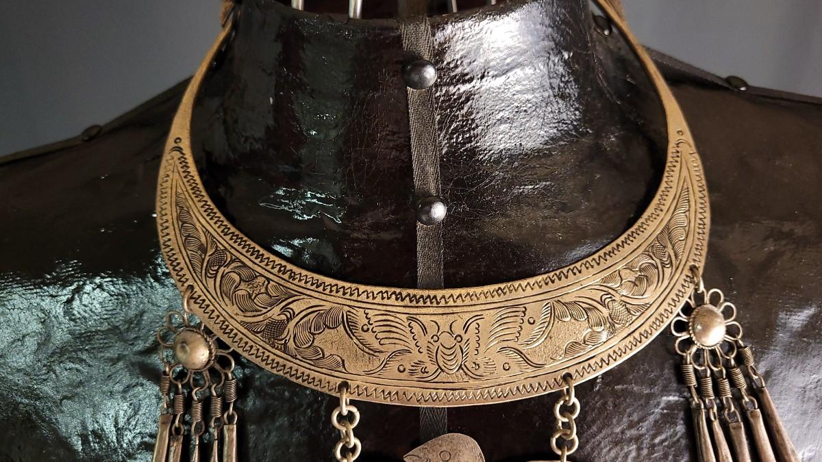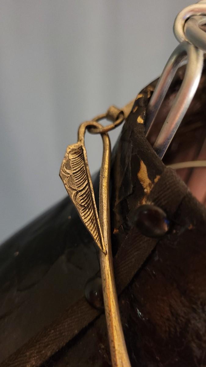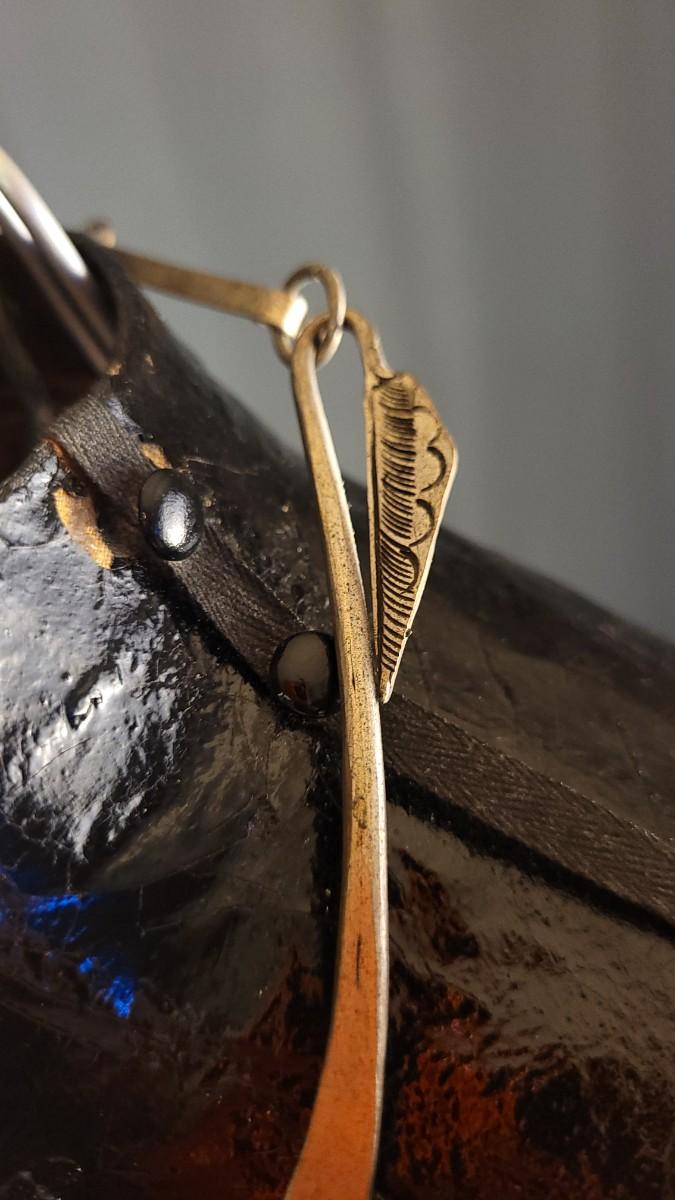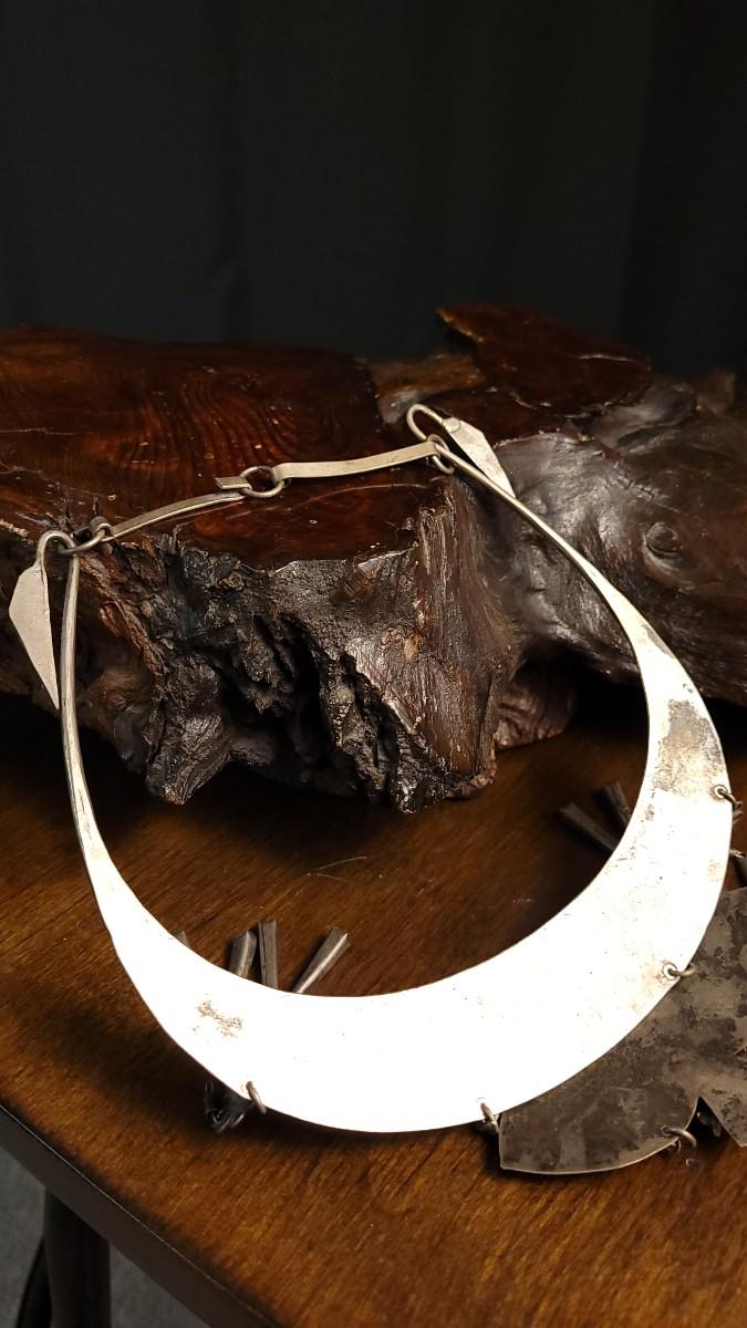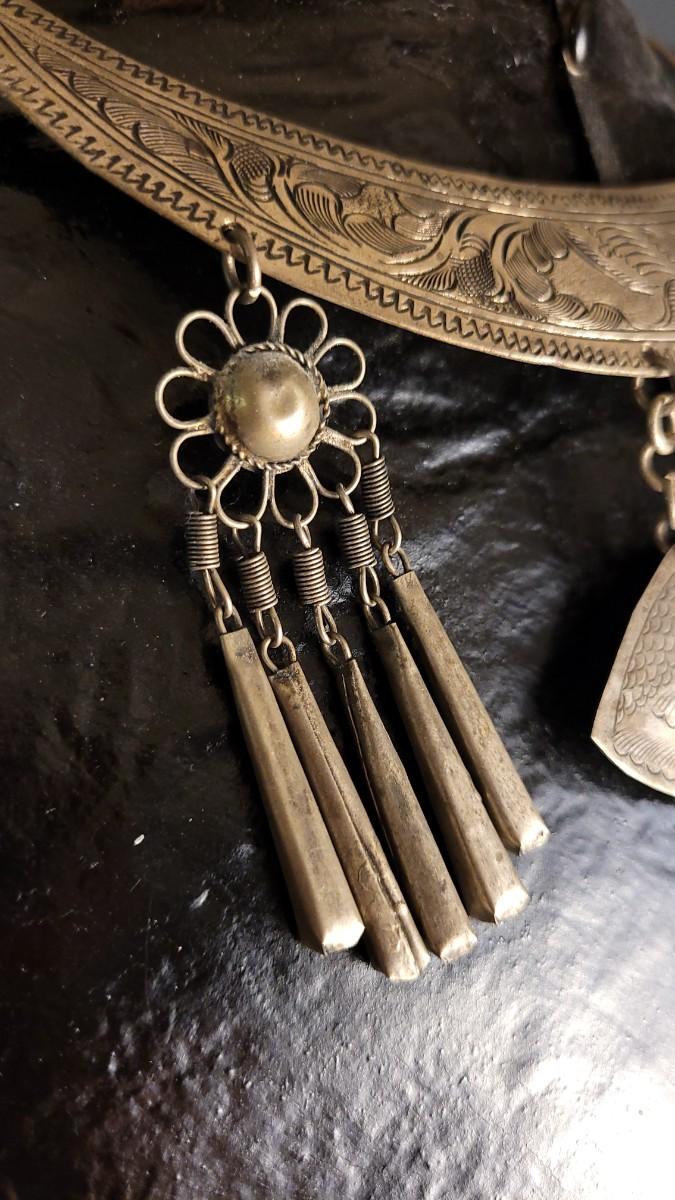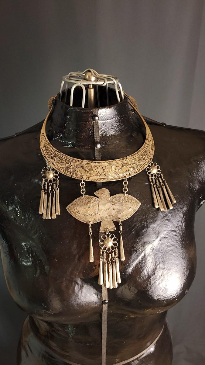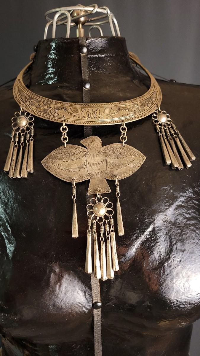 This lot features a gorgeous handmade Vintage Bird Fetish necklace in the brutalist style. The drop is about 5.25" and collar is about 5.5" at the widest point. The bird Pendant is about 2" x 3.75". Each of the barrel drop dangle Accents is about 1.5". From top of collar to lowest dangle point is about 11". Unmarked.