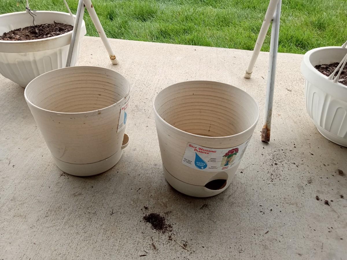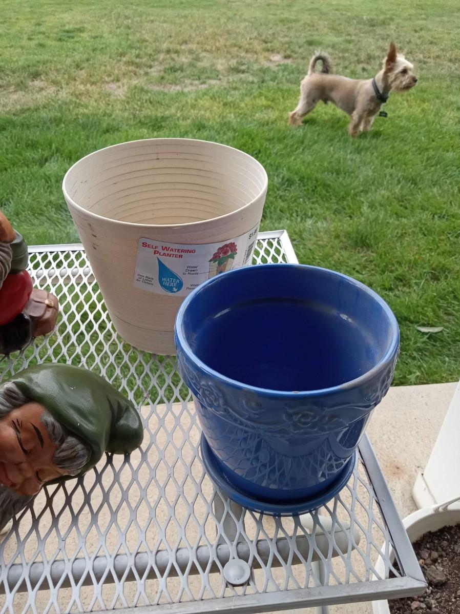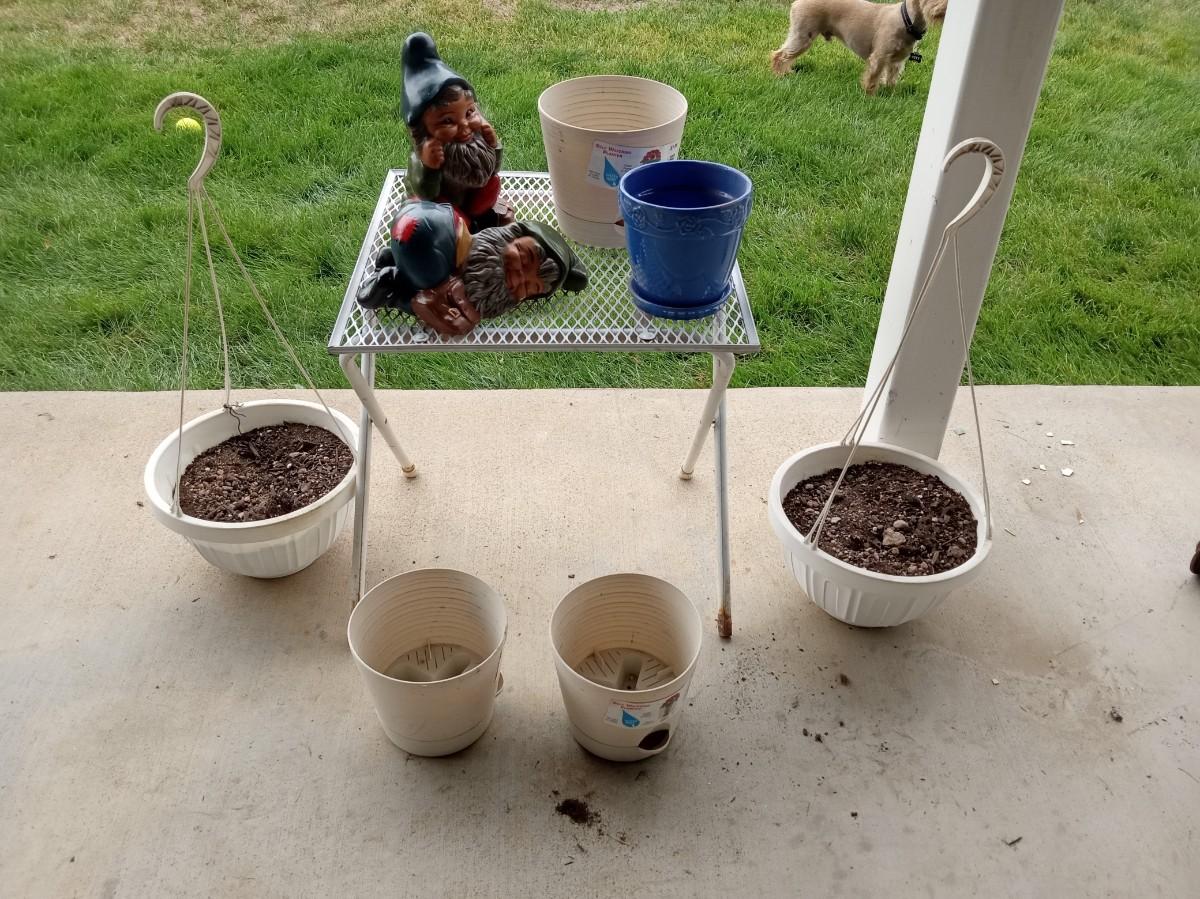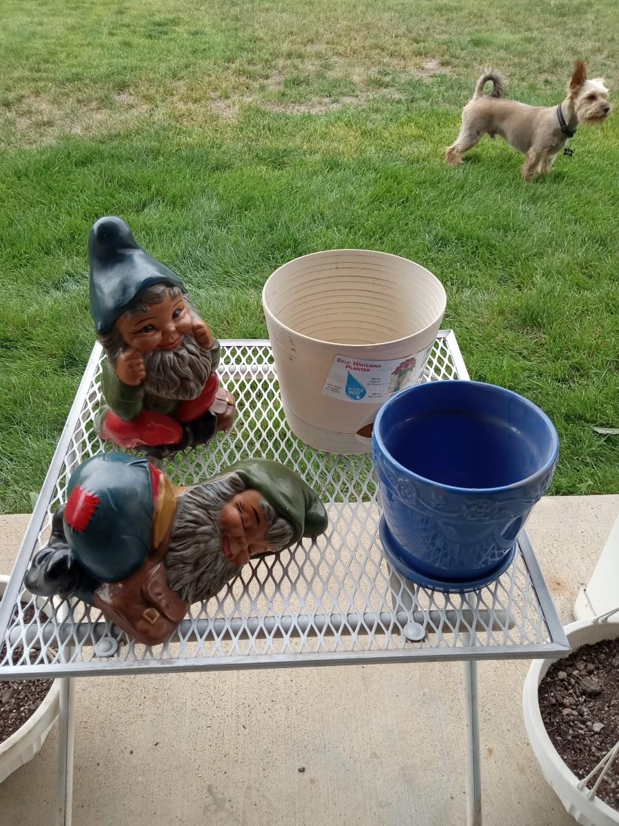 LOT 230  CERAMIC GNOMES, MESH FOLDING TABLE AND FLOWER POTS
