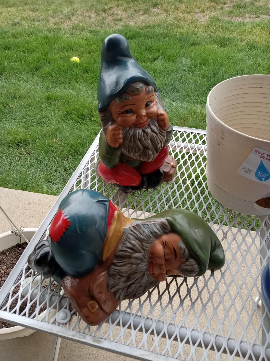 LOT 230 CERAMIC GNOMES, MESH FOLDING TABLE AND FLOWER POTS