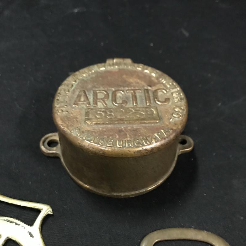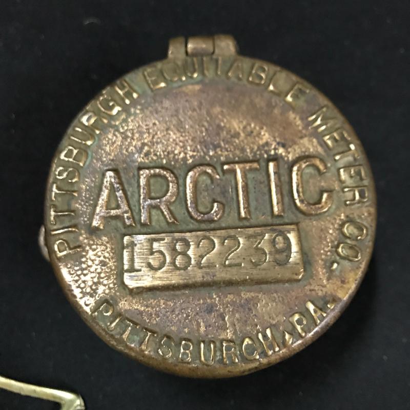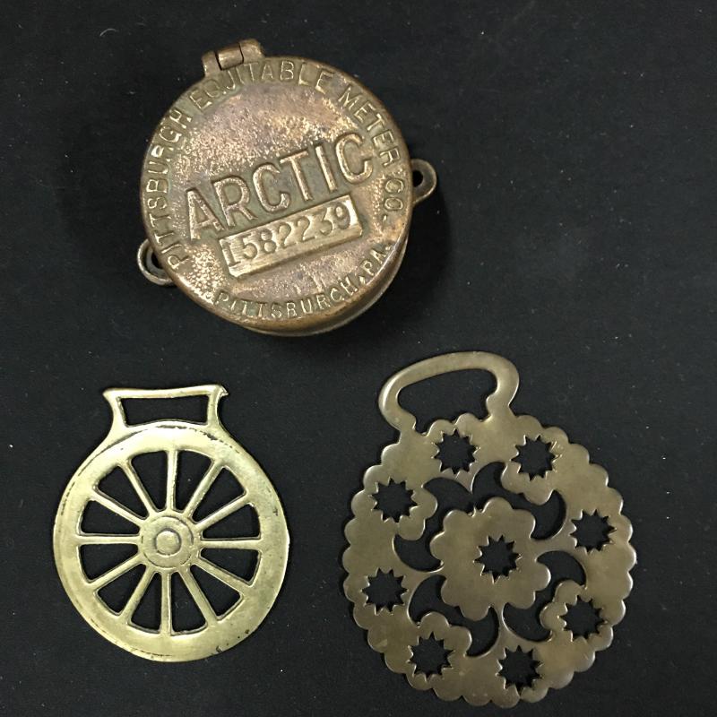 Pittsburgh Equitable Meter Co Brass Meter. Also two Medallions. Meter Measures 3”d x 2”h. Shipping or local pick up in Asheville