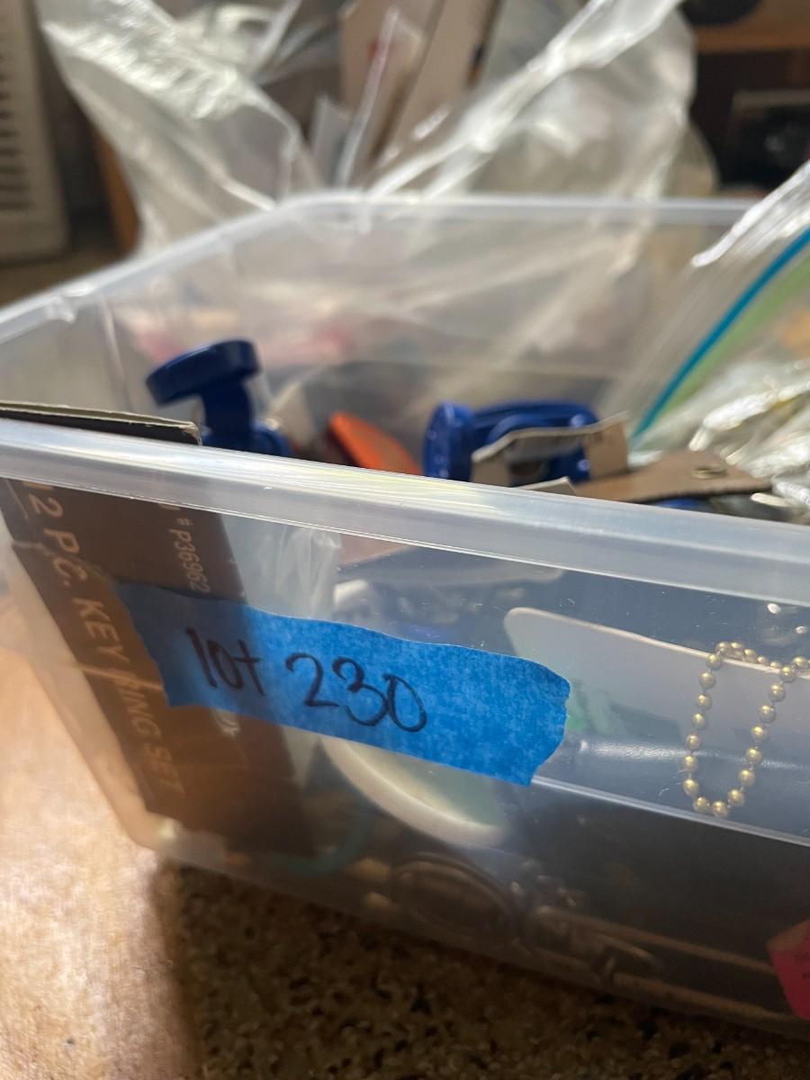 lot 230- box of misc. keys, keychains, dog door stopper, locks, bag of misc. toiletries