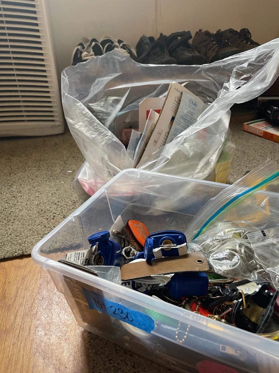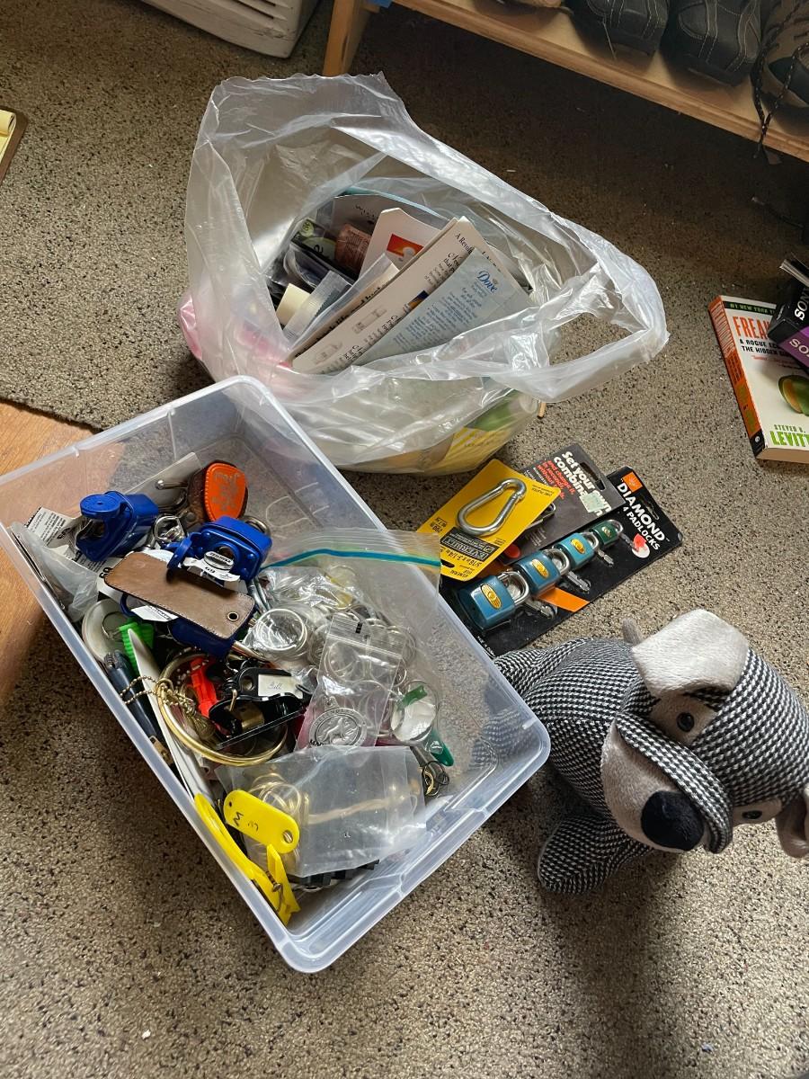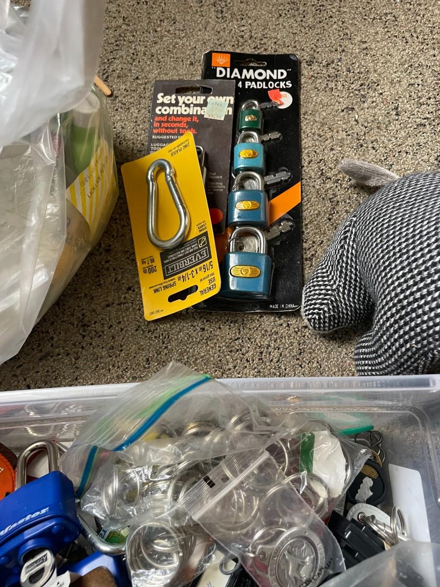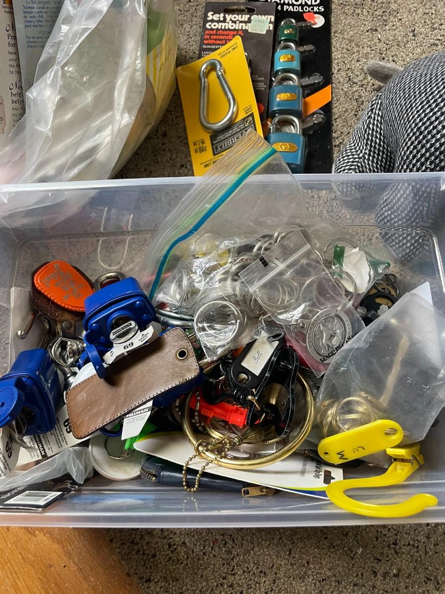 box of misc. keys, keychains, dog door stopper, locks, bag of misc. toiletries.