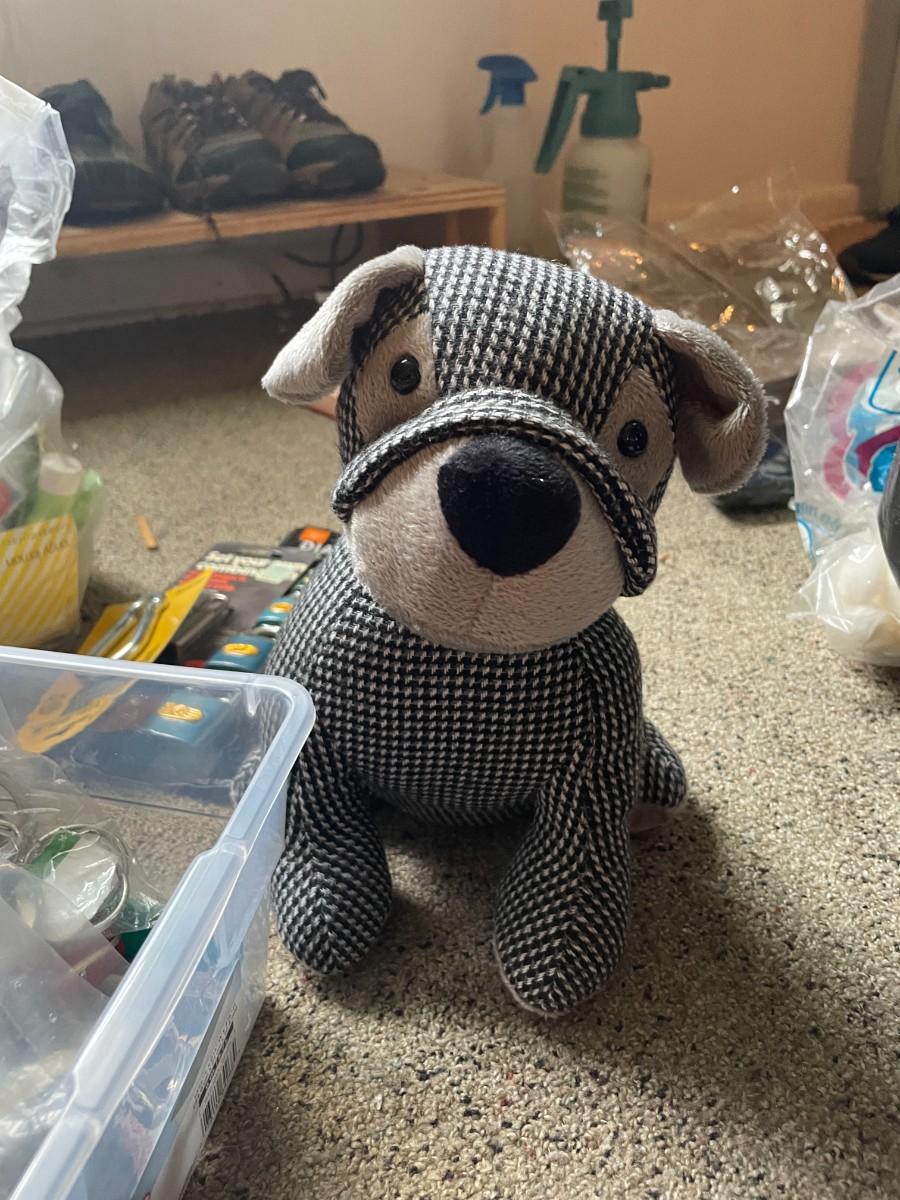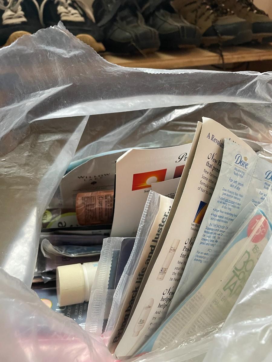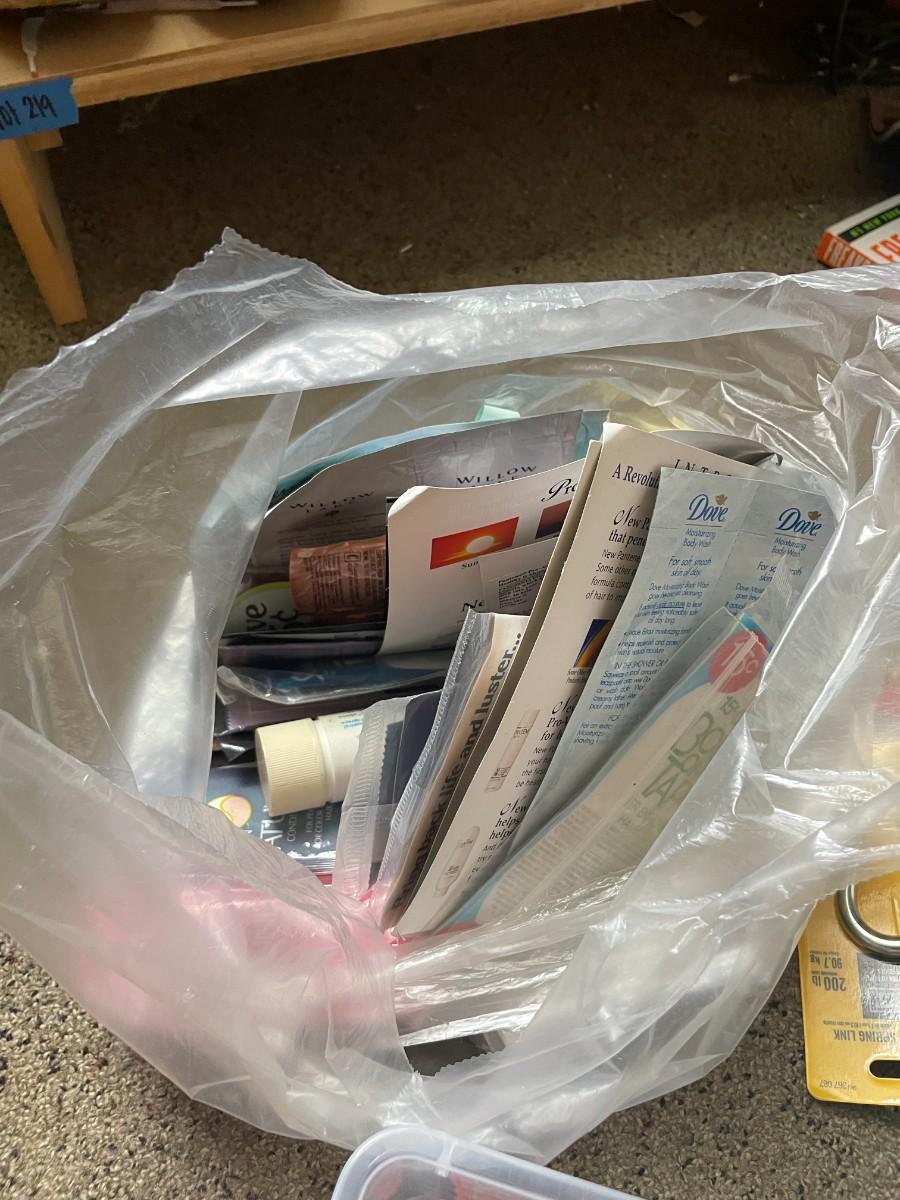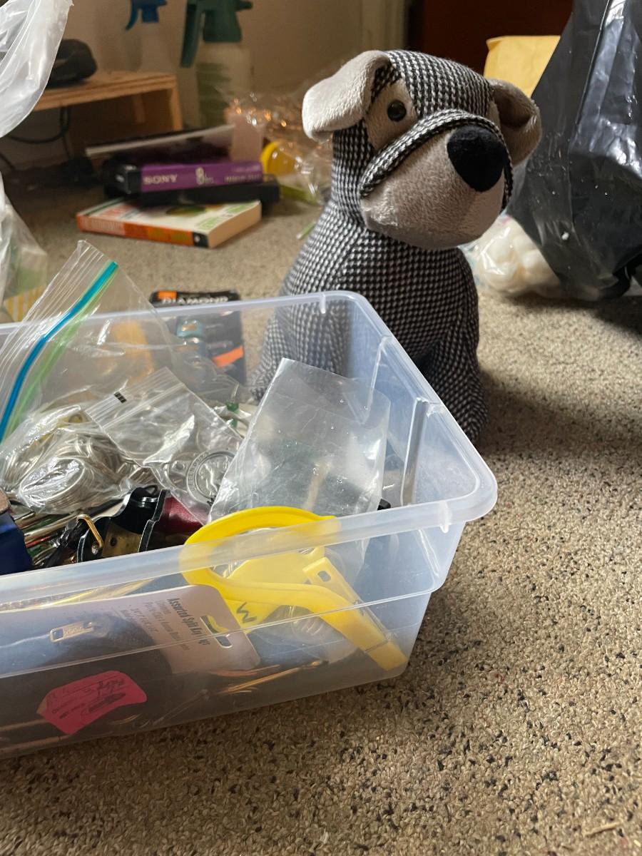 box of misc. keys, keychains, dog door stopper, locks, bag of misc. toiletries.
