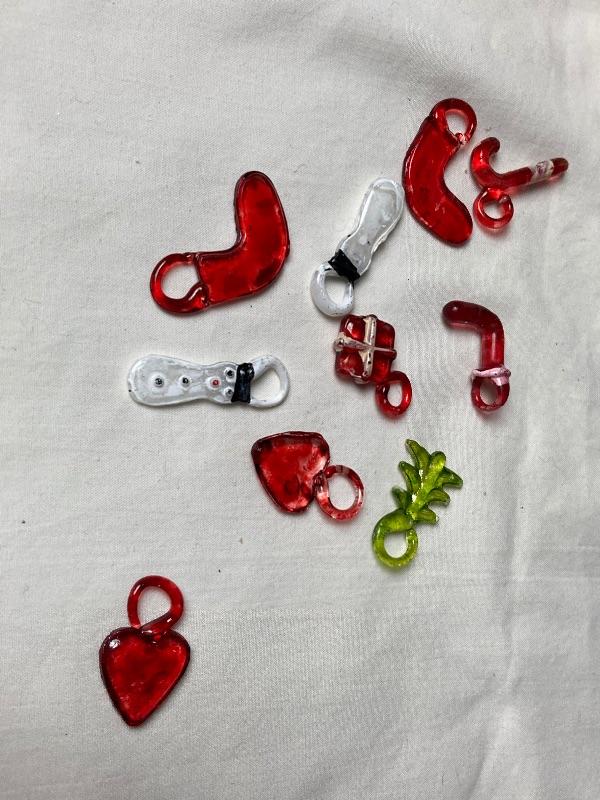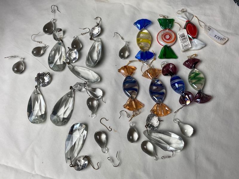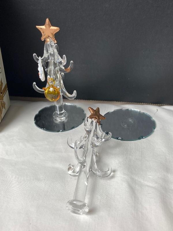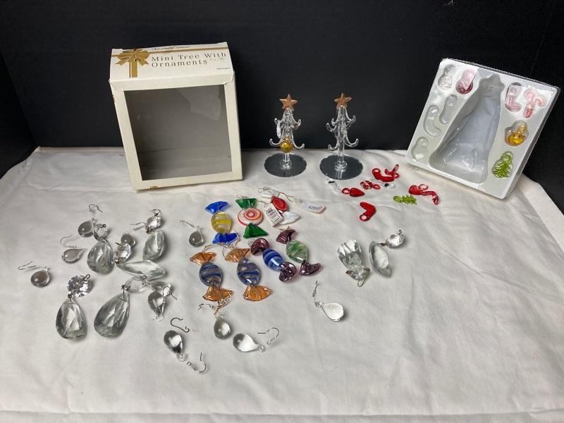 Two miniature Glass Christmas trees with glass ornaments. One tree needs to be ref lied to it’s base. Also included is an assortment of small glass ornaments