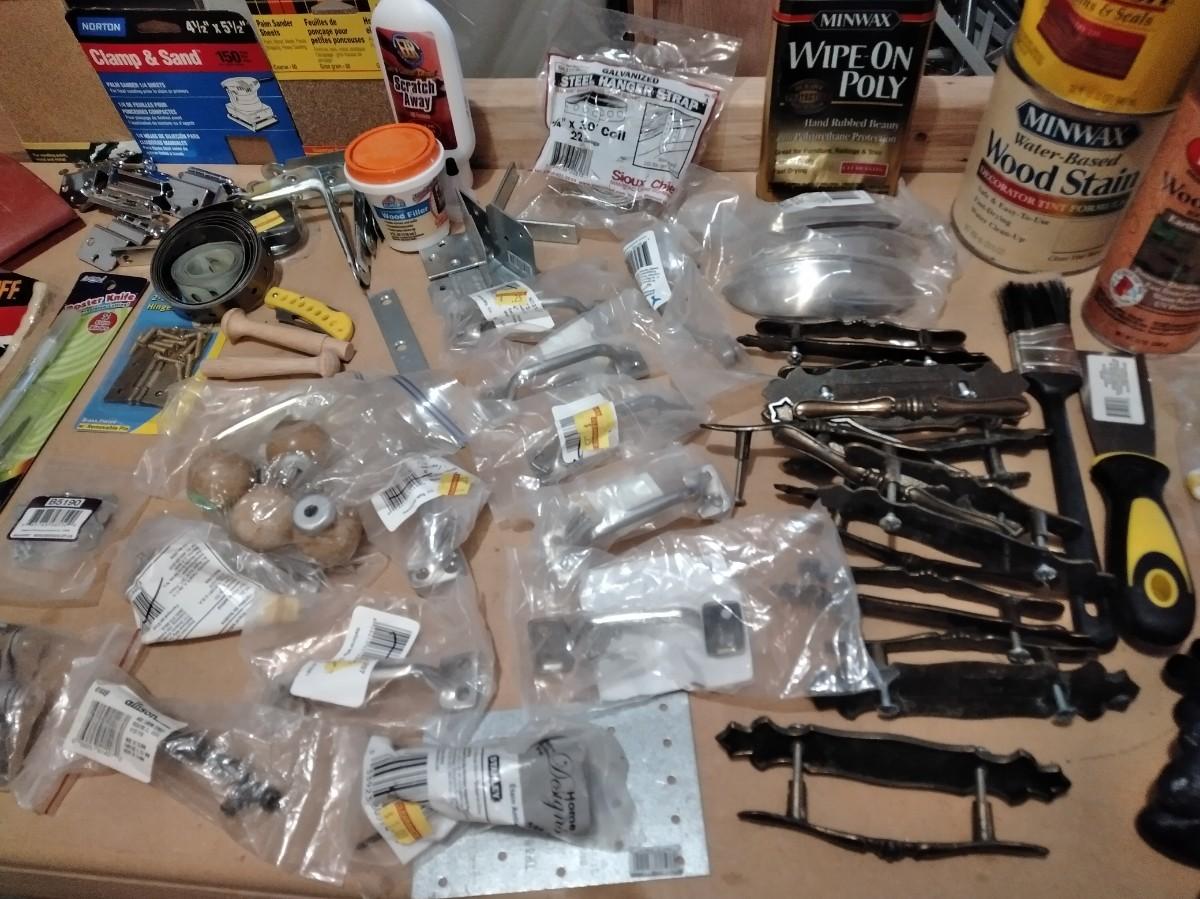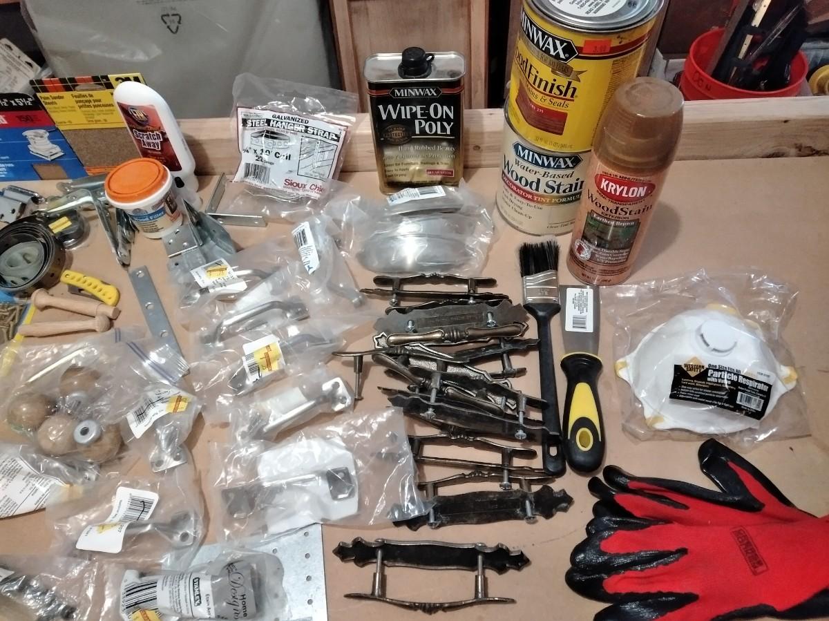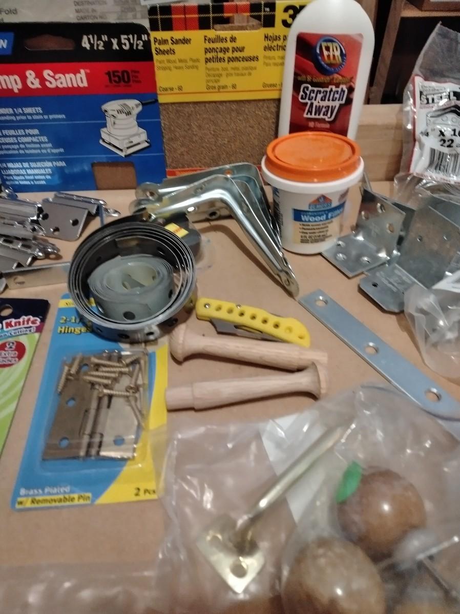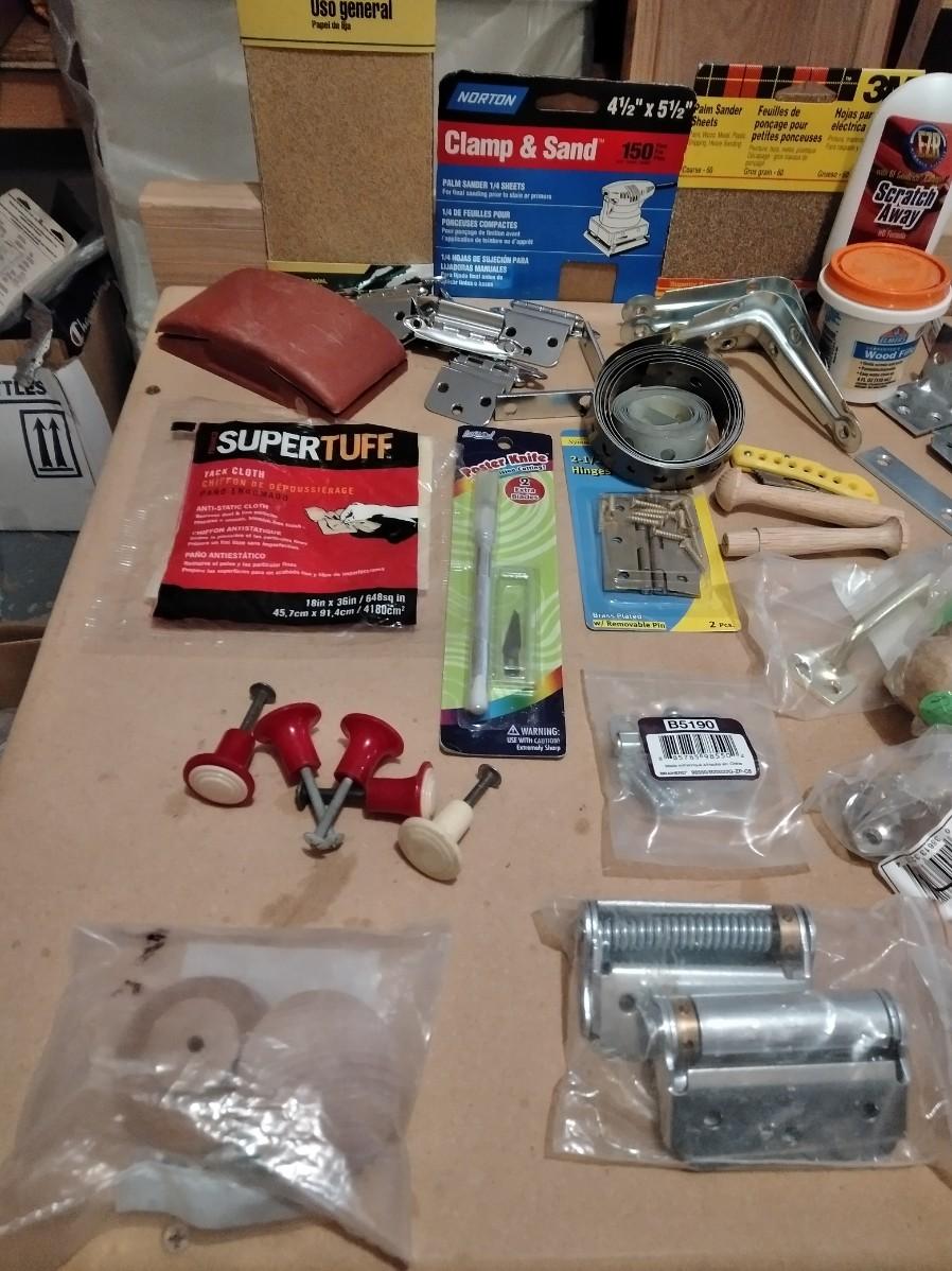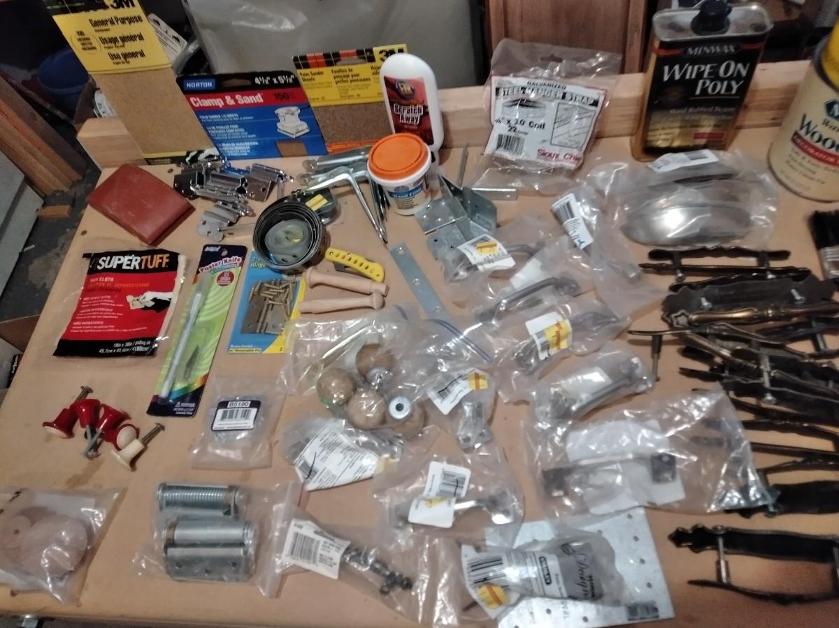 FURNITURE REFINISHING ITEMS, DRAWER HANDLES, HINGES, WOODEN PEGS, SANDPAPER, STAIN, AND MUCH MORE