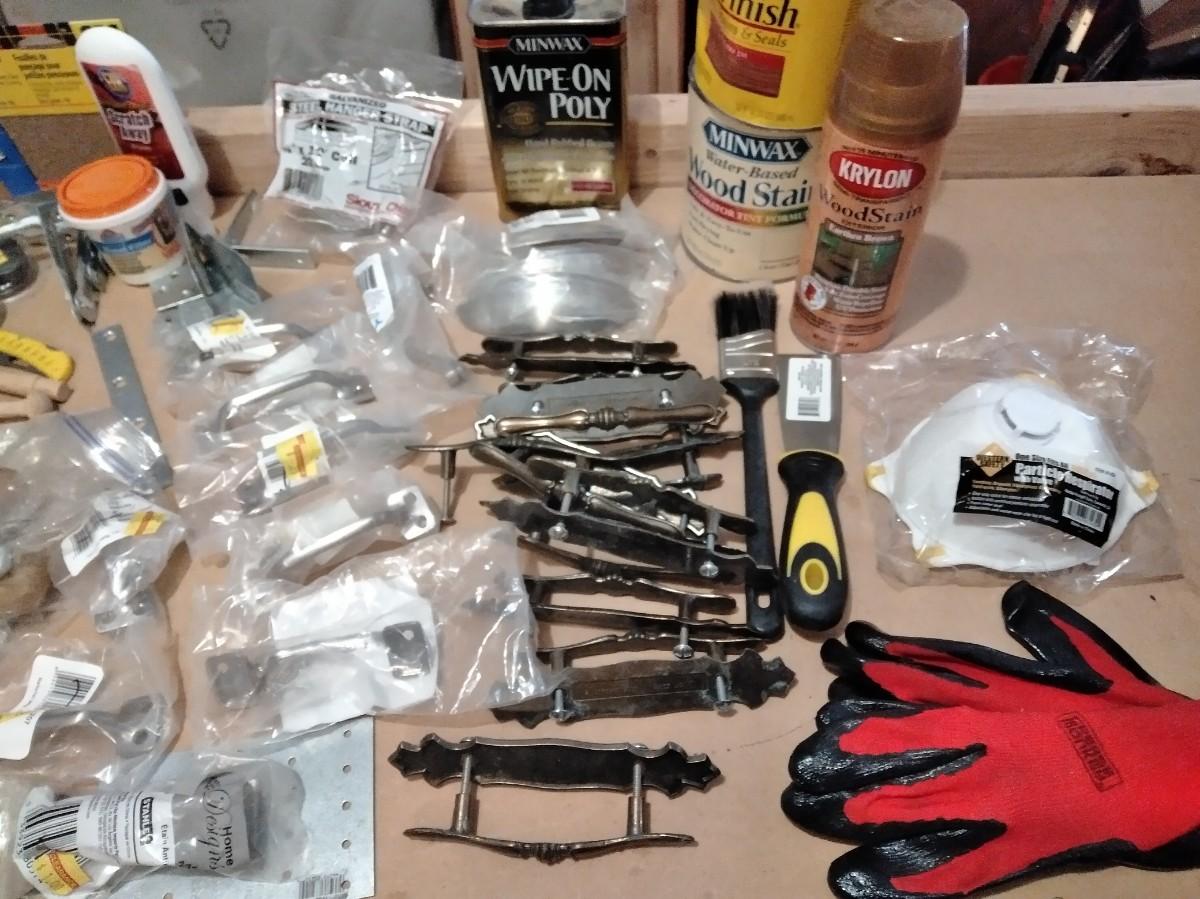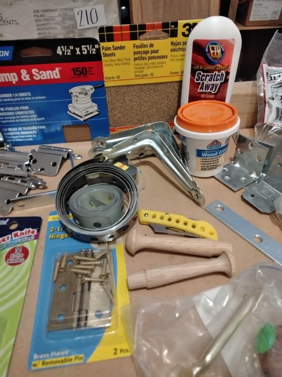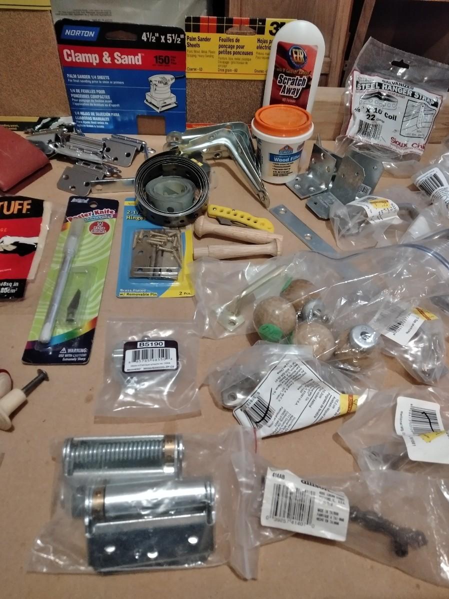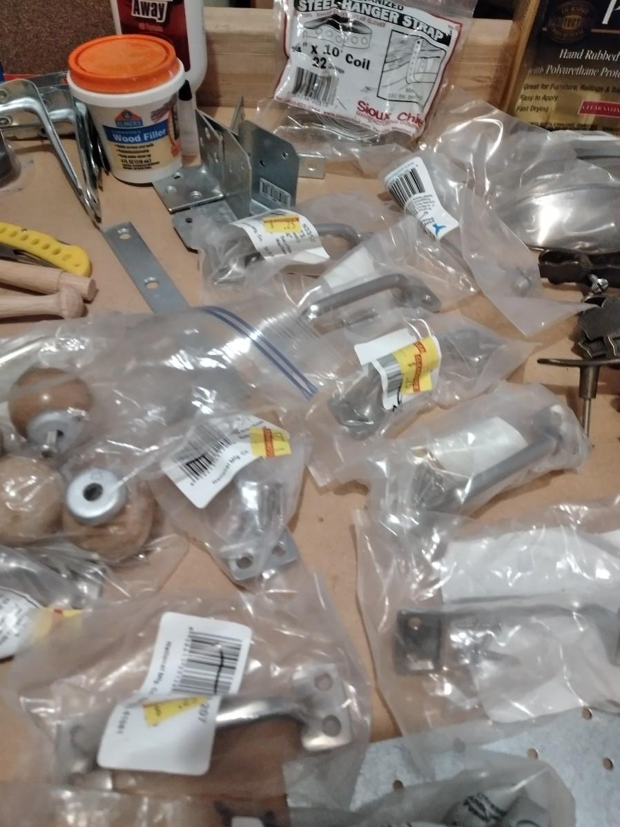FURNITURE REFINISHING ITEMS, DRAWER HANDLES, HINGES, WOODEN PEGS, SANDPAPER, STAIN, AND MUCH MORE