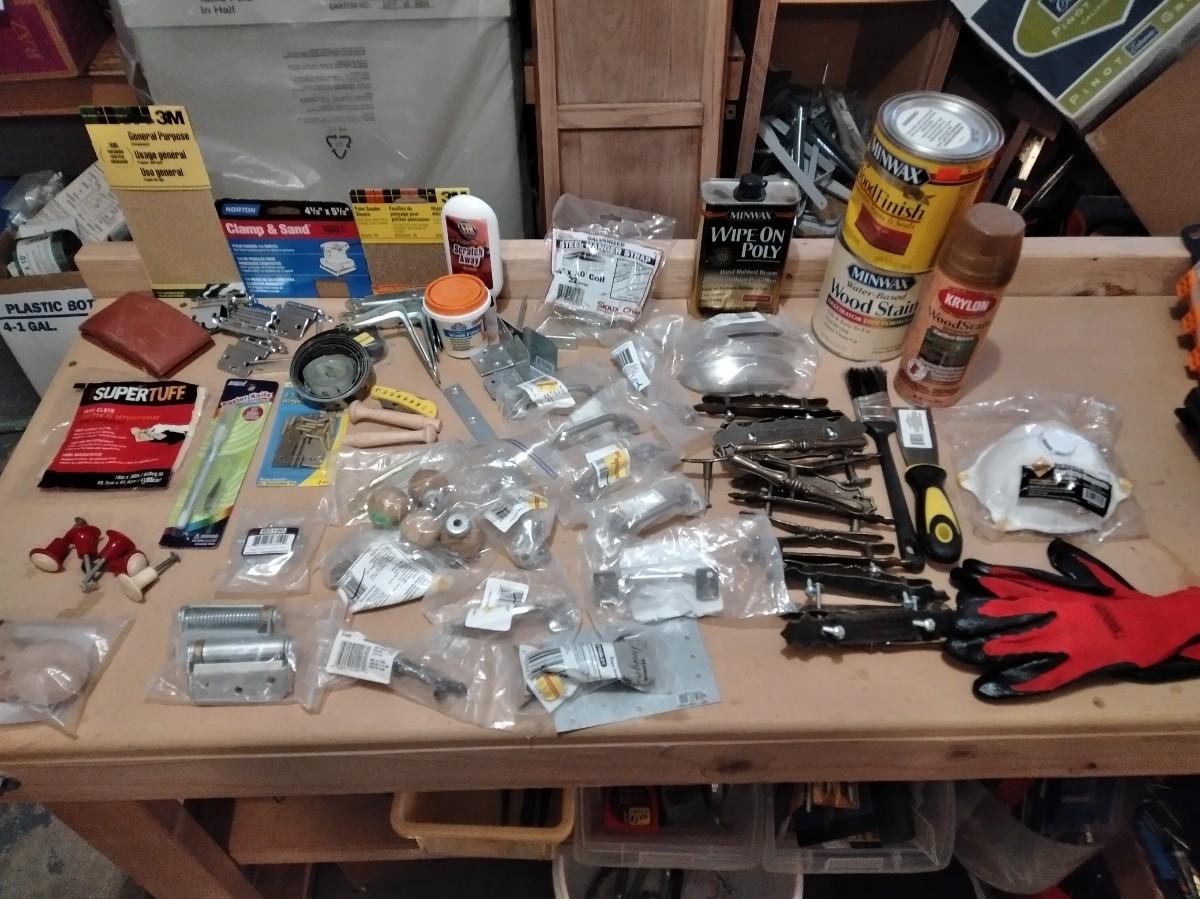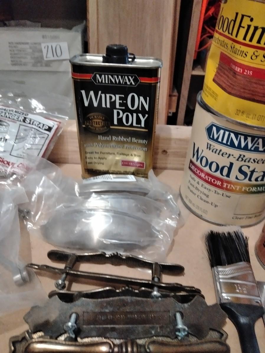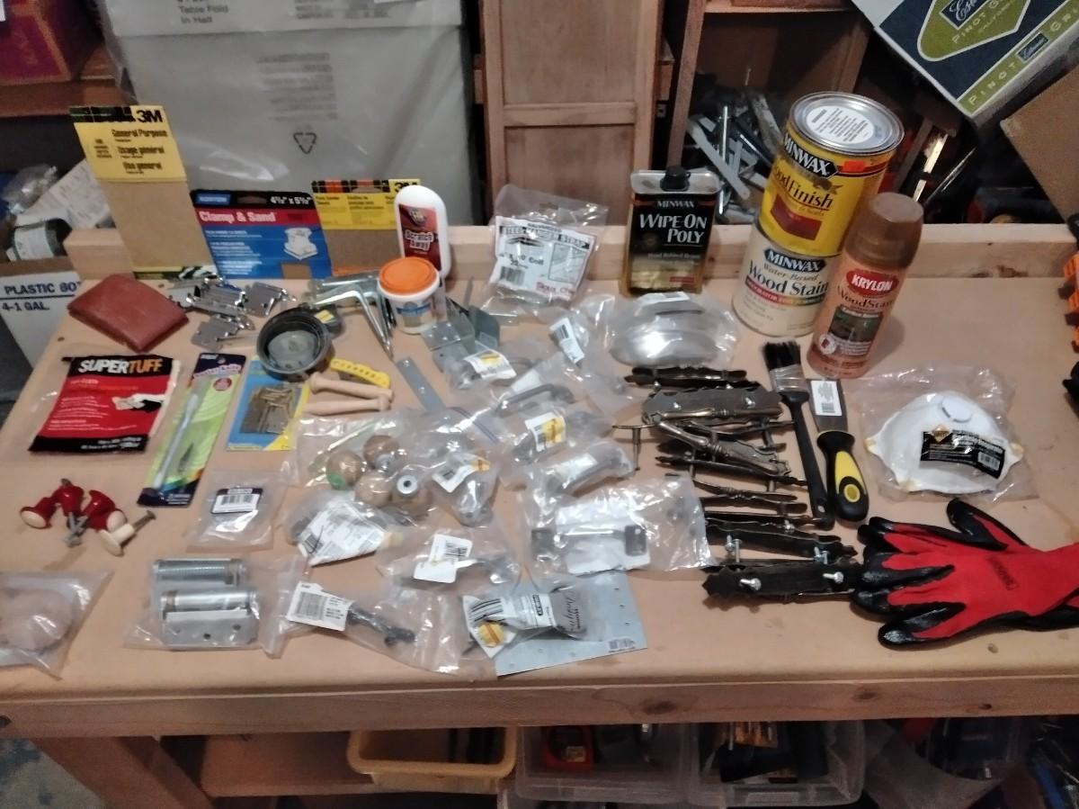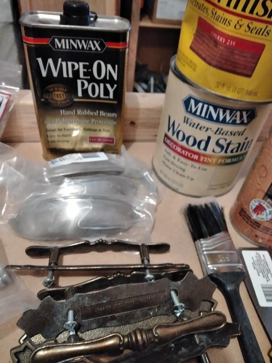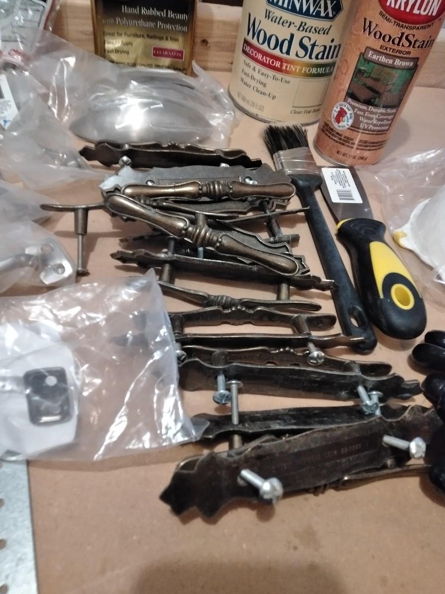 FURNITURE REFINISHING ITEMS, DRAWER HANDLES, HINGES, WOODEN PEGS, SANDPAPER, STAIN, AND MUCH MORE
