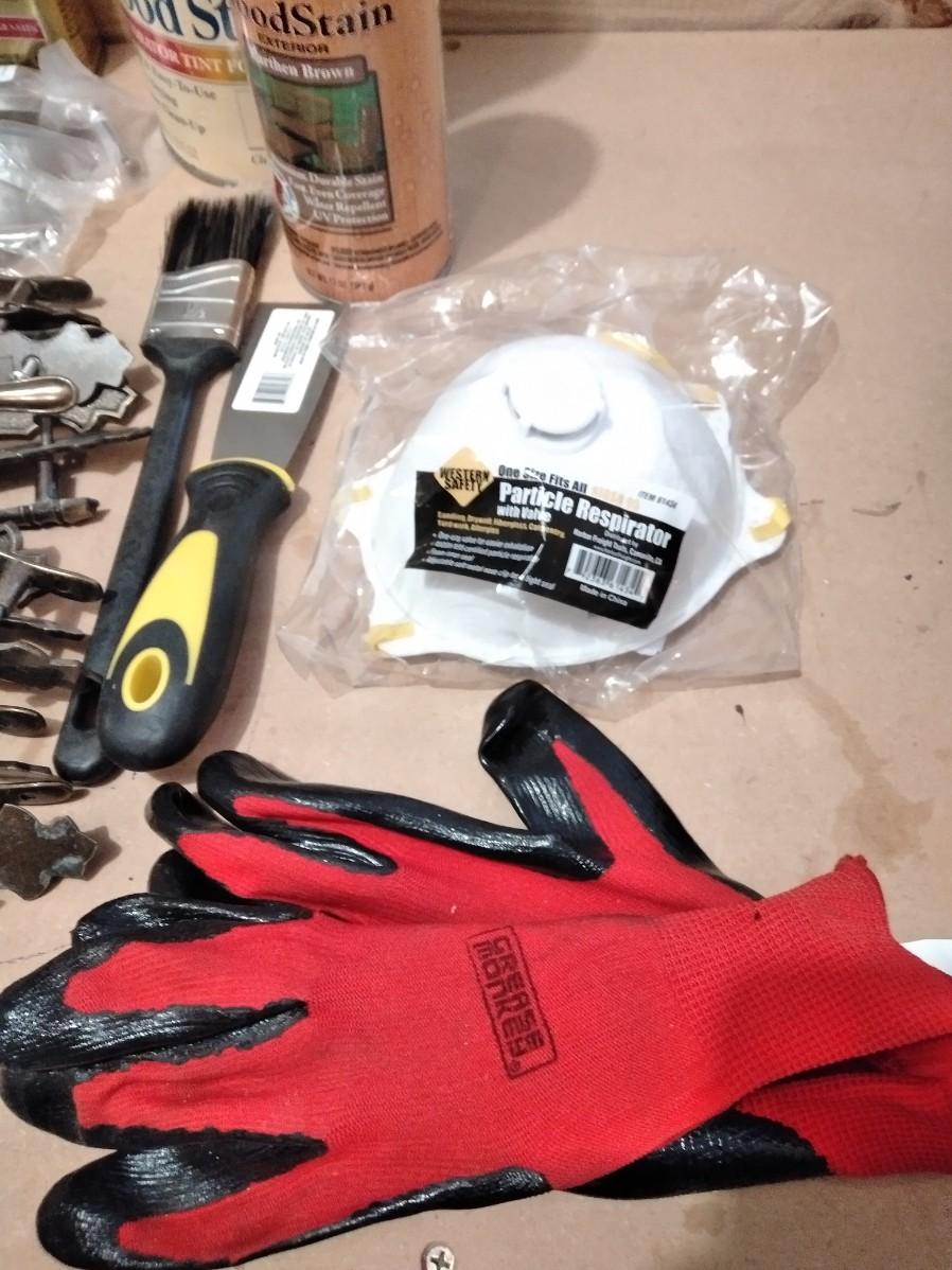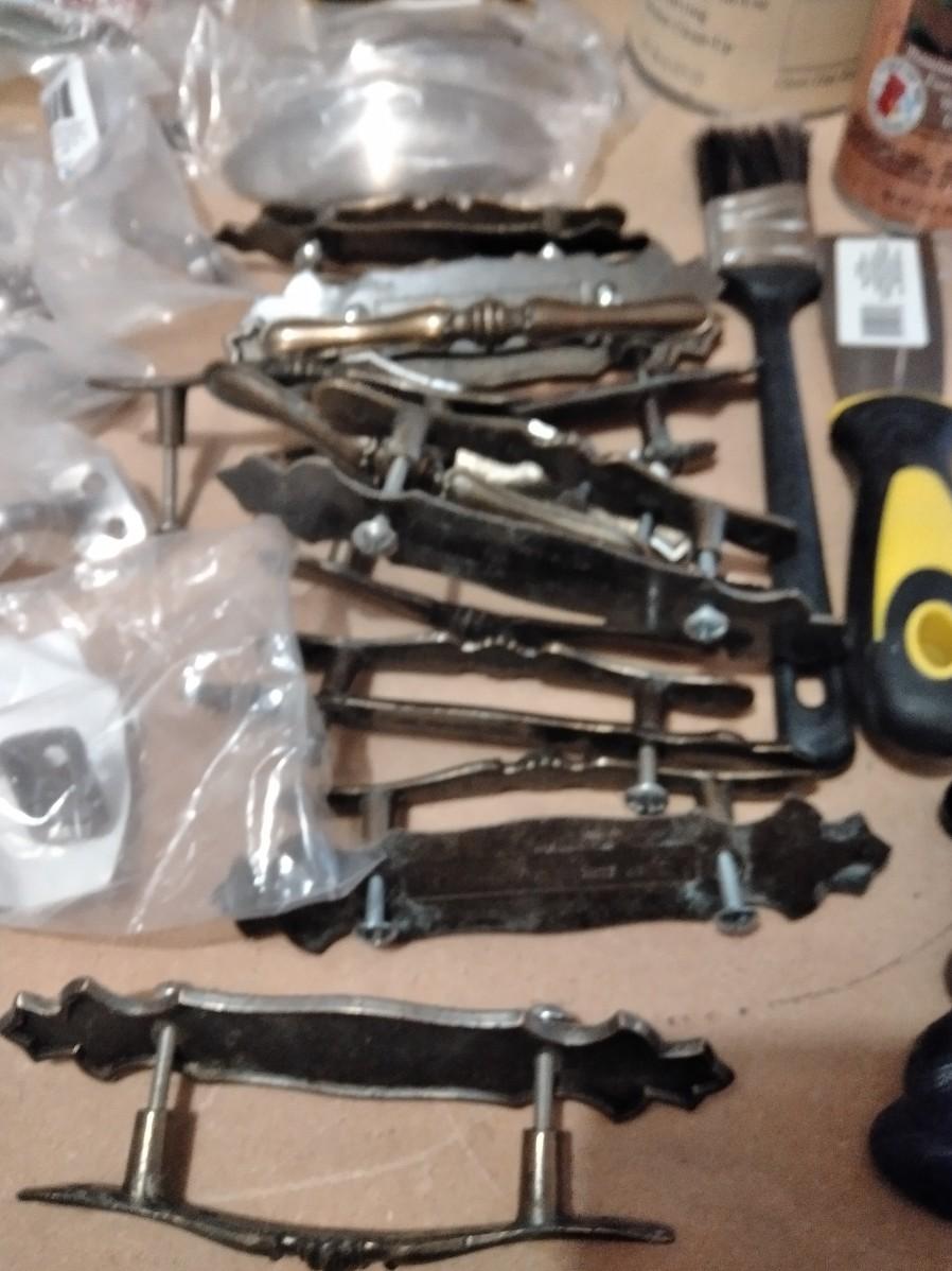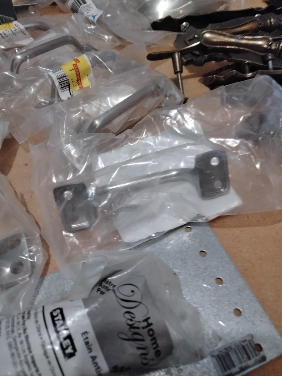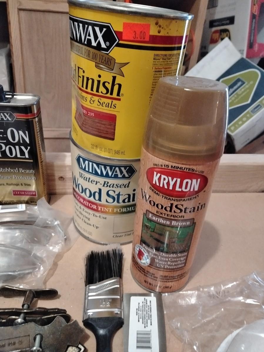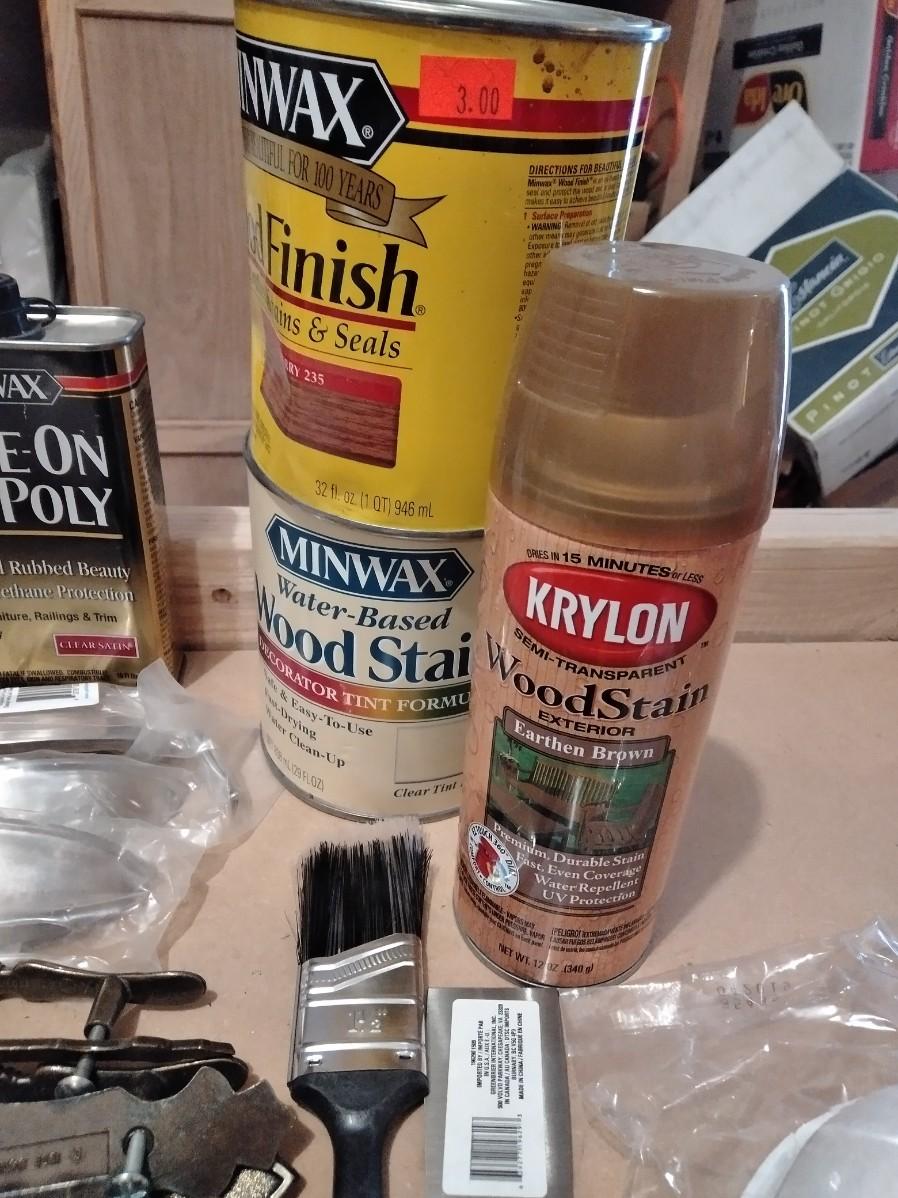 FURNITURE REFINISHING ITEMS, DRAWER HANDLES, HINGES, WOODEN PEGS, SANDPAPER, STAIN, AND MUCH MORE