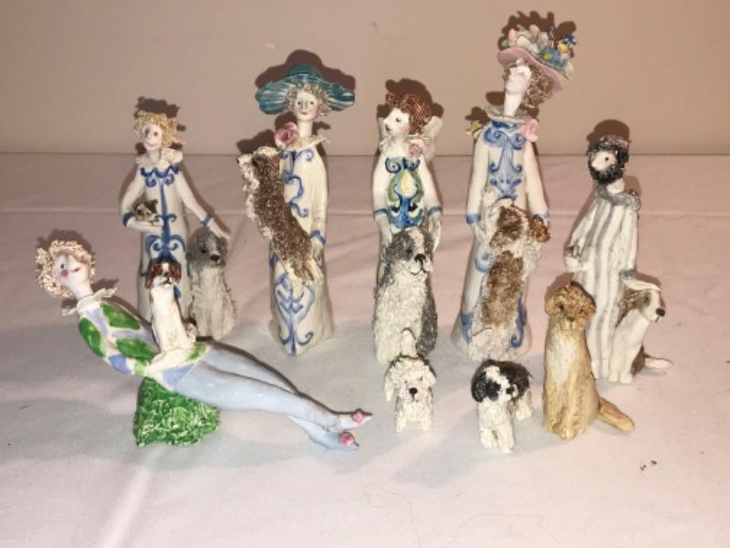 Six figures and 3 dogs hand painted ceramic. All pieces are signed JSP