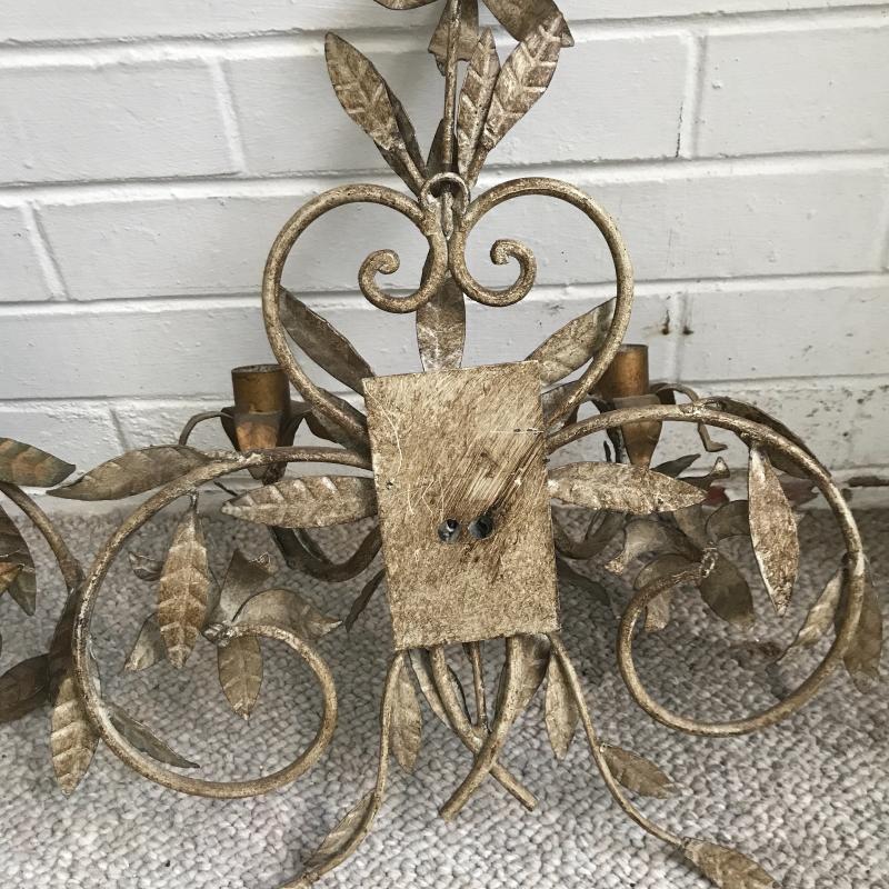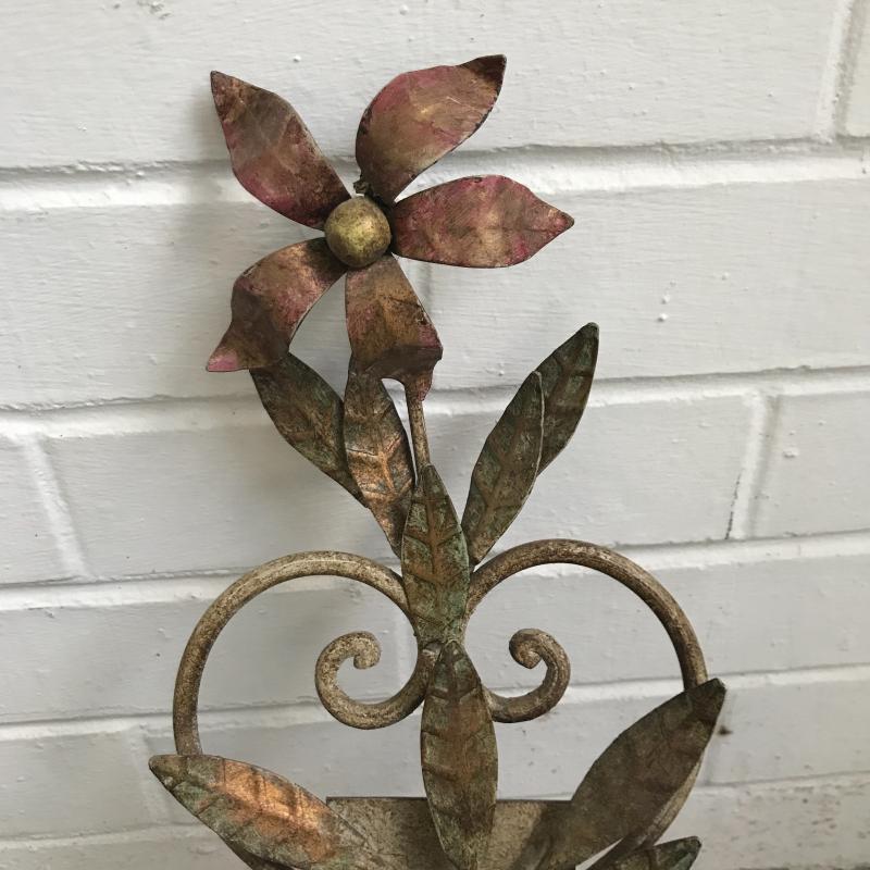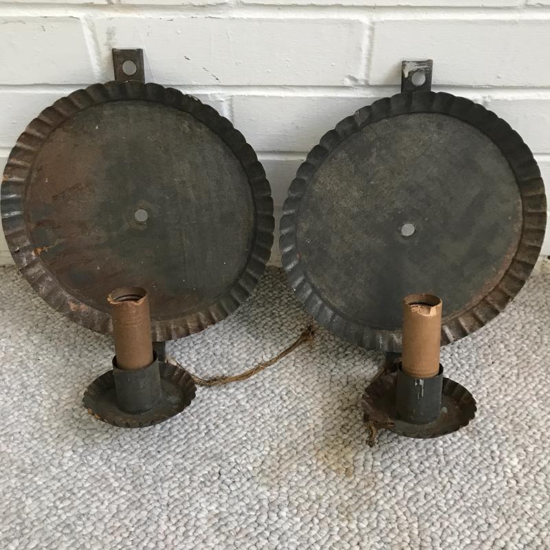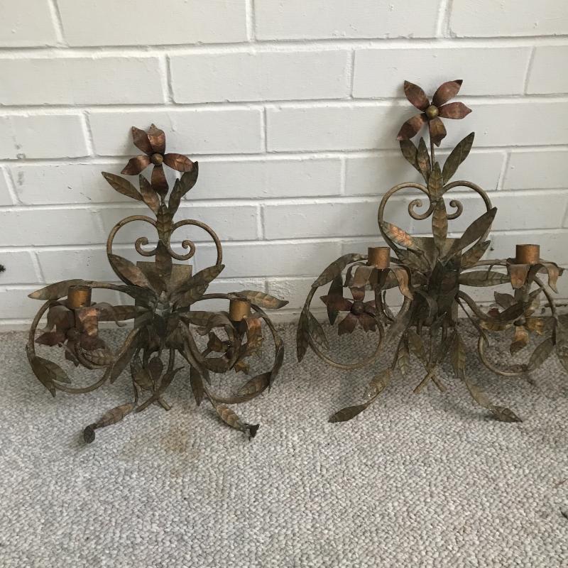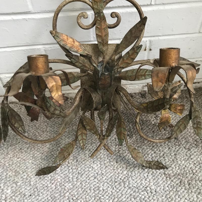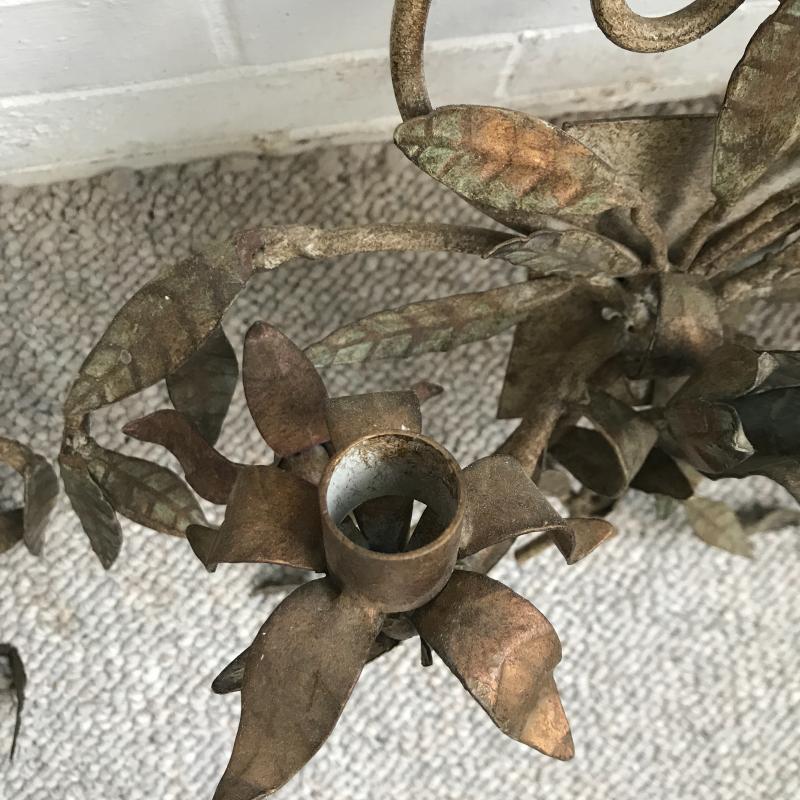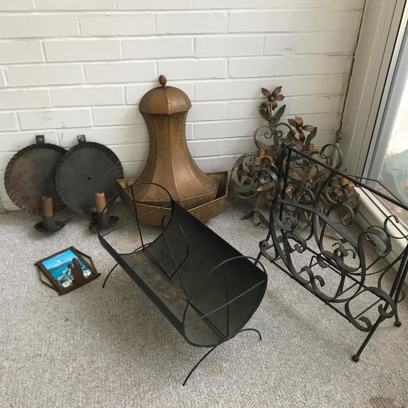 Metal wall candleholders, tin wall piece made in France and more. French piece seems to be a planter or a bird bath or could be made into a fountain. Pair of floral candle holders measure approximately 16” x 13”. Pair of metal lights would need to be rewired. Lot also includes two metal magazine racks, one could even be used for wood. No shipping.