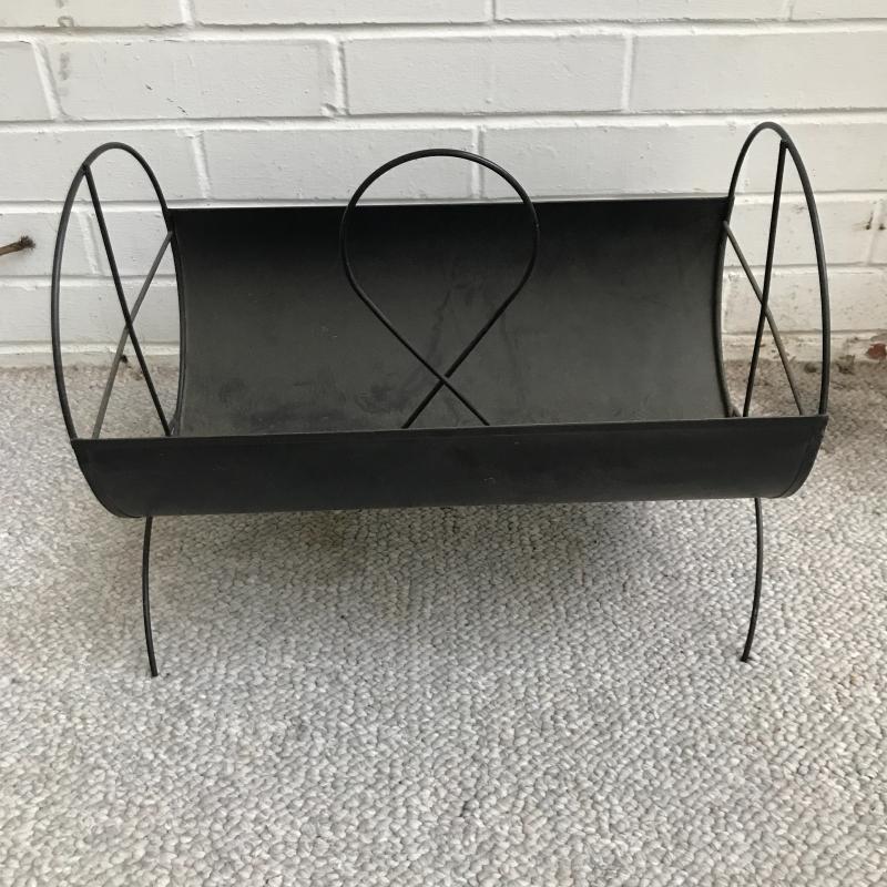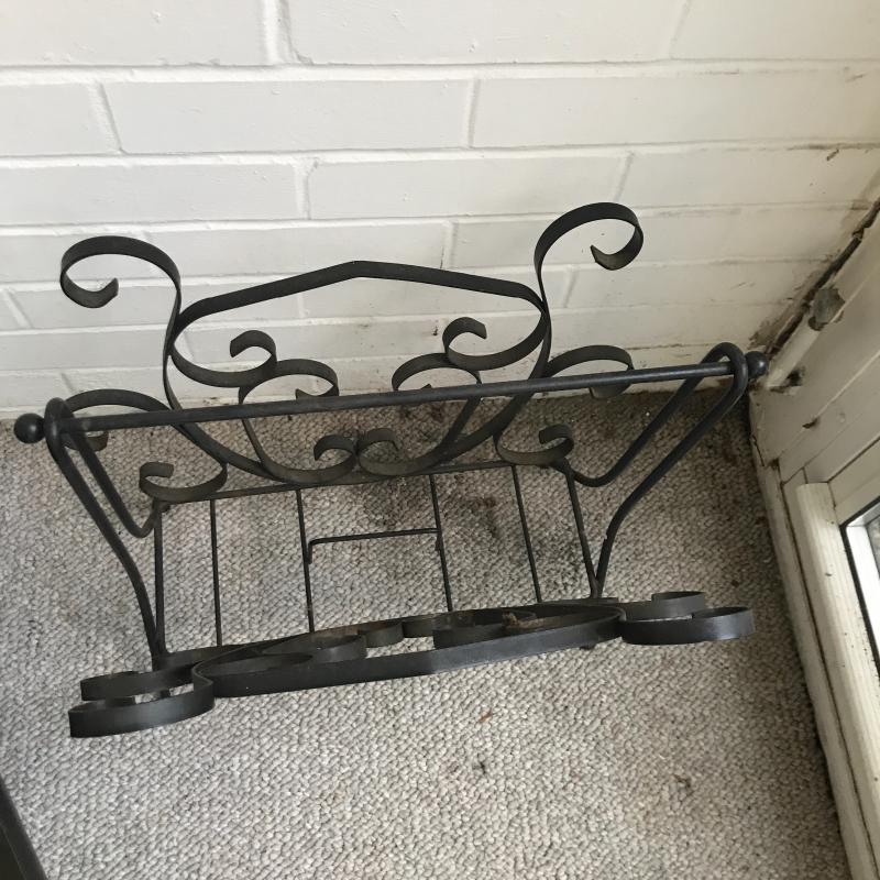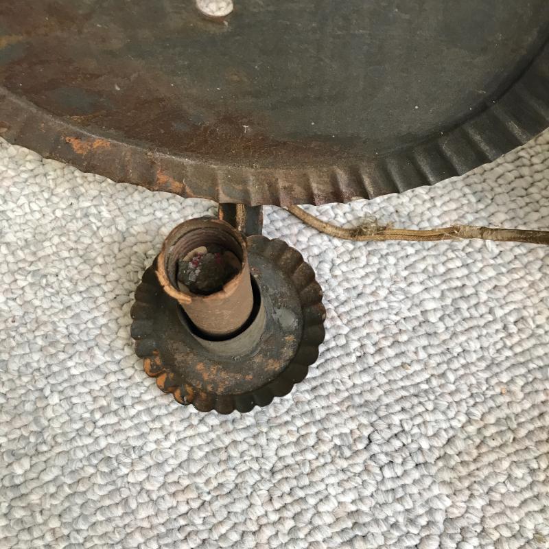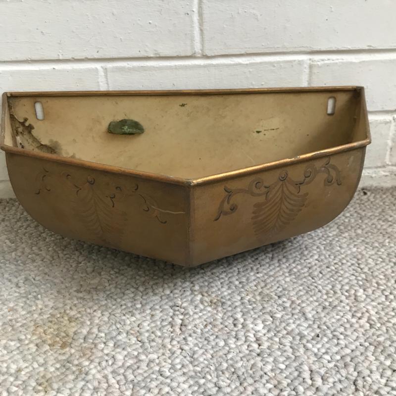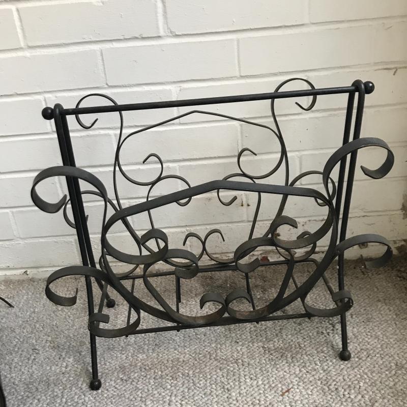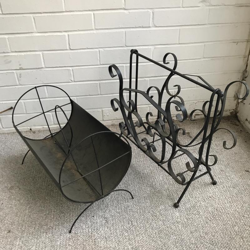 Metal wall candleholders, tin wall piece made in France and more. French piece seems to be a planter or a bird bath or could be made into a fountain. Pair of floral candle holders measure approximately 16” x 13”. Pair of metal lights would need to be rewired. Lot also includes two metal magazine racks, one could even be used for wood. No shipping.