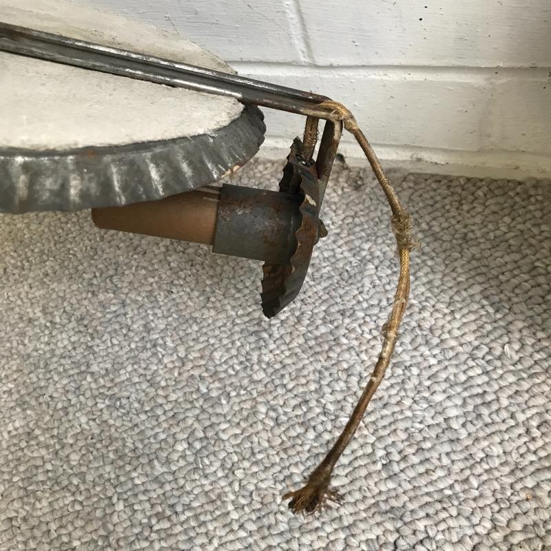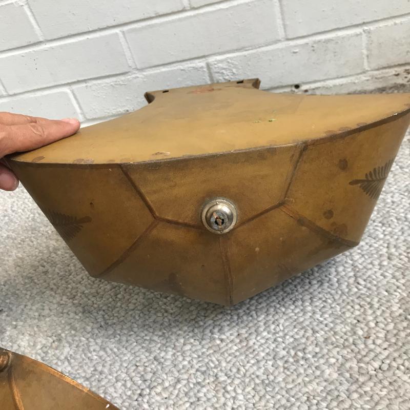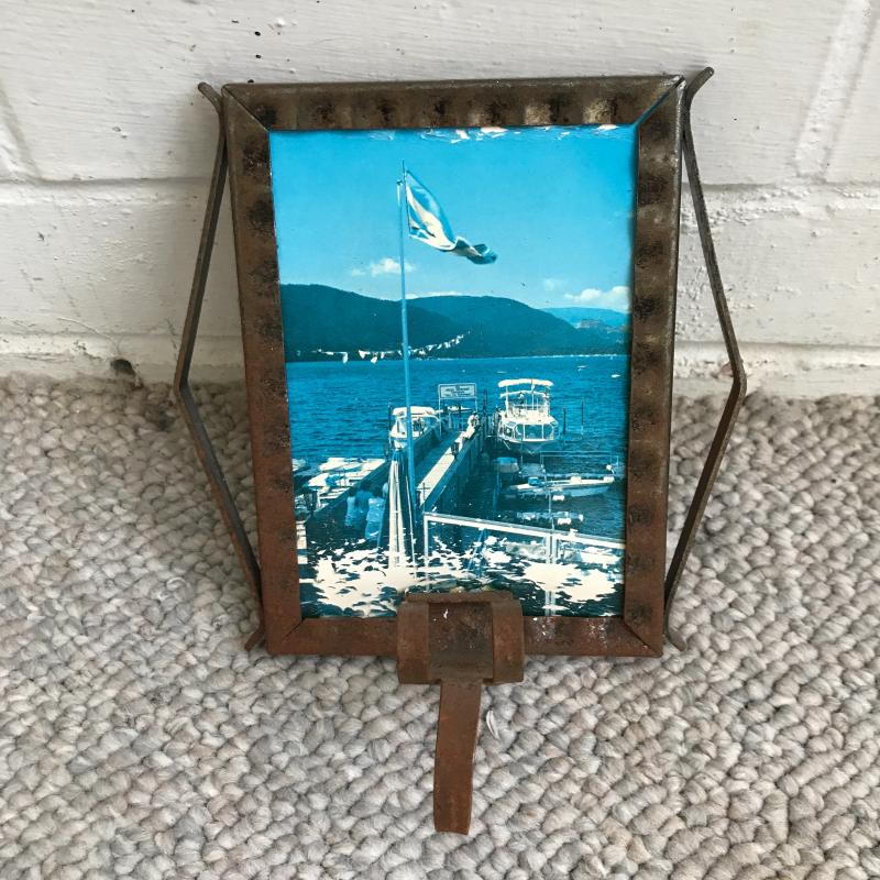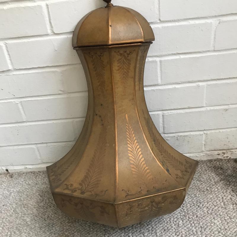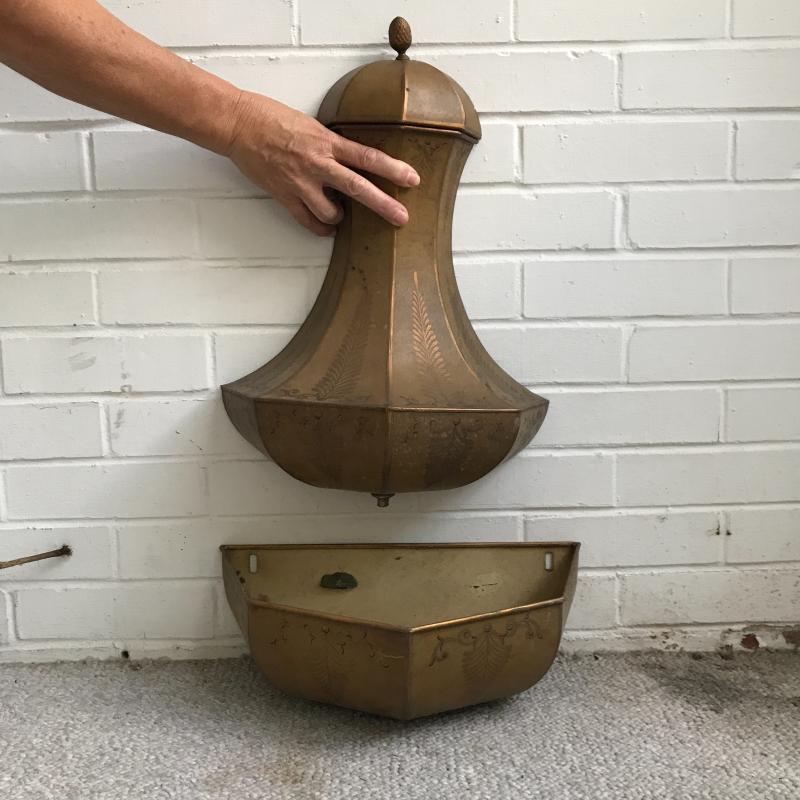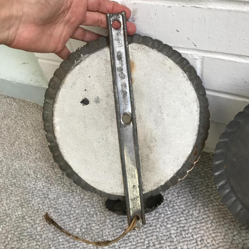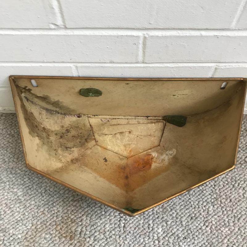 Metal wall candleholders, tin wall piece made in France and more. French piece seems to be a planter or a bird bath or could be made into a fountain. Pair of floral candle holders measure approximately 16” x 13”. Pair of metal lights would need to be rewired. Lot also includes two metal magazine racks, one could even be used for wood. No shipping.