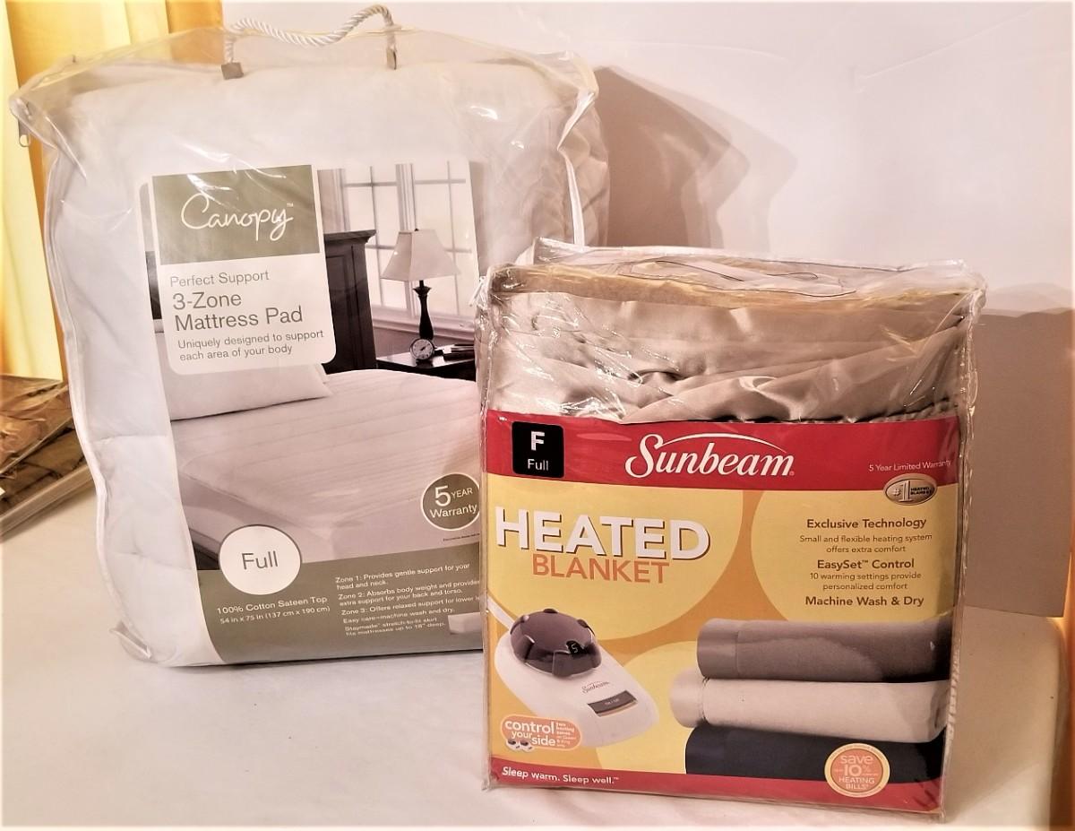 New in package - never used - full/double heated blanket (Sunbeam - 12 settings - Washable) and a deluxe mattress cover. Winter is almost here!