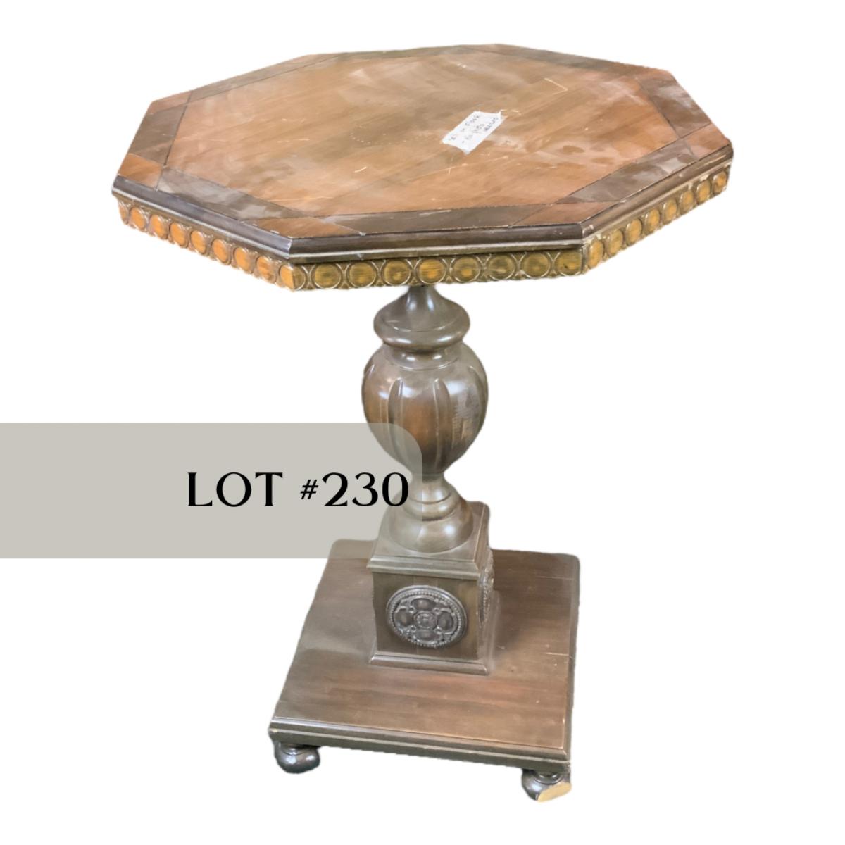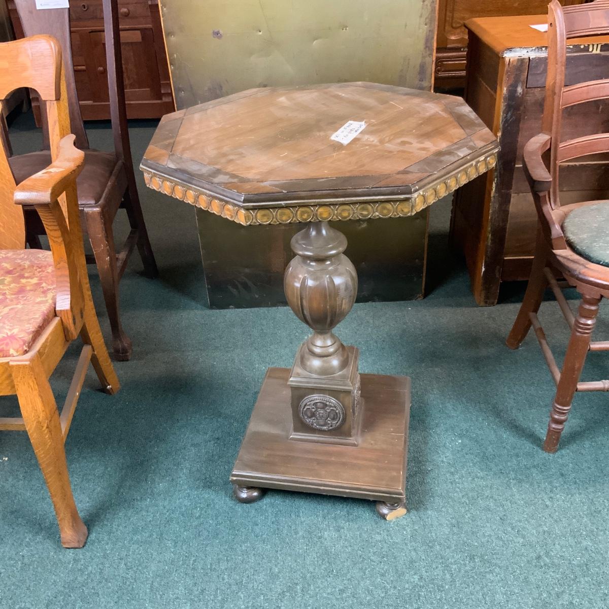 Octagon pedestal table. Needs to be stabilized and cleaned up this piece has great bones. //::\\ Please see photos for details and condition. No attempt has been made to hide any imperfections. All items listed in this auction are warehouse items, and need to be cleaned. A majority of the items need restoration as well. All items are sold AS IS and WITHOUT GUARANTEE. If you are uncertain about an item, DO NOT BID. Due to the nature of this online auction in-person inspection is HIGHLY recommended. All Sales are FINAL. Pick Up Times are FIRM. Please confirm with your own schedule that you can pick up in the scheduled times listed in the Terms and Conditions. Any questions please message the auctioneer. DO NOT Contact The Harp Gallery.