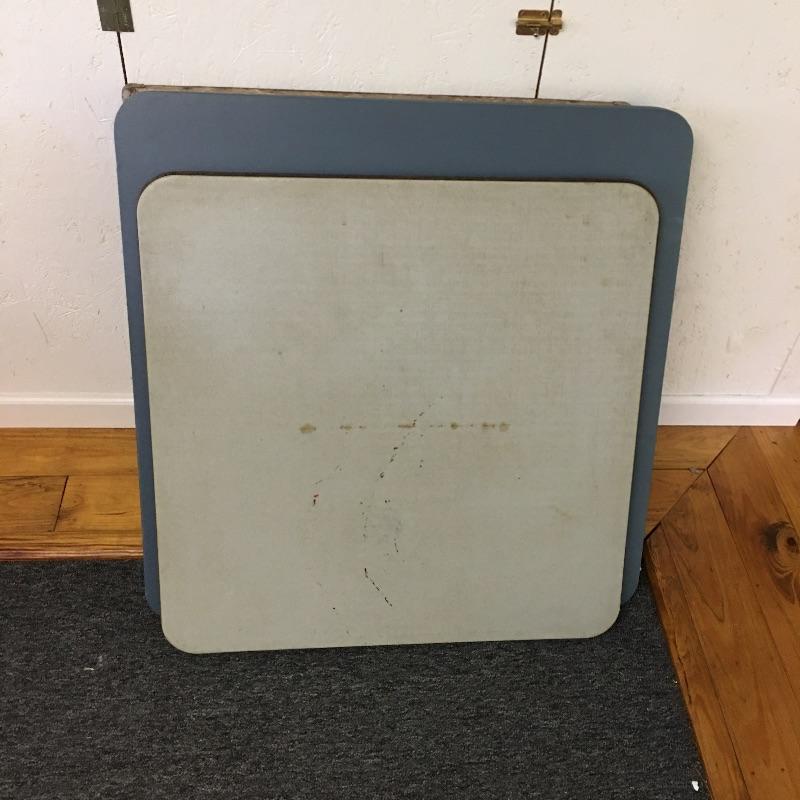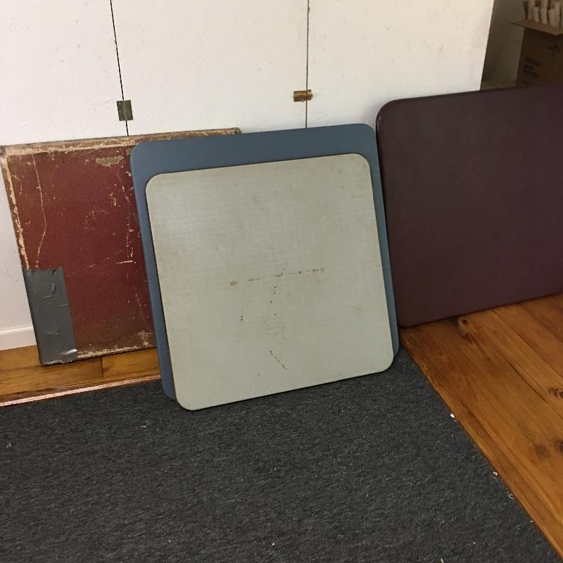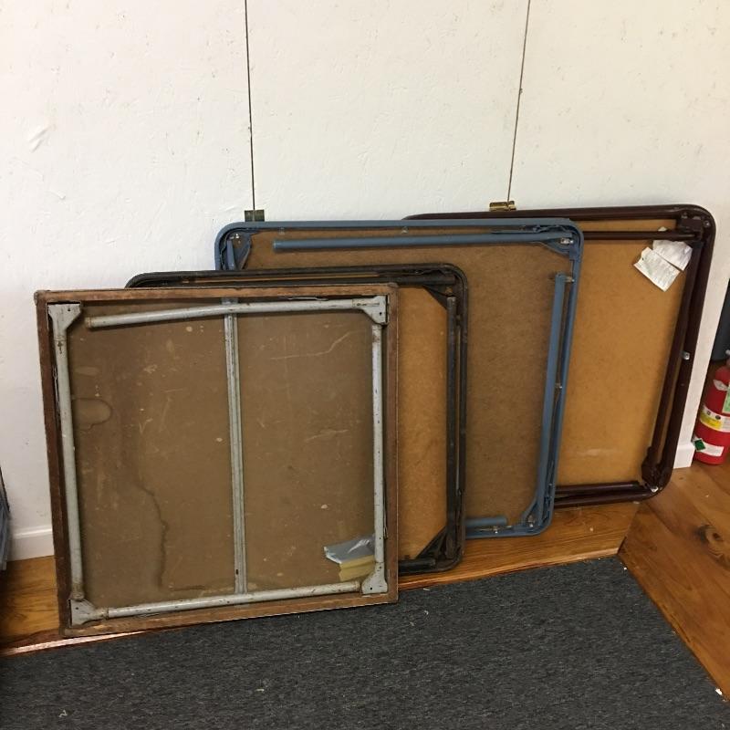 Quartet of card tables includes one vintage table and three newer tables. Two tables have marks on the top, see pictures. Largest table measures 33.5” x 33.5” x 28”. Tables are on second floor.