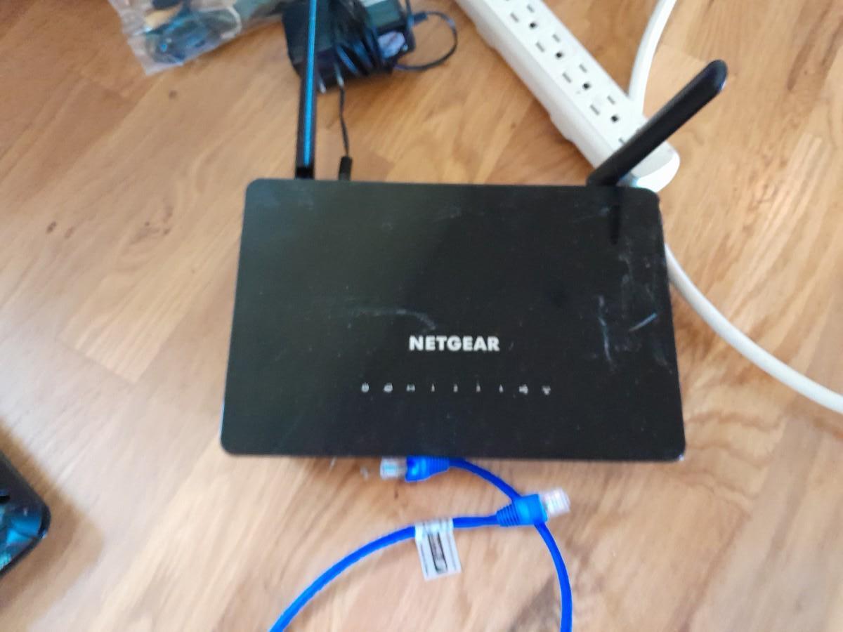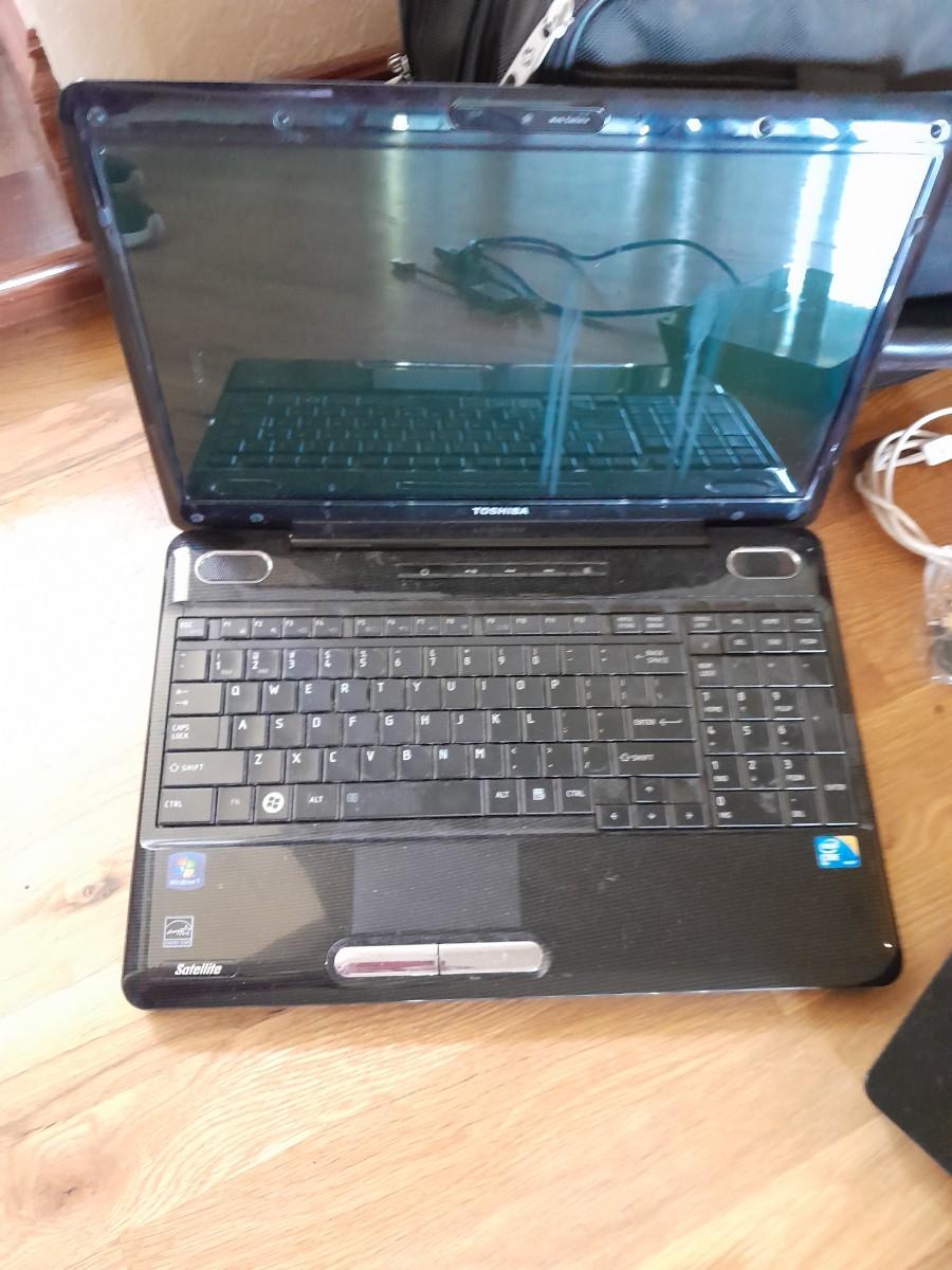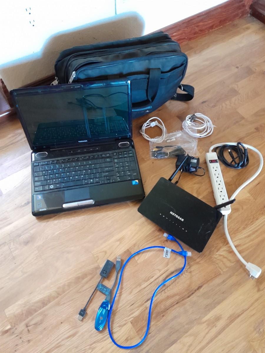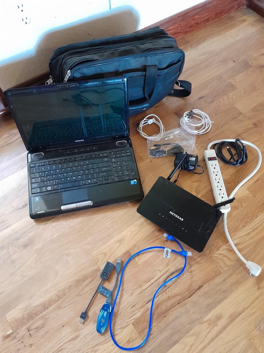 TOSHIBA LAPTOP (No power cords) AND A NETGEAR ROUTER WITH CORDS AND LAPTOP BAG.