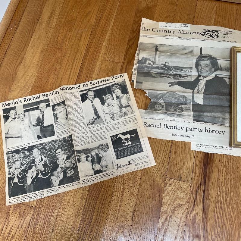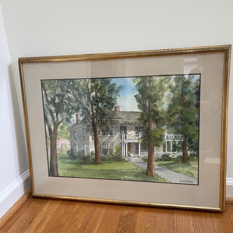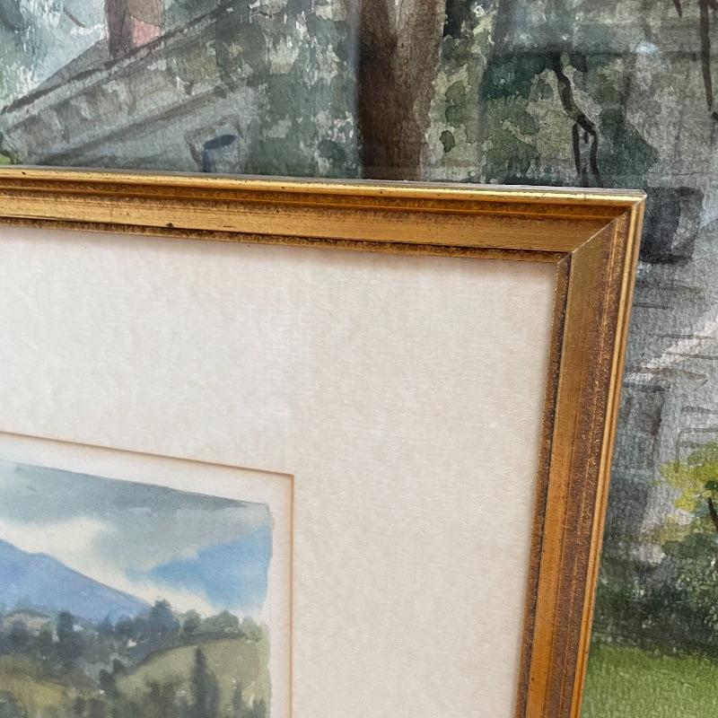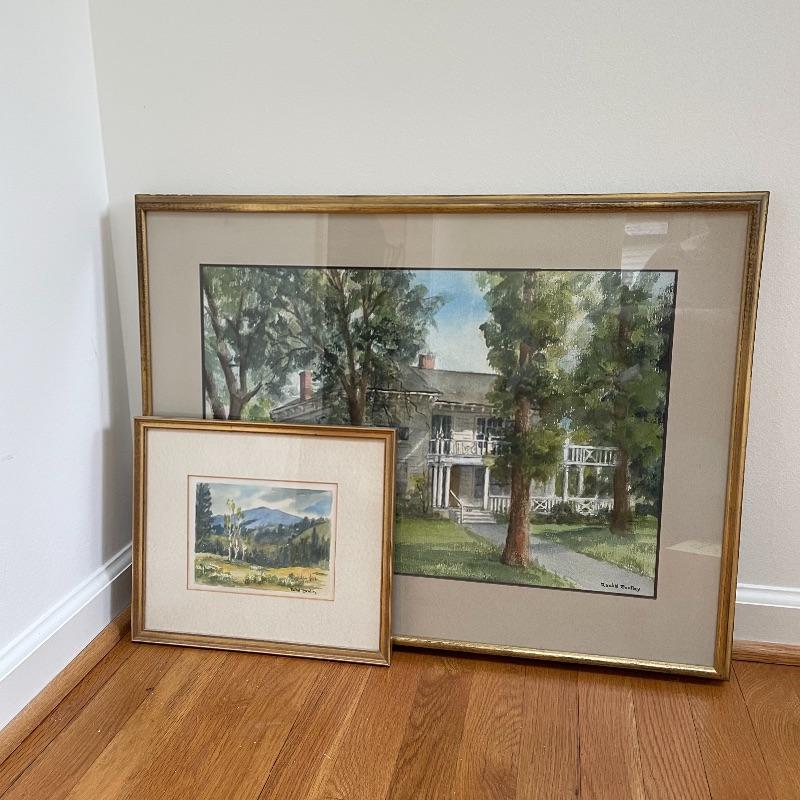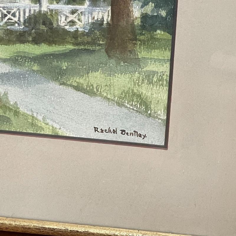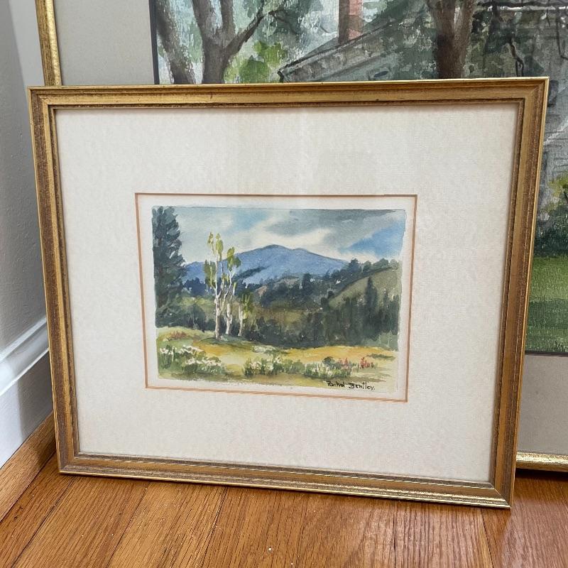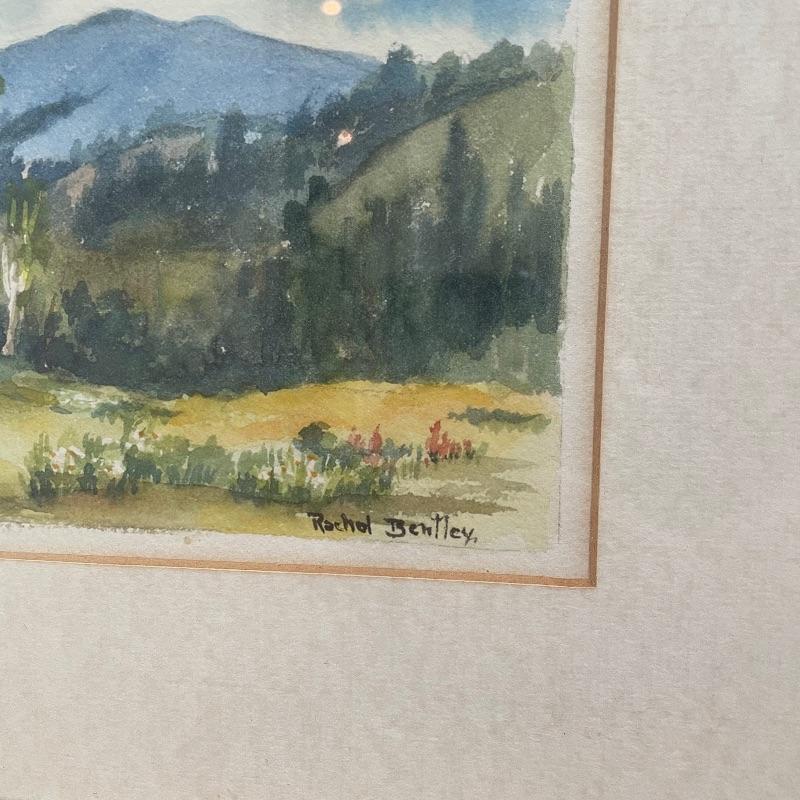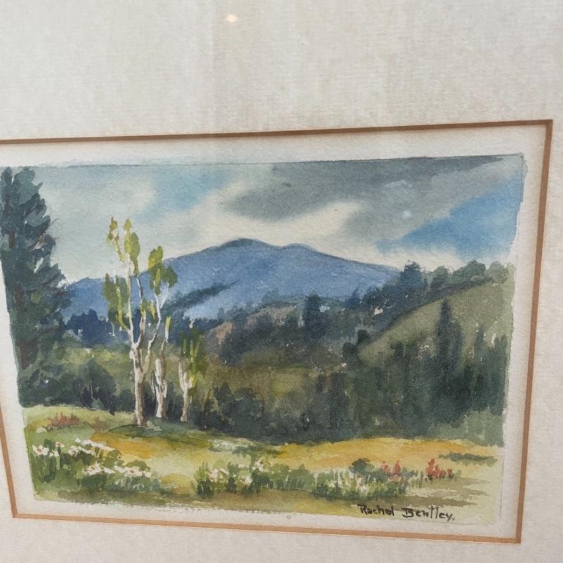 Two beautiful scenes by the beloved artist Rachel Bentley. The art comes with some 1985 newspaper clippings about her and a hand written note on the back of the smaller art says she painted it in her 80’s, about 40 or 50 years ago! Both are has lovely details in matting and behind glass. The larger of the two wooden frames measures approximately 27.5” x 21”. Shipping available. Please call UPS with dimensions at 828-252-6930 for a shipping quote prior to bidding.