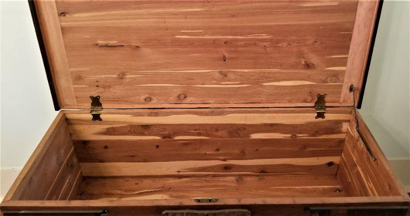 Vintage cedar chest - inside very clean. Interested carved decoration at the lock. No key. Made by the Roos Company of Park, IL. Small nick on the side. Hinged lid works fine. Piece is 25.5" tall, 45" long, and 19" deep.