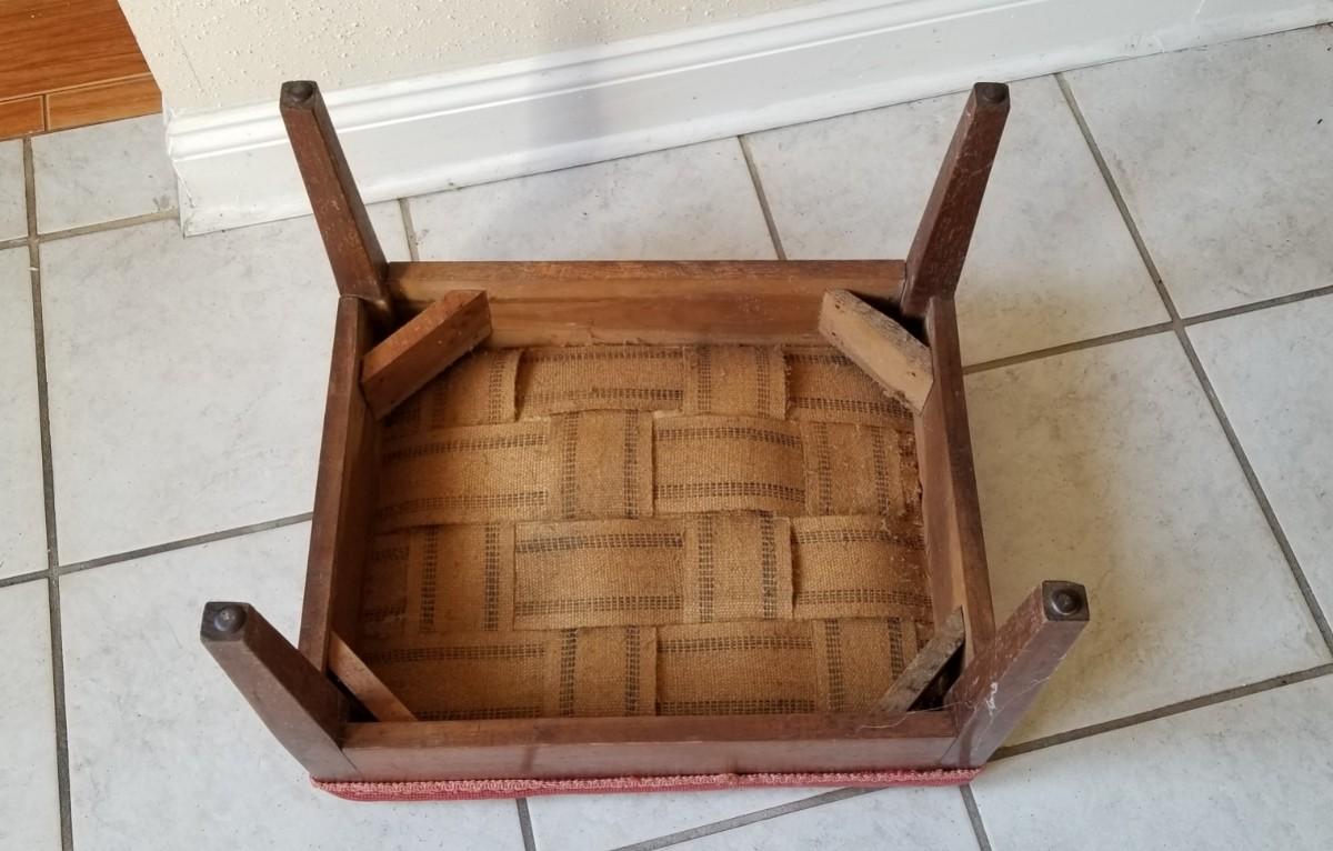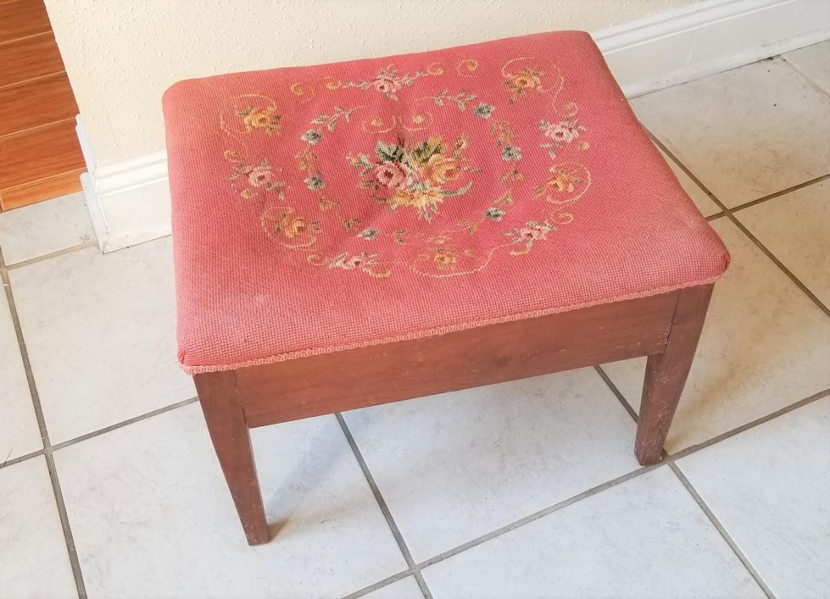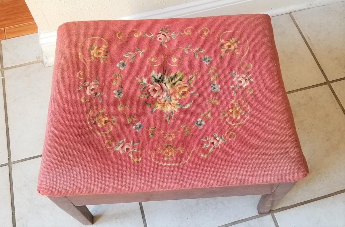 Pretty vintage needlepoint footstool. 20" x 16", 14" tall. Straps underneath need to be tightened up a bit - otherwise good.