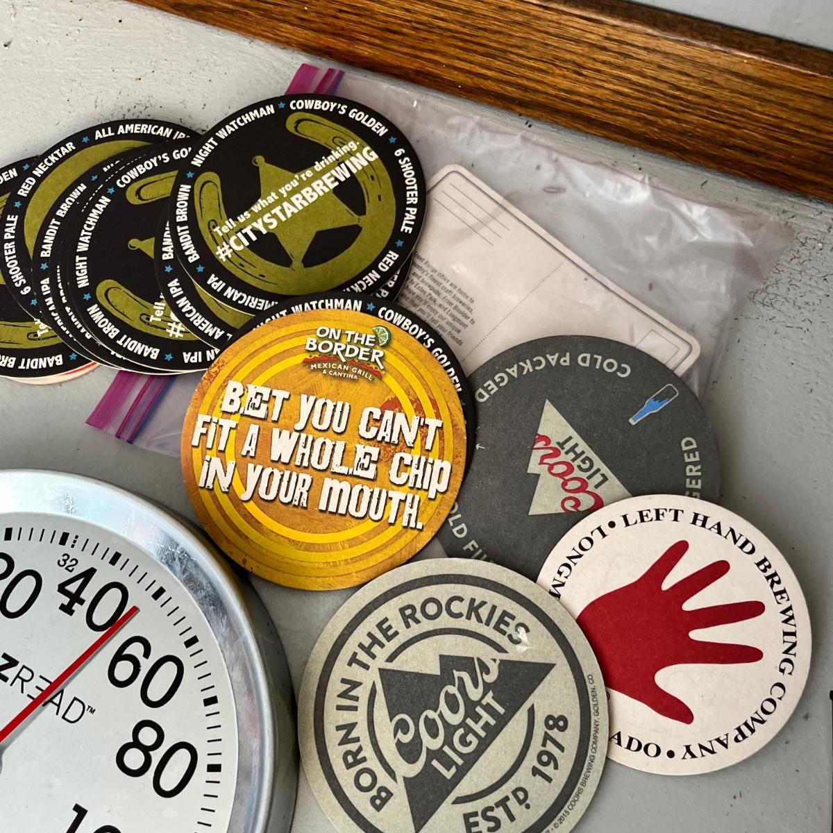Lot 231 Overdoor wreath hooks, Gambles rain gauge and Beer coasters