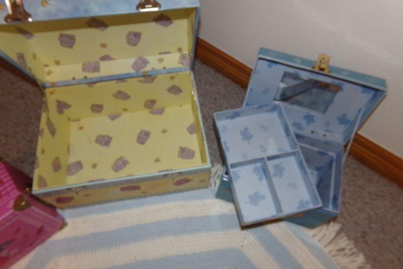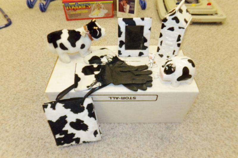 CHILD THEMED STORAGE BOXES AND COW PATTERNED CHILD'S PURSE, TOY COW, PICTURE FRAME ETC