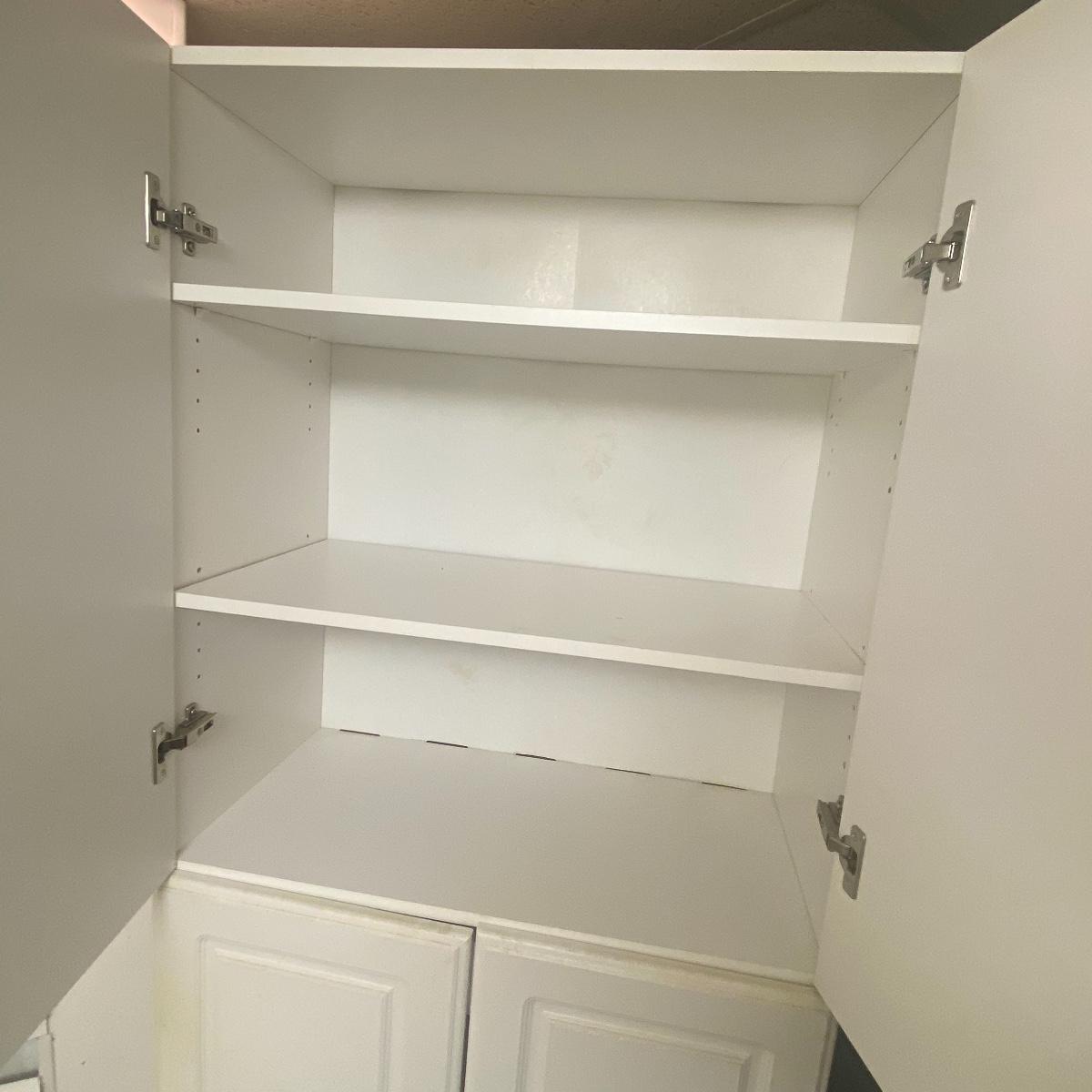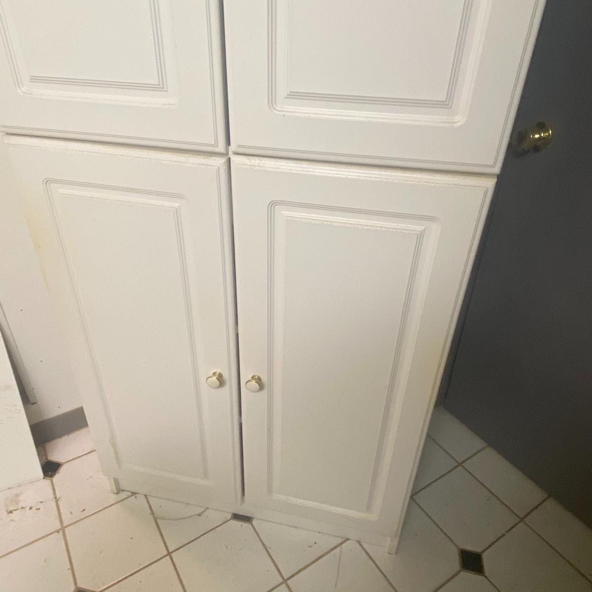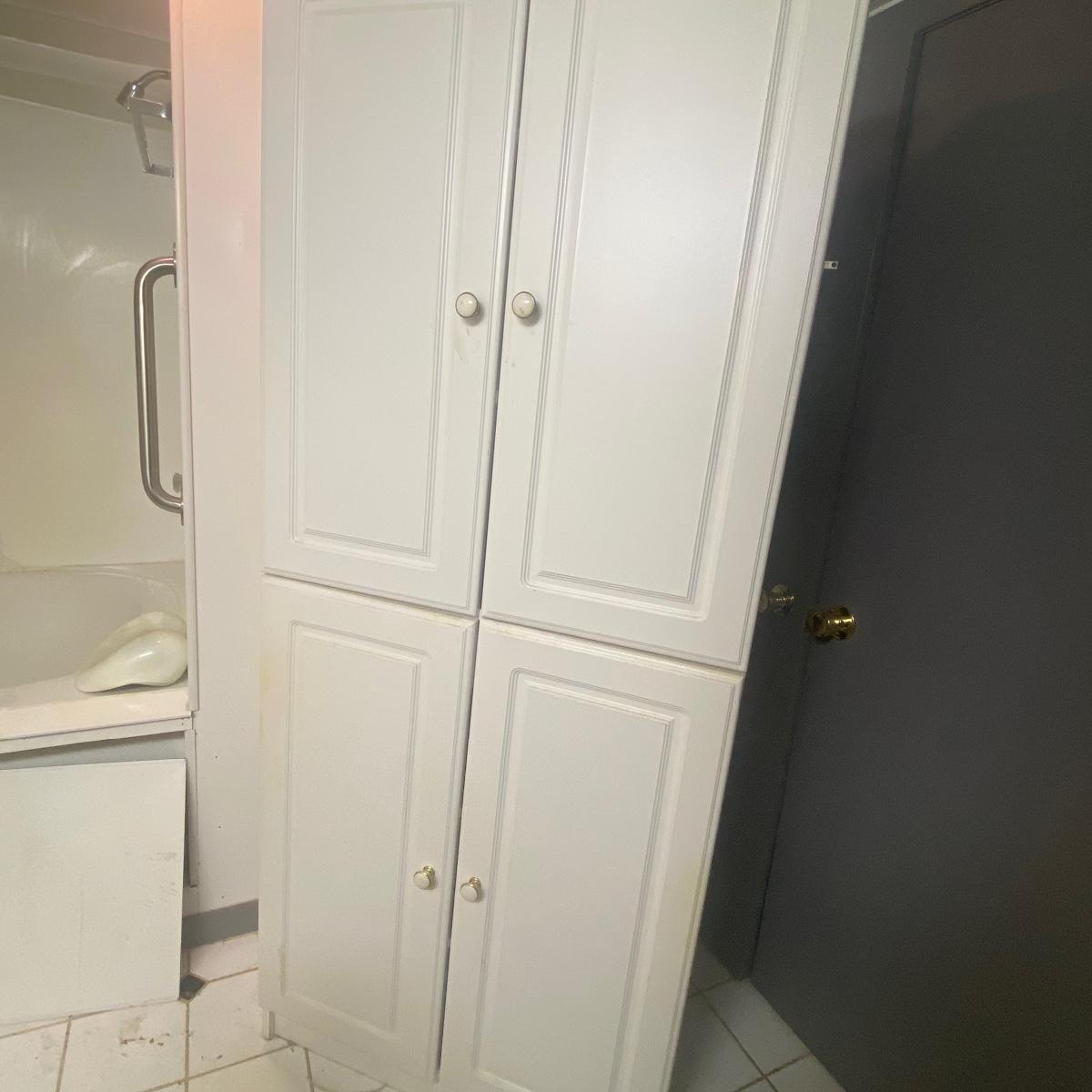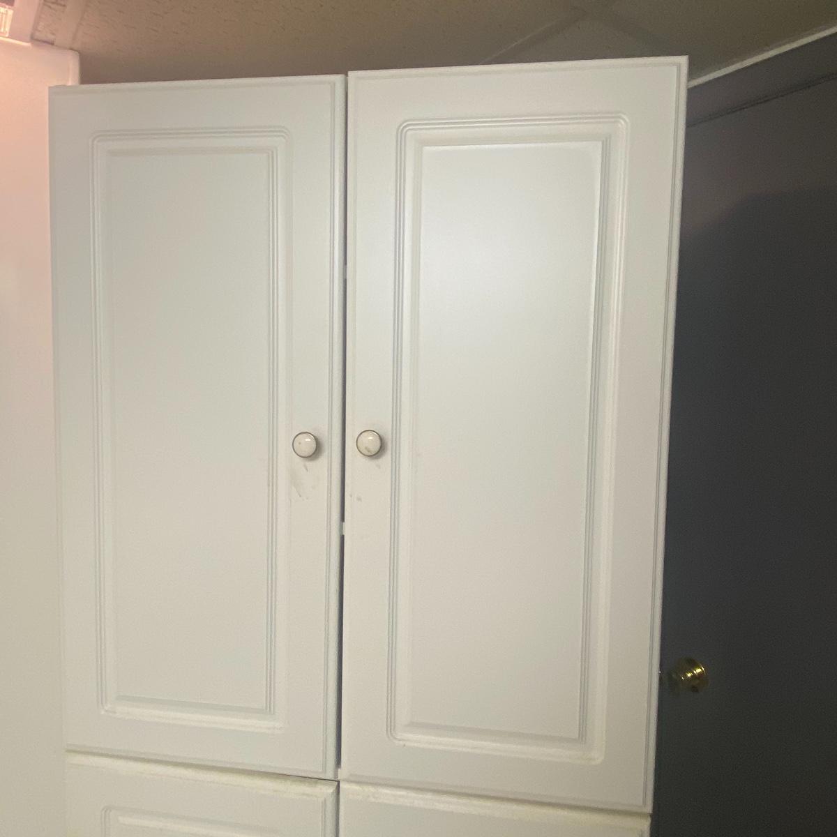 This lot is a large white pressed wood cabinet that is made up of two smaller cabinets stacked and attached to each other. First cabinet has doors that opens up to three open storage shelves, two of the shelves are adjustable. See photos. The second cabinet has doors that open up to a small drawer that pulls out and three shelves of storage Space, only one shelf on the bottom is adjustable. See photos. Entire unit measures 30”x15”x71”. Local pickup only.