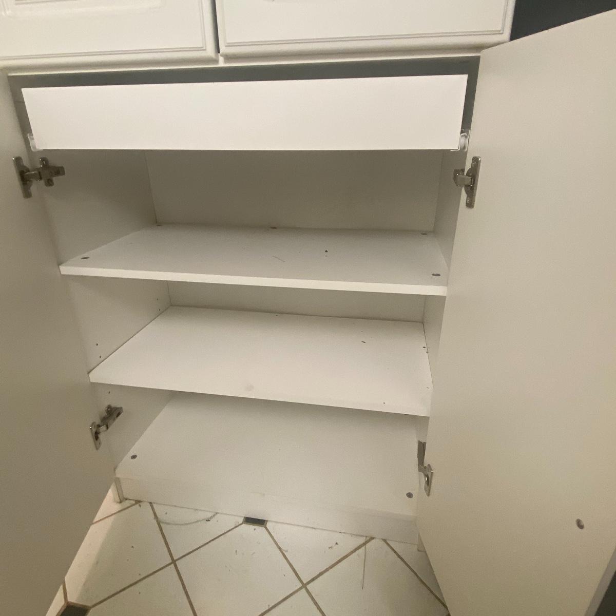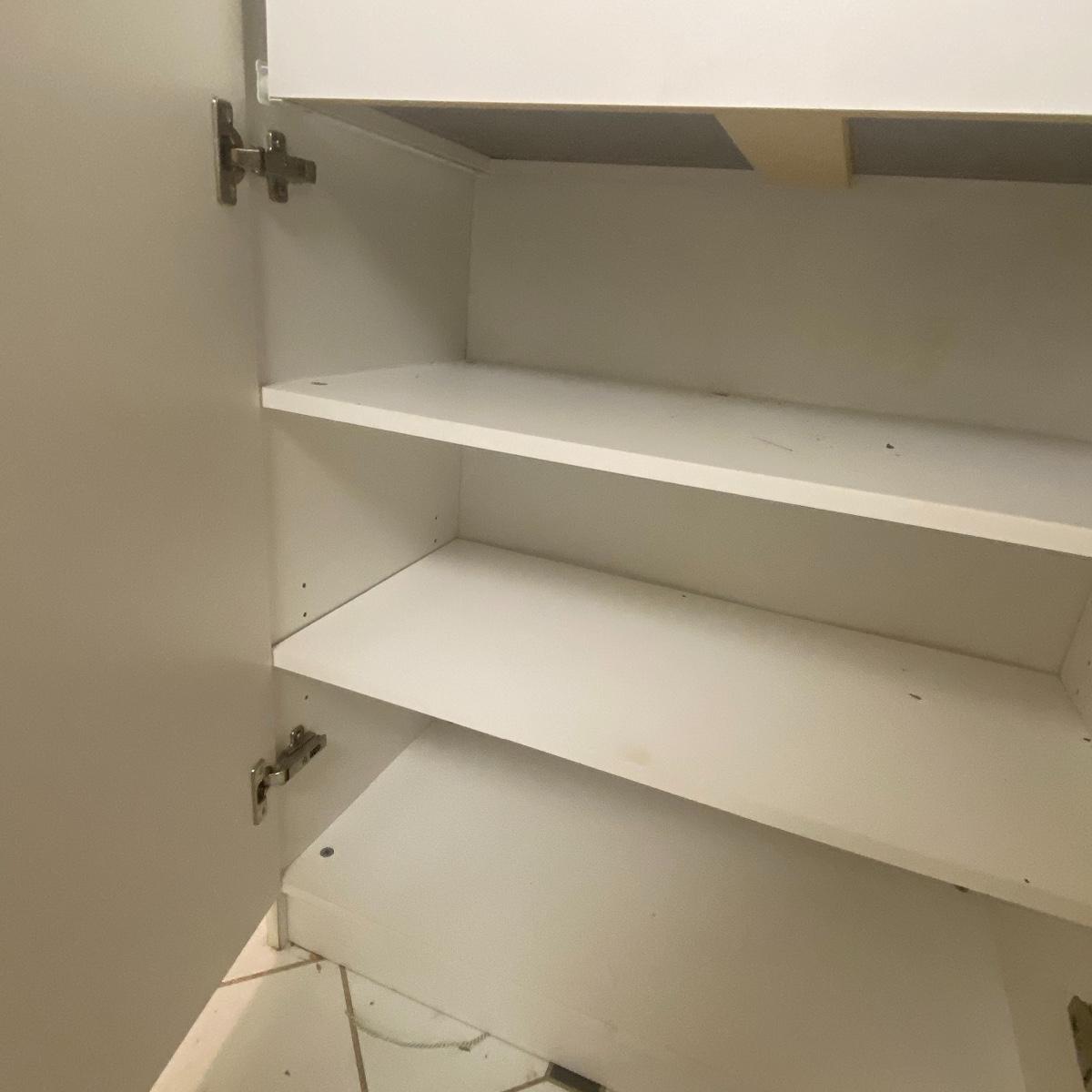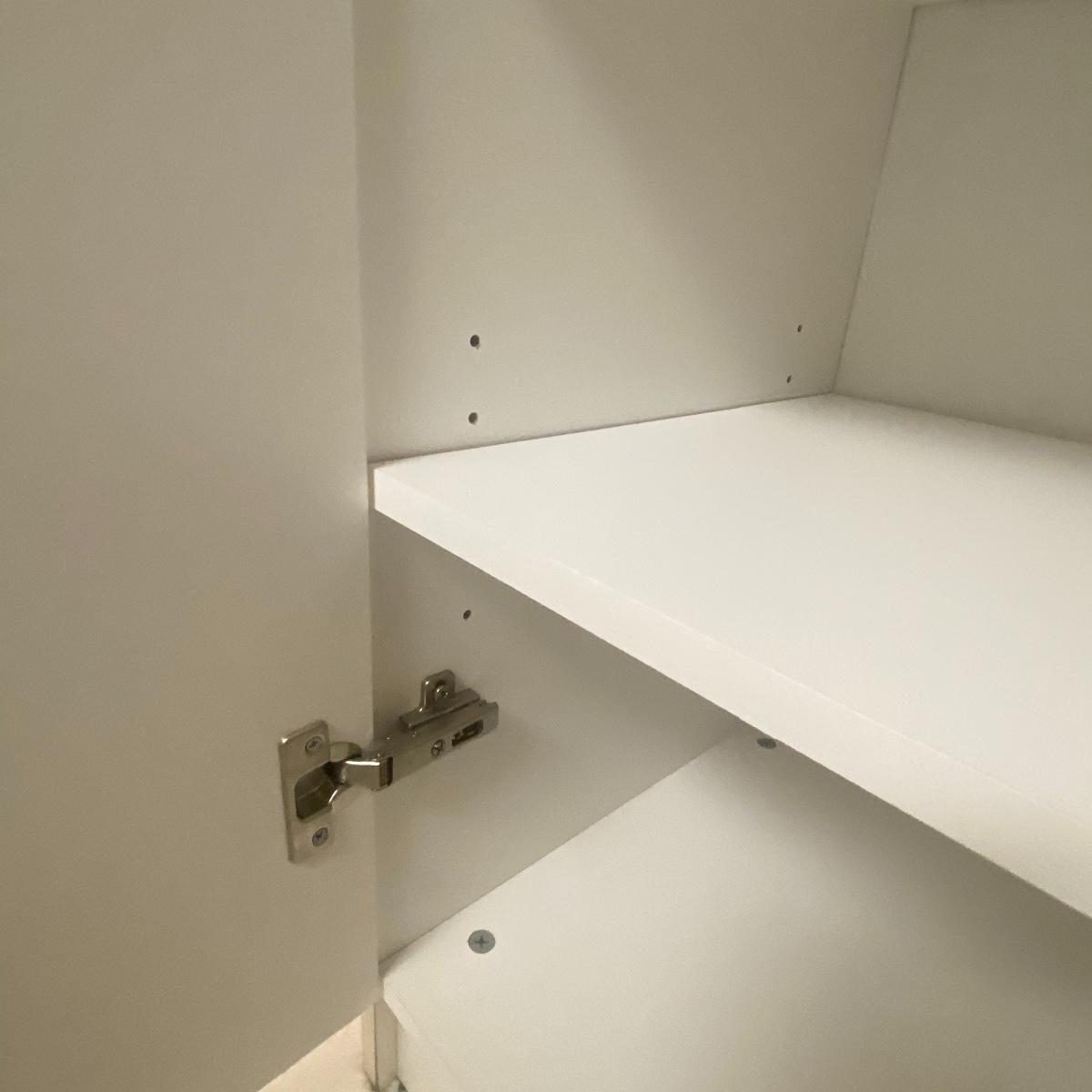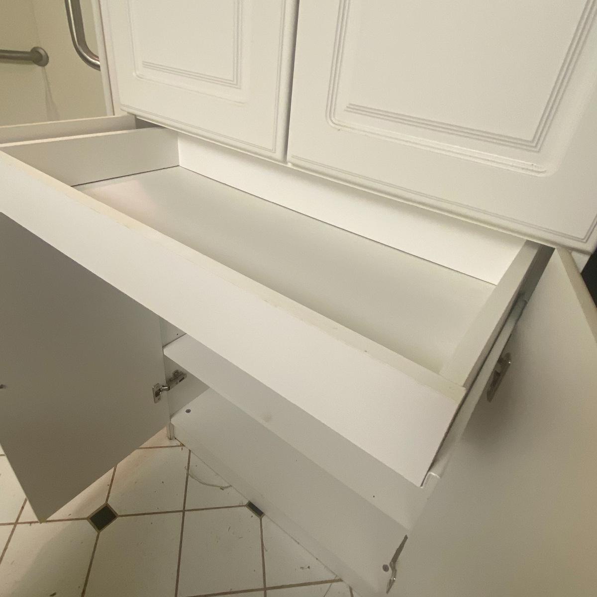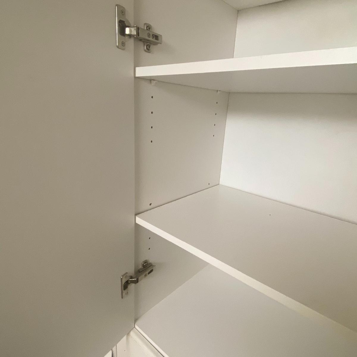 This lot is a large white pressed wood cabinet that is made up of two smaller cabinets stacked and attached to each other. First cabinet has doors that opens up to three open storage shelves, two of the shelves are adjustable. See photos. The second cabinet has doors that open up to a small drawer that pulls out and three shelves of storage Space, only one shelf on the bottom is adjustable. See photos. Entire unit measures 30”x15”x71”. Local pickup only.