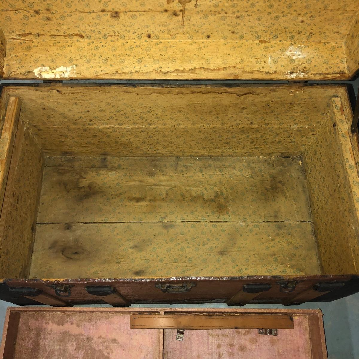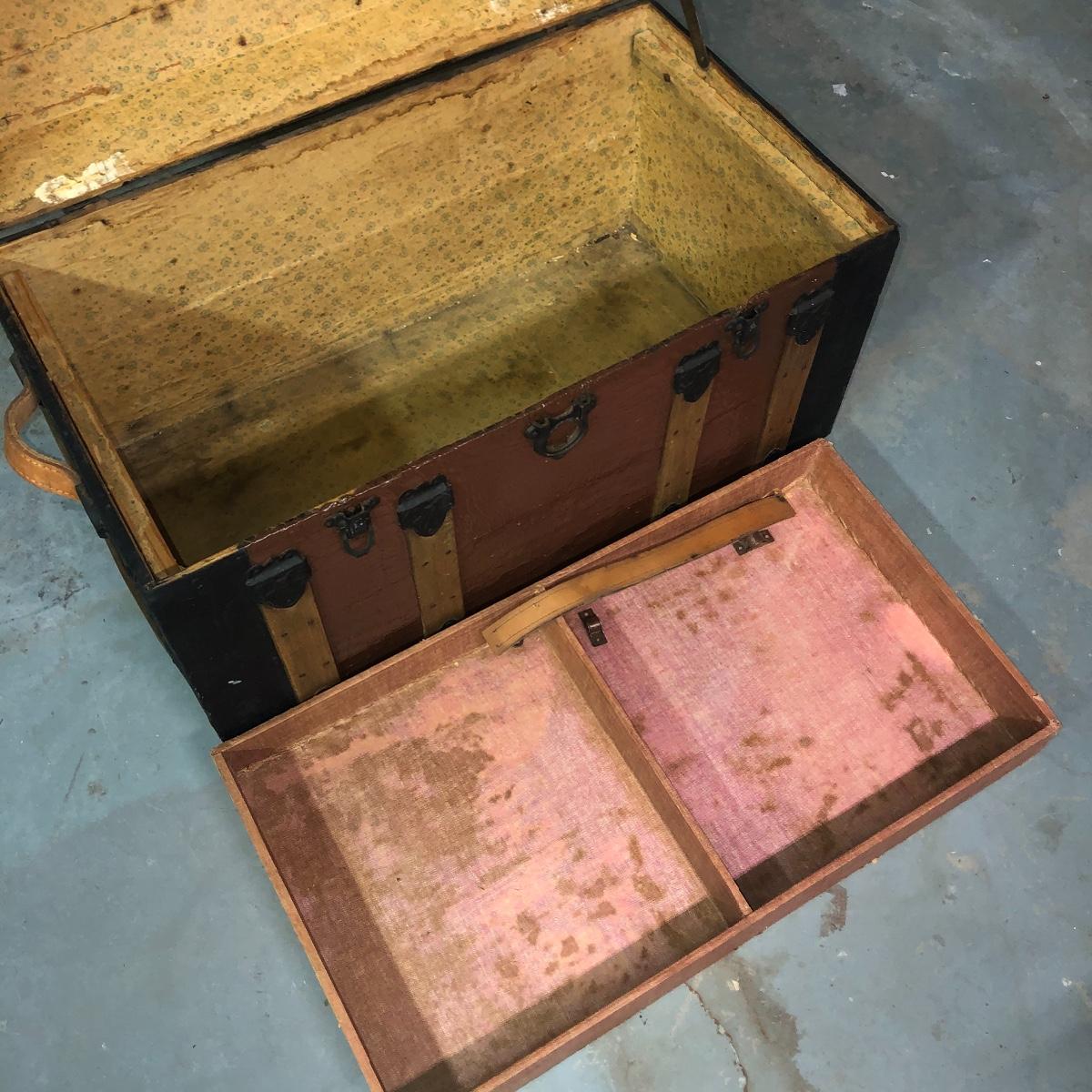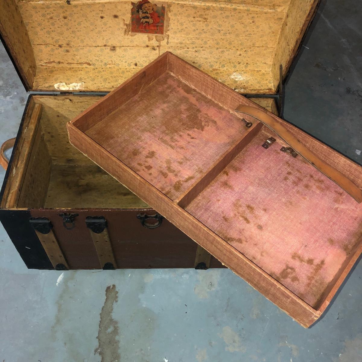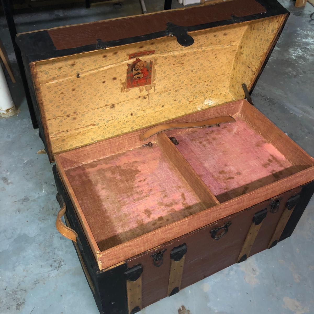 This camel back trunk is the epitome of home decor that provides extra storage. The interior has a removable top layer of small storage that reveals bulk storage below. It has three clasps in the front and various matching metal hardware on the body. Leather handles on either side are great for relocating. Both leather straps appear to be replacements. Due to its age, this chest has a worn look inside but with a quick clean and some personalization, this chest will serve as functional and attractive home decor. It is 30.5” x 17” x 19”.