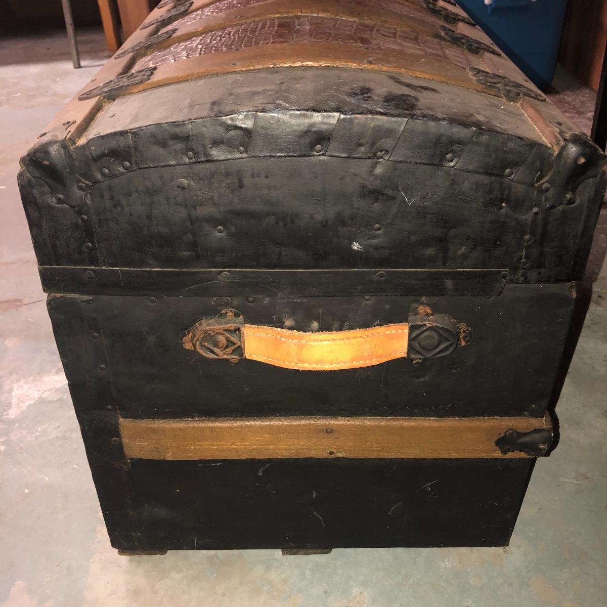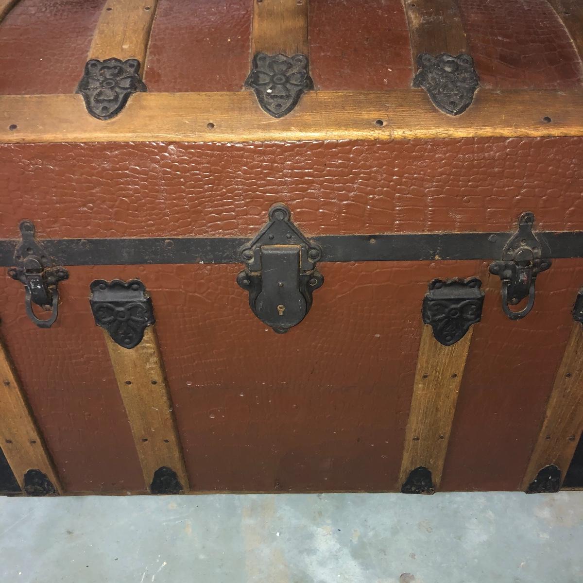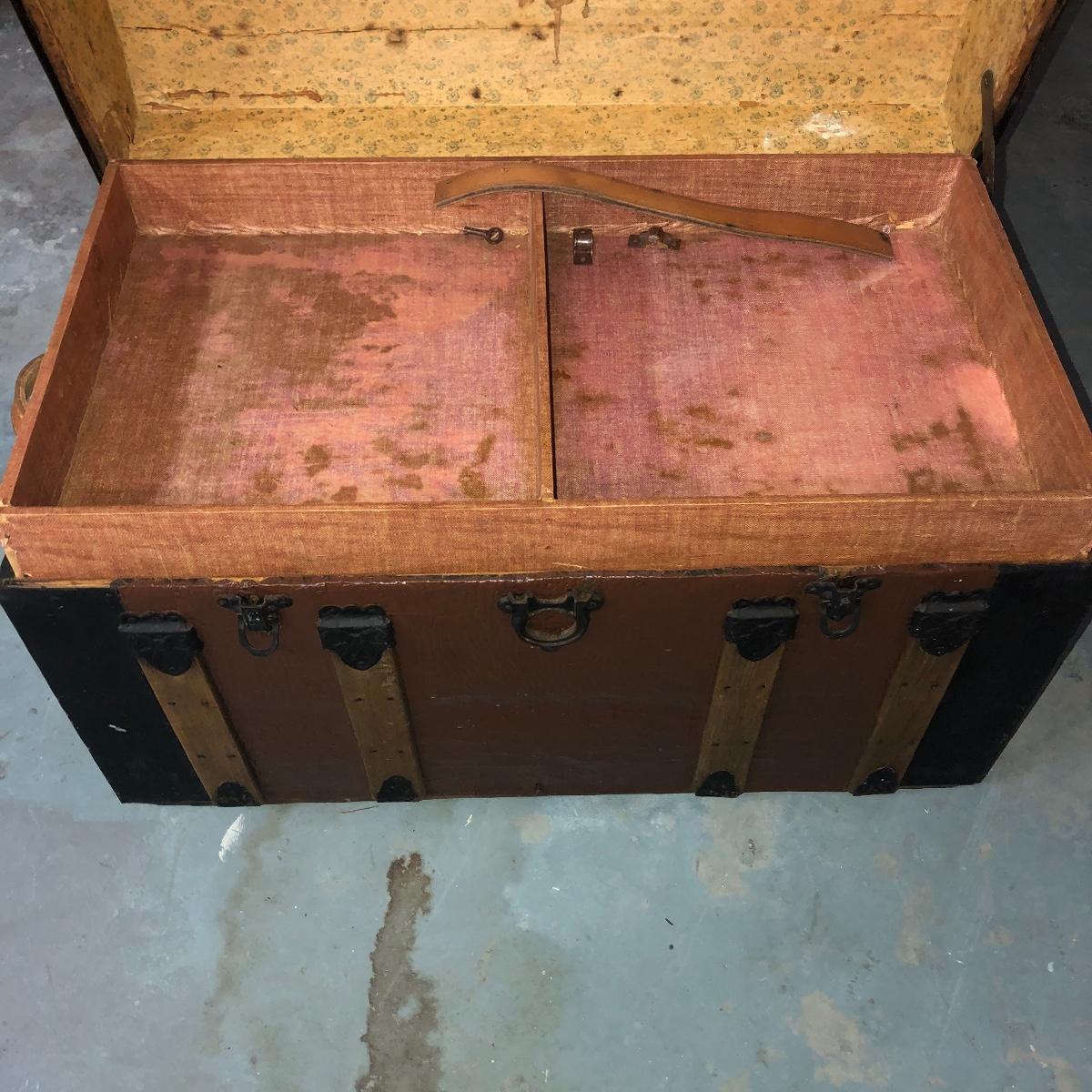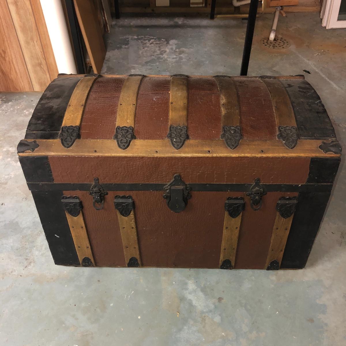 This camel back trunk is the epitome of home decor that provides extra storage. The interior has a removable top layer of small storage that reveals bulk storage below. It has three clasps in the front and various matching metal hardware on the body. Leather handles on either side are great for relocating. Both leather straps appear to be replacements. Due to its age, this chest has a worn look inside but with a quick clean and some personalization, this chest will serve as functional and attractive home decor. It is 30.5” x 17” x 19”.