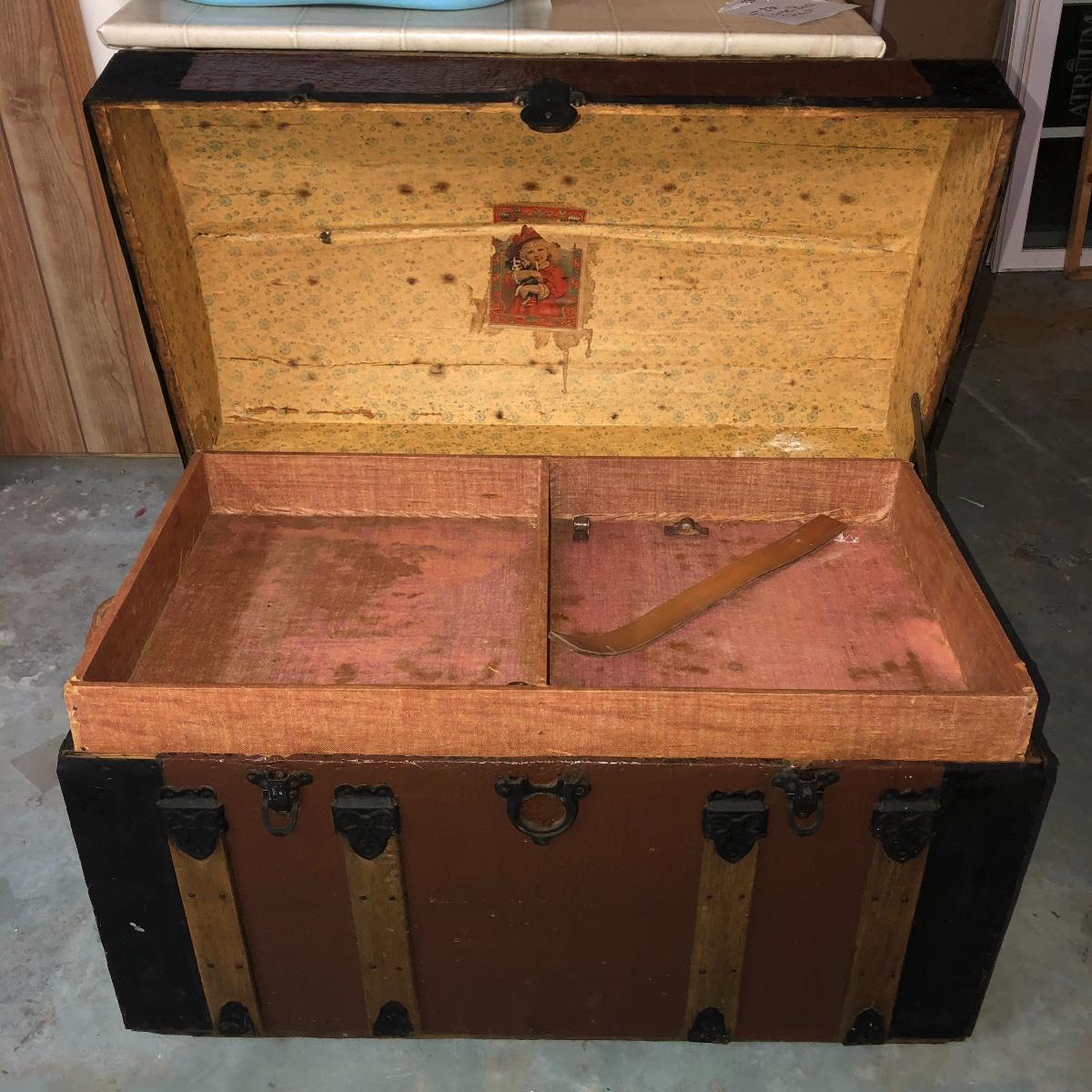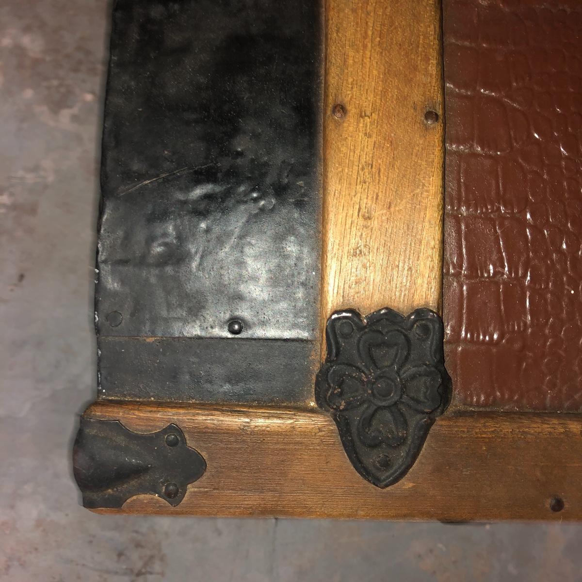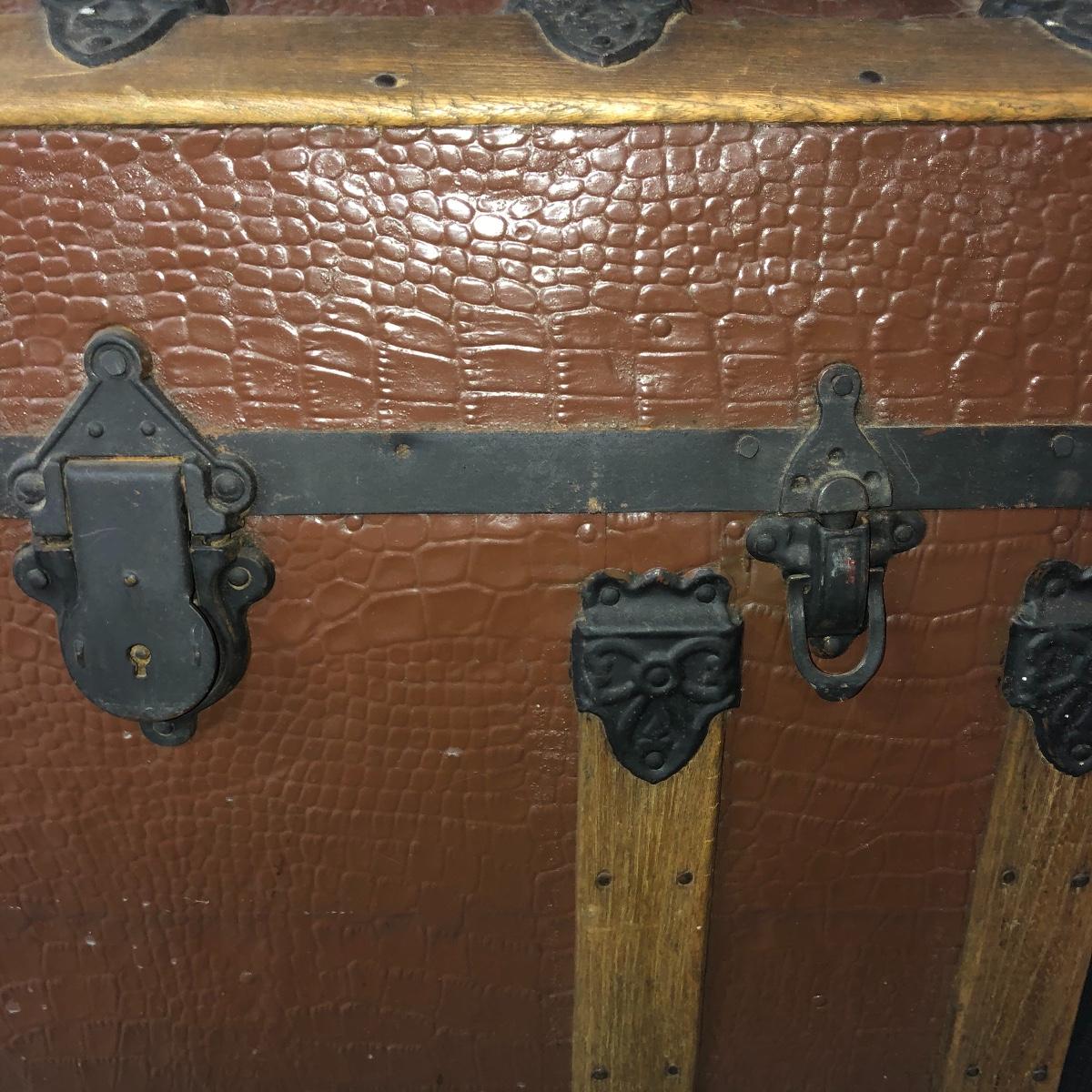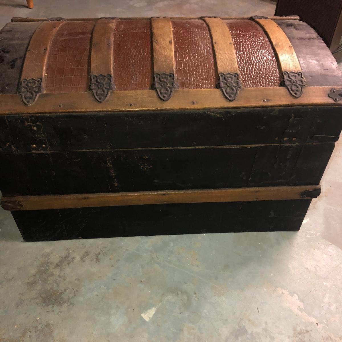 This camel back trunk is the epitome of home decor that provides extra storage. The interior has a removable top layer of small storage that reveals bulk storage below. It has three clasps in the front and various matching metal hardware on the body. Leather handles on either side are great for relocating. Both leather straps appear to be replacements. Due to its age, this chest has a worn look inside but with a quick clean and some personalization, this chest will serve as functional and attractive home decor. It is 30.5” x 17” x 19”.