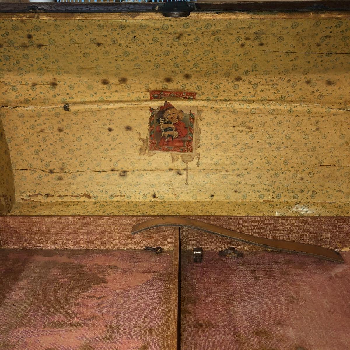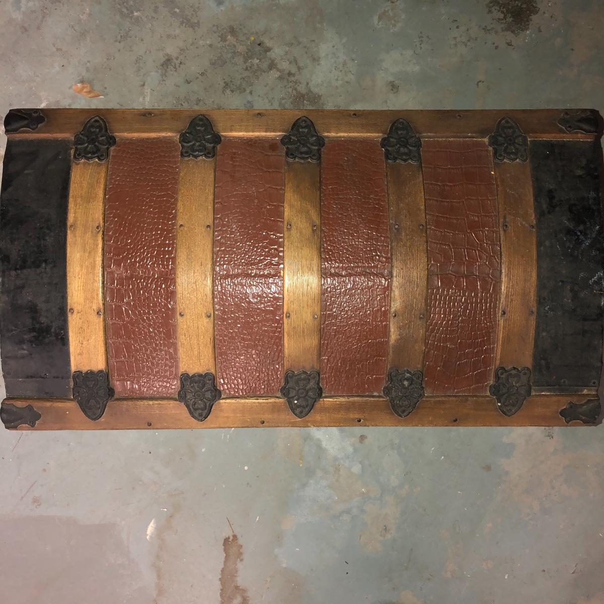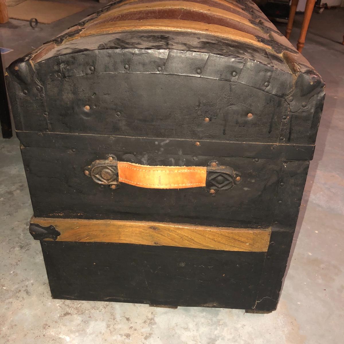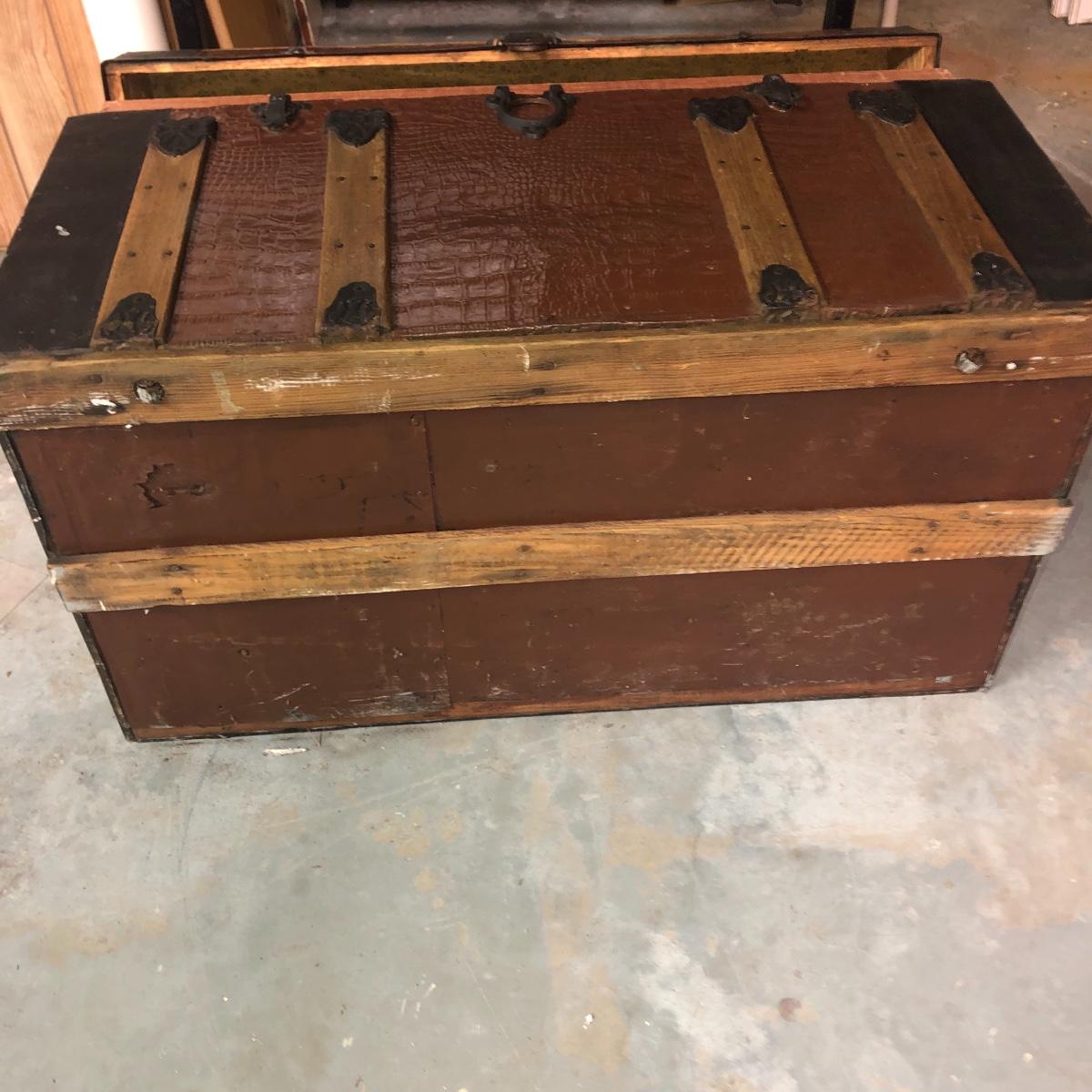This camel back trunk is the epitome of home decor that provides extra storage. The interior has a removable top layer of small storage that reveals bulk storage below. It has three clasps in the front and various matching metal hardware on the body. Leather handles on either side are great for relocating. Both leather straps appear to be replacements. Due to its age, this chest has a worn look inside but with a quick clean and some personalization, this chest will serve as functional and attractive home decor. It is 30.5” x 17” x 19”.