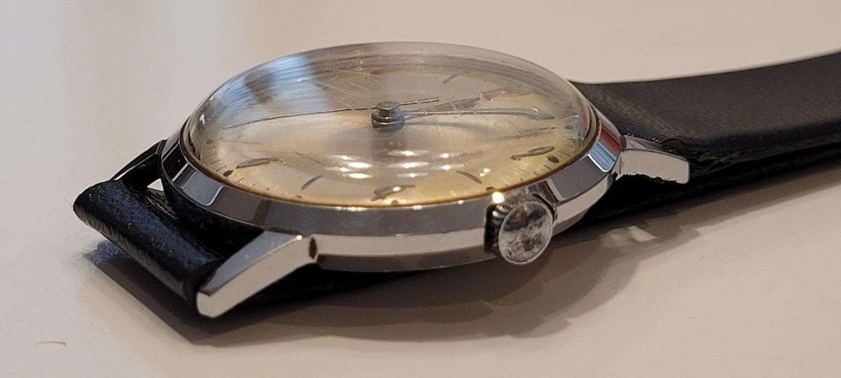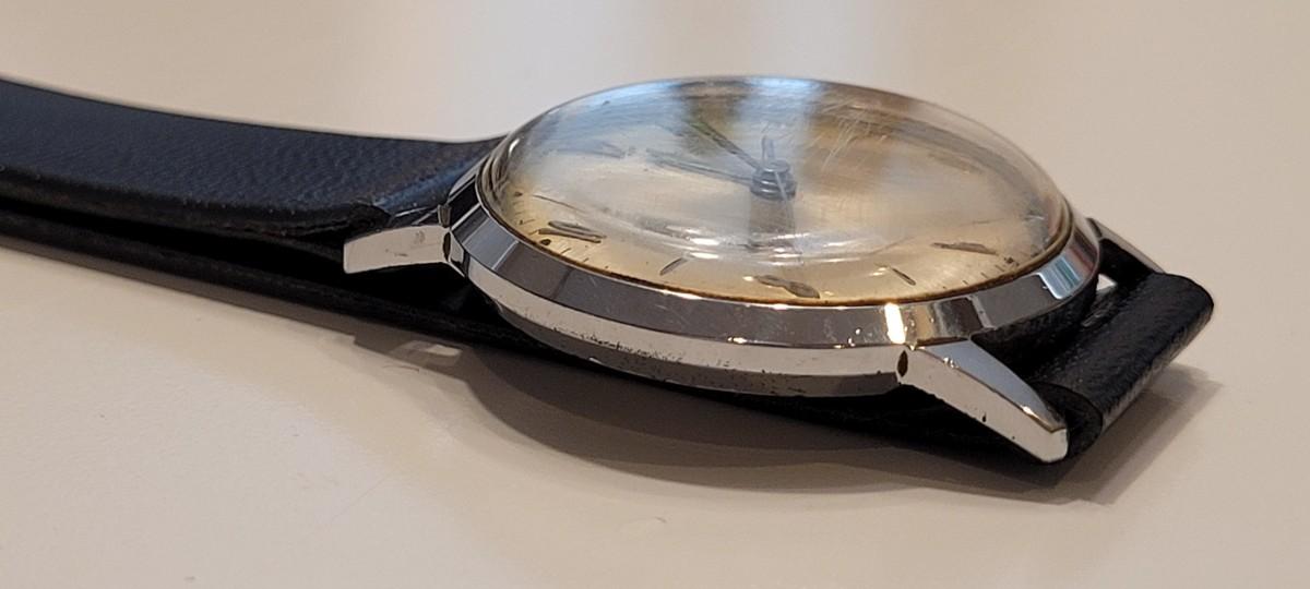 Unisex Vintage TIMEX Dress Watch that has a Manual Wind movement that is keeping nice time currently. Waterproof. Dauphin Style Numbers in this all original Dial. Black leather band.