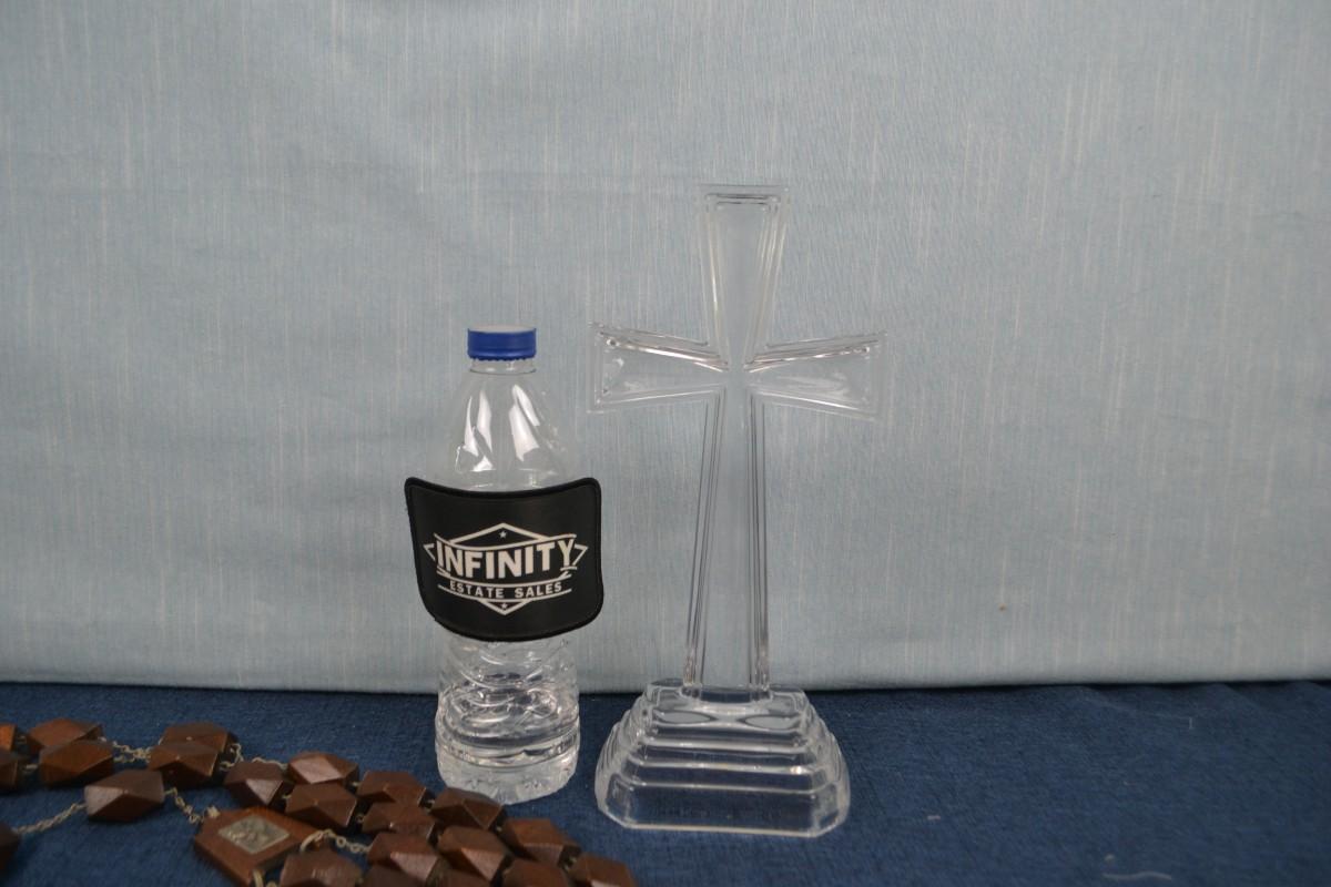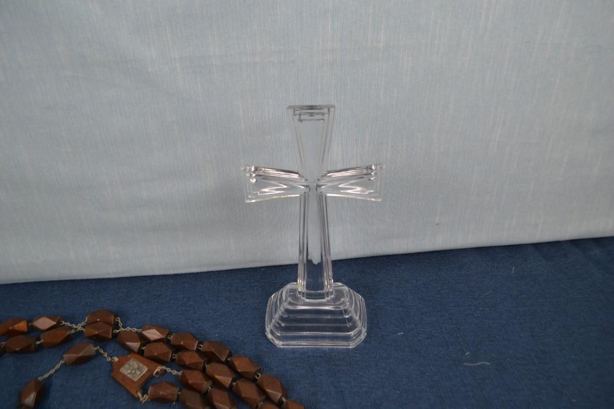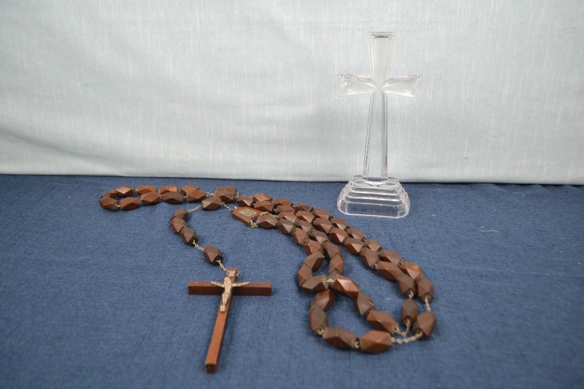 LOT 231. VINTAGE WOOD ROSARY 63" LONG AND GLASS CROSS
