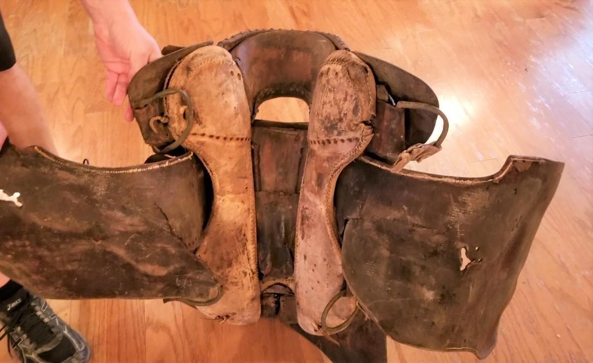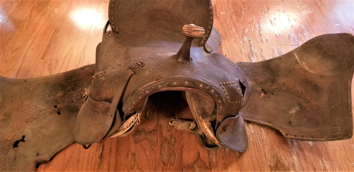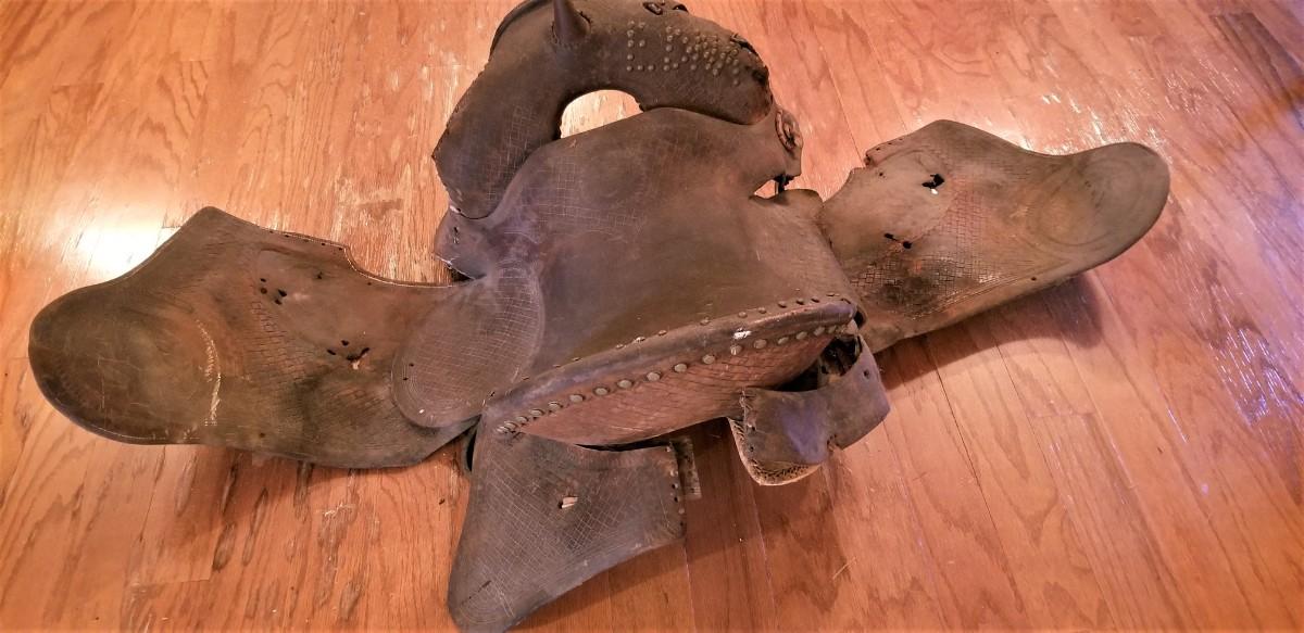 Antique leather saddle, as found. Metal pommel and metal decorations - all original. 21" long. Antique condition.