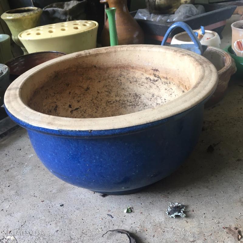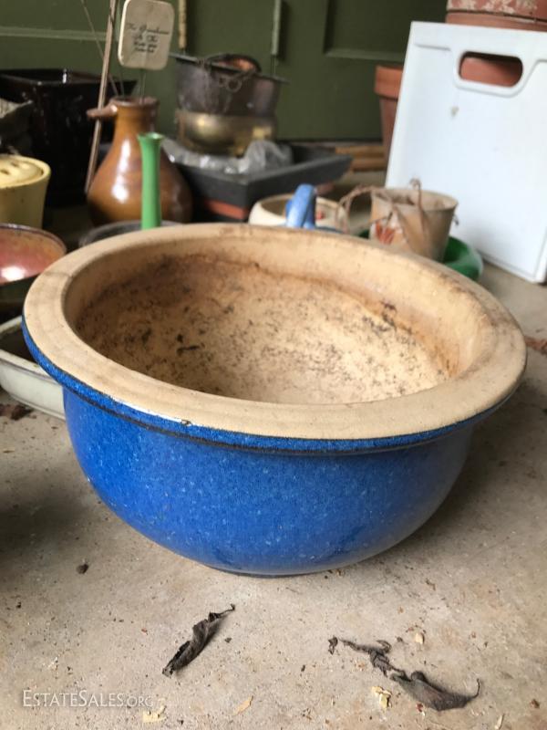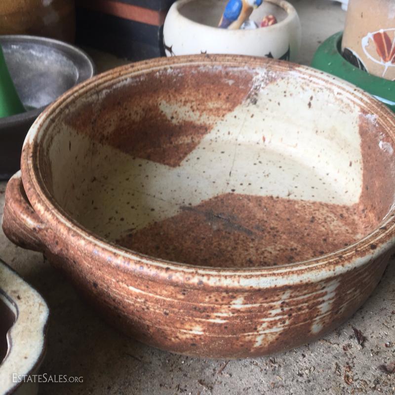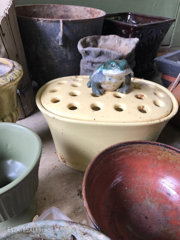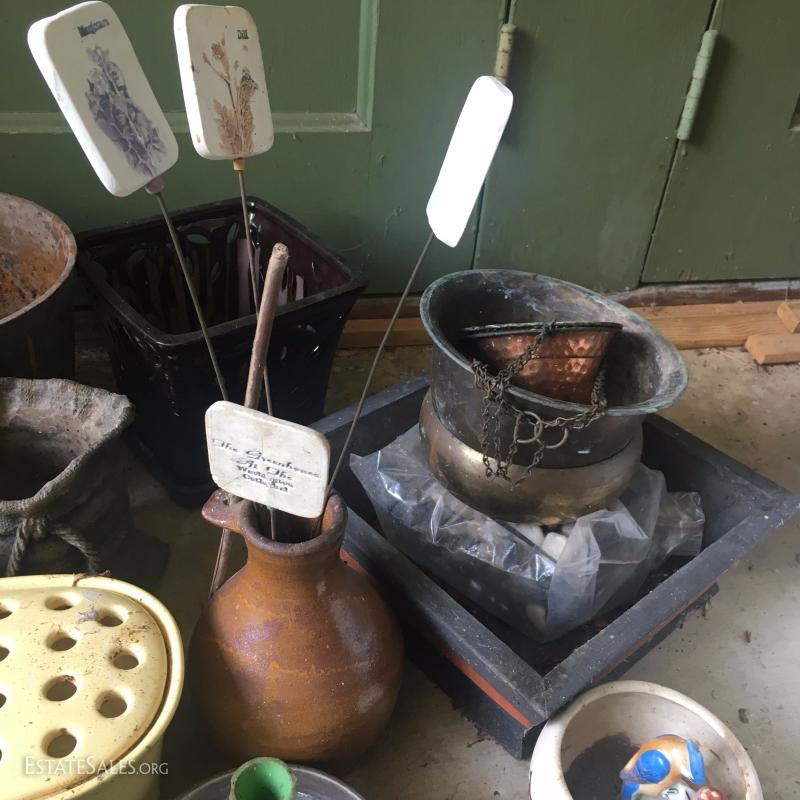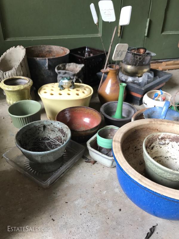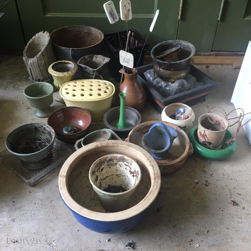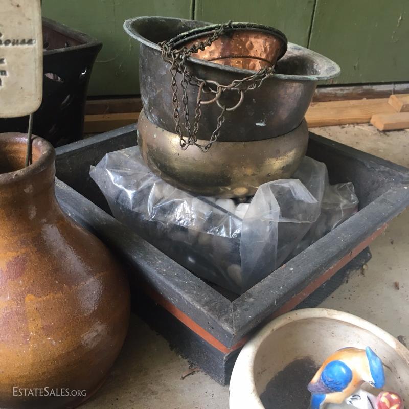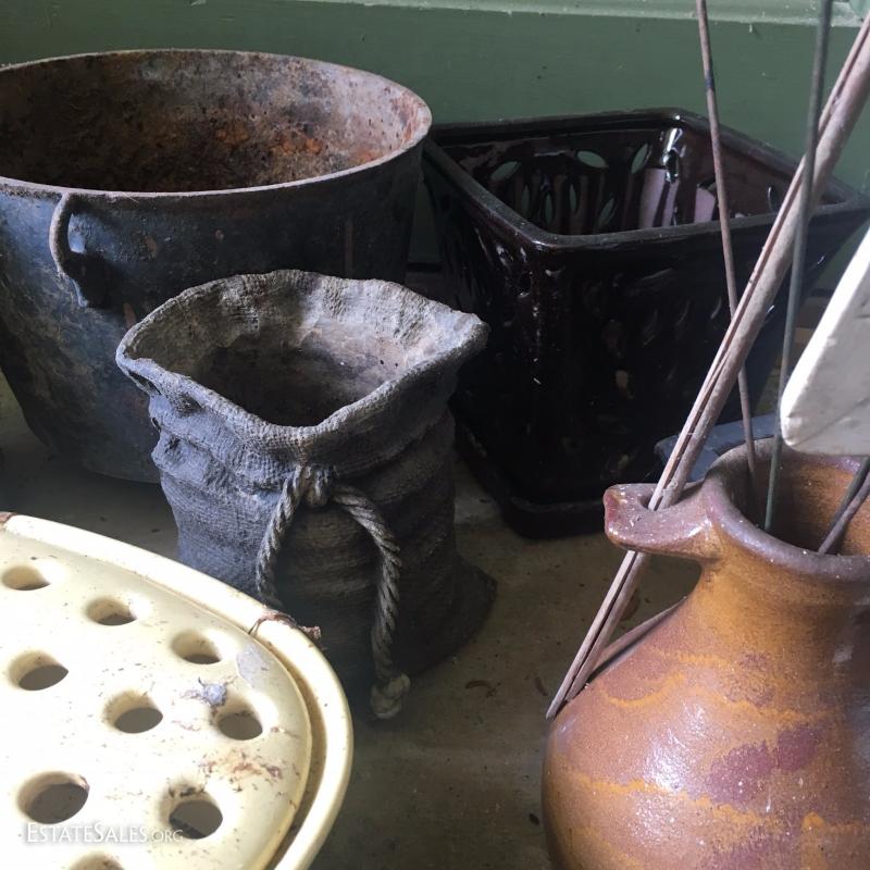 Assorted pots. All sizes. Mostly ceramic. Some brass. One cast iron. Other Misc items