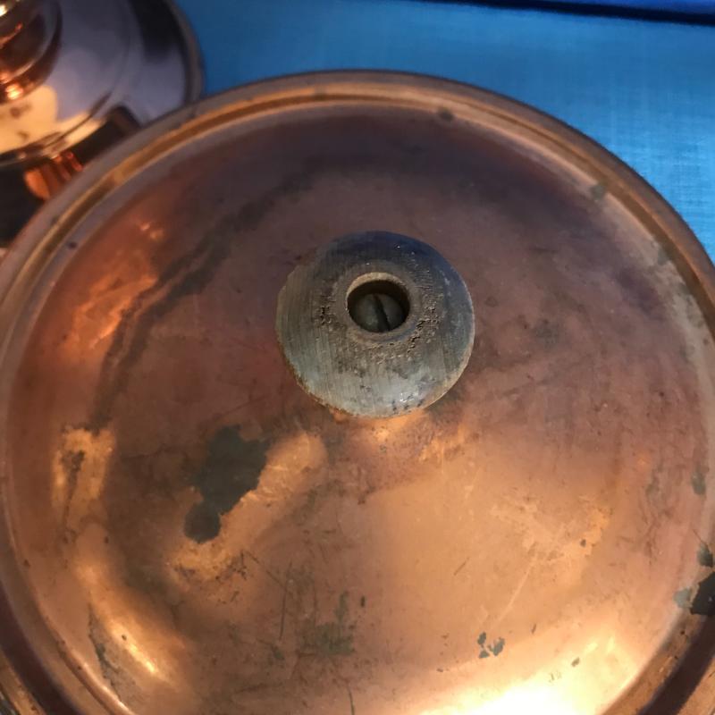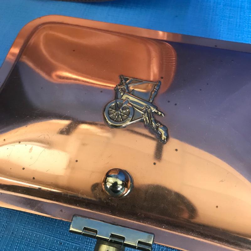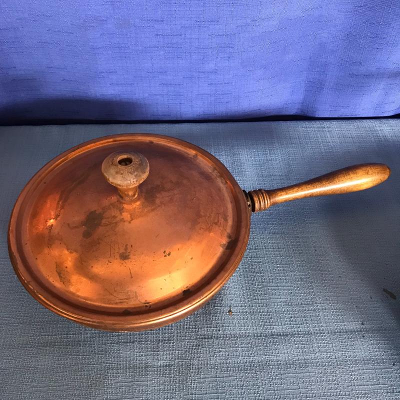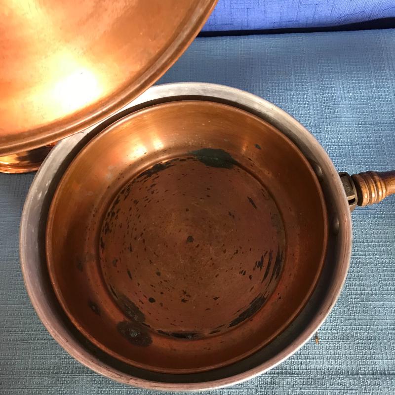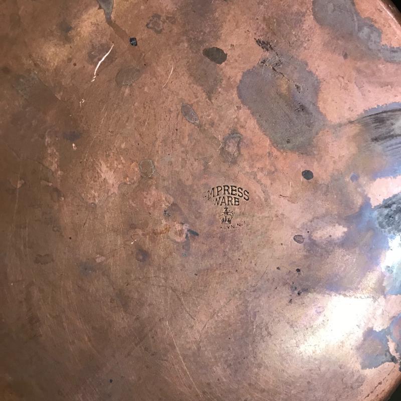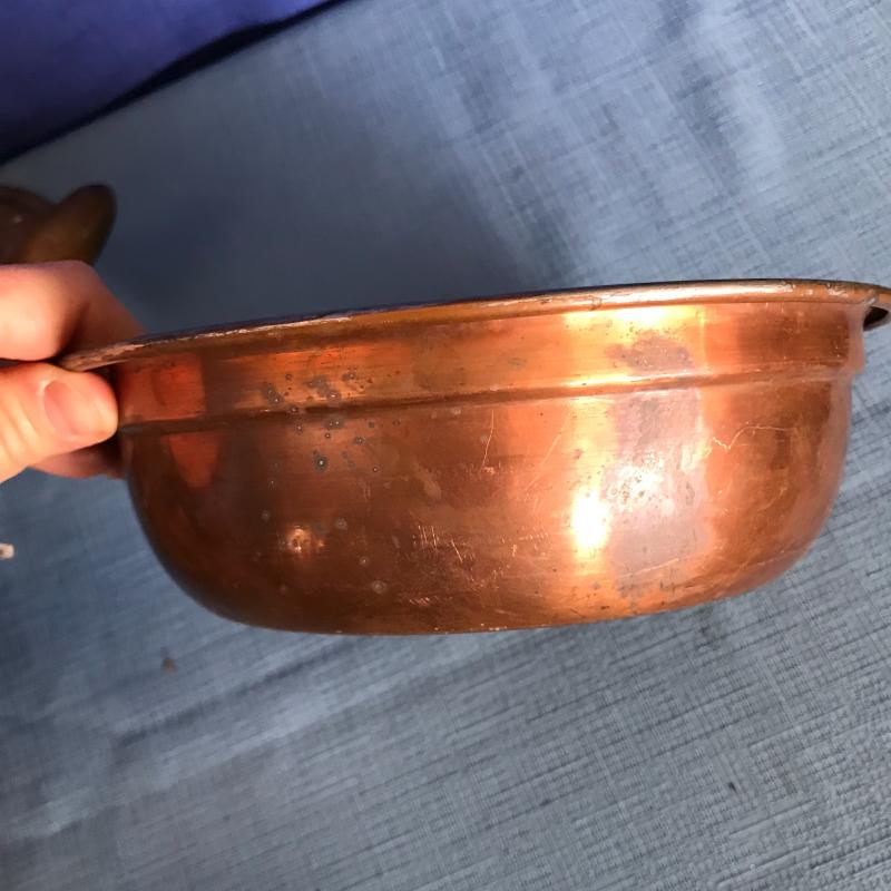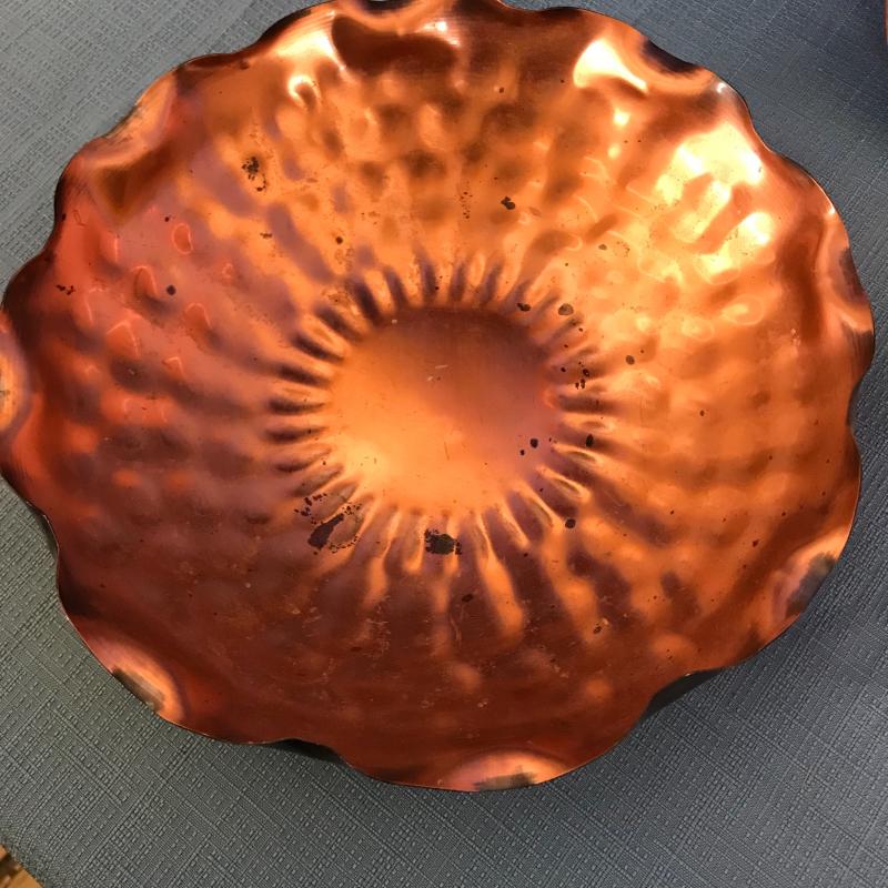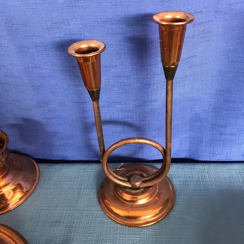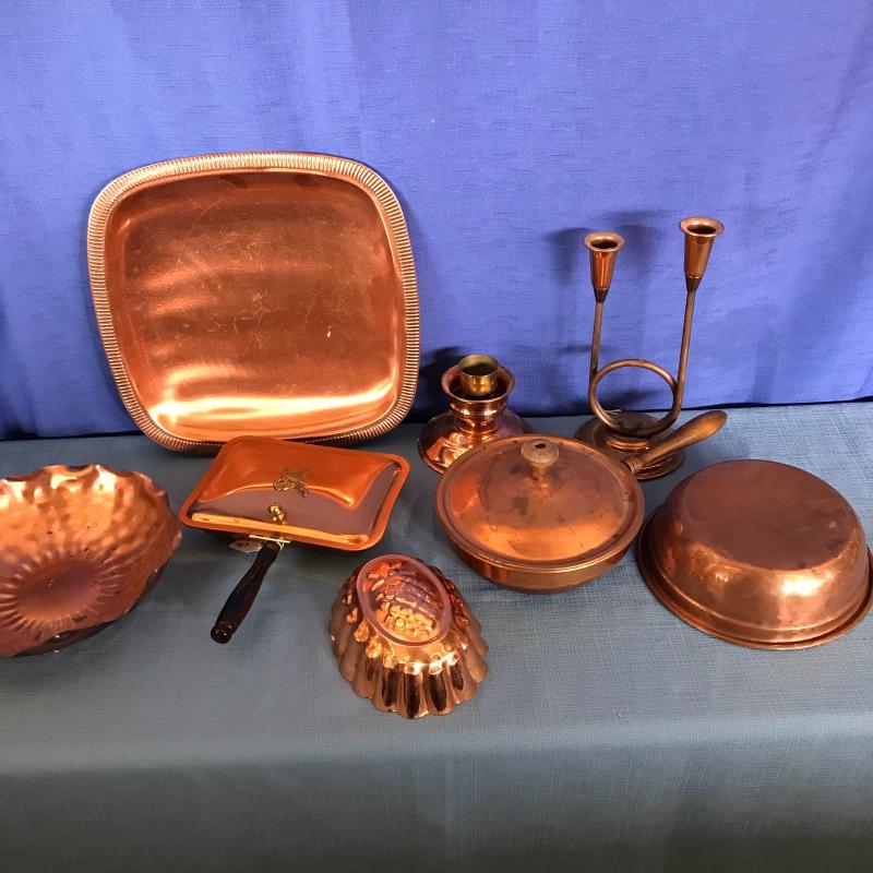 Lot includes some solid copper pieces and some copper plated pieces. Includes double boiler, bowl, candleholder, twisted double candlestick holder, plate, fluted bowl, mold, and pan with handle and lid. Candleholder is approx. 10” tall. No shipping available. Local pickup only in Maggie Valley, NC.
