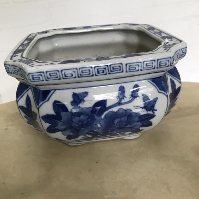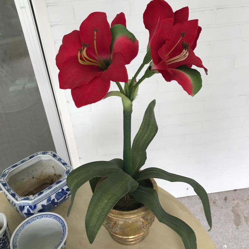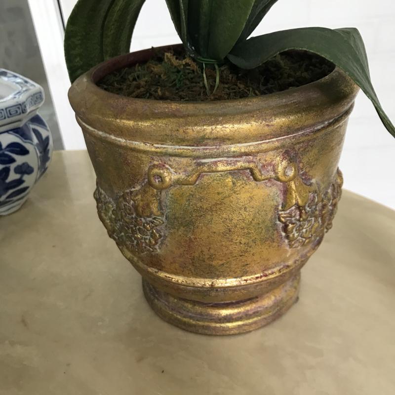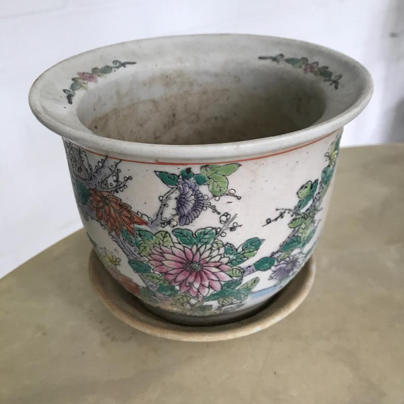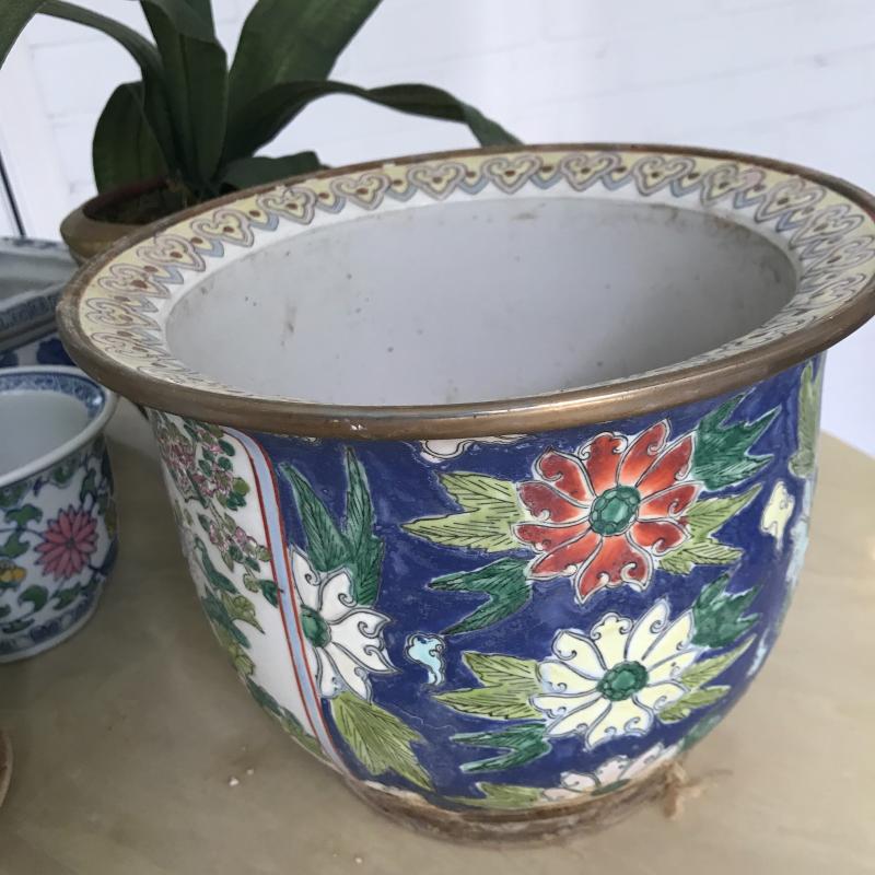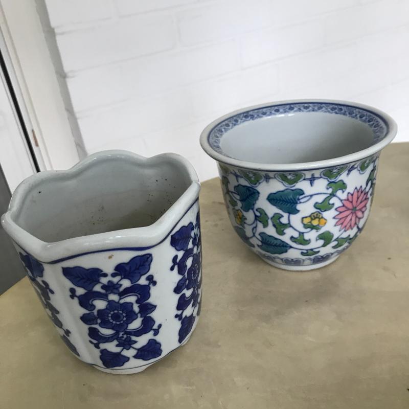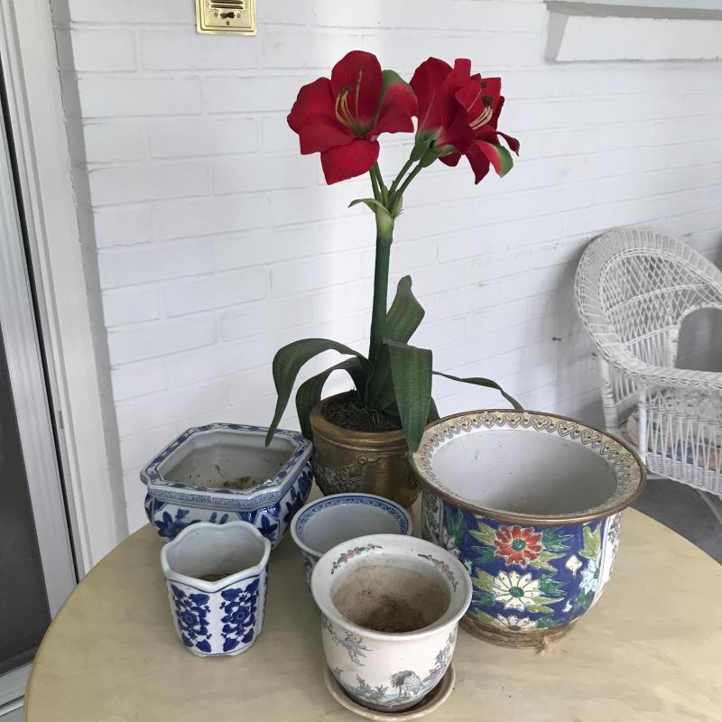 Lot of nice pots for flowers in your home. Includes one faux flowering plant that measure 6”d x 21”h. Largest pot measures 9”d x 7”h. No shipping.