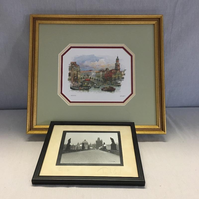 Framed city artwork includes framed, matted and signed photo of Prague and a framed, matted and signed print of Venice. A great gift for the travel lover or keep for yourself. Largest frame measures 14.5” x 16”.