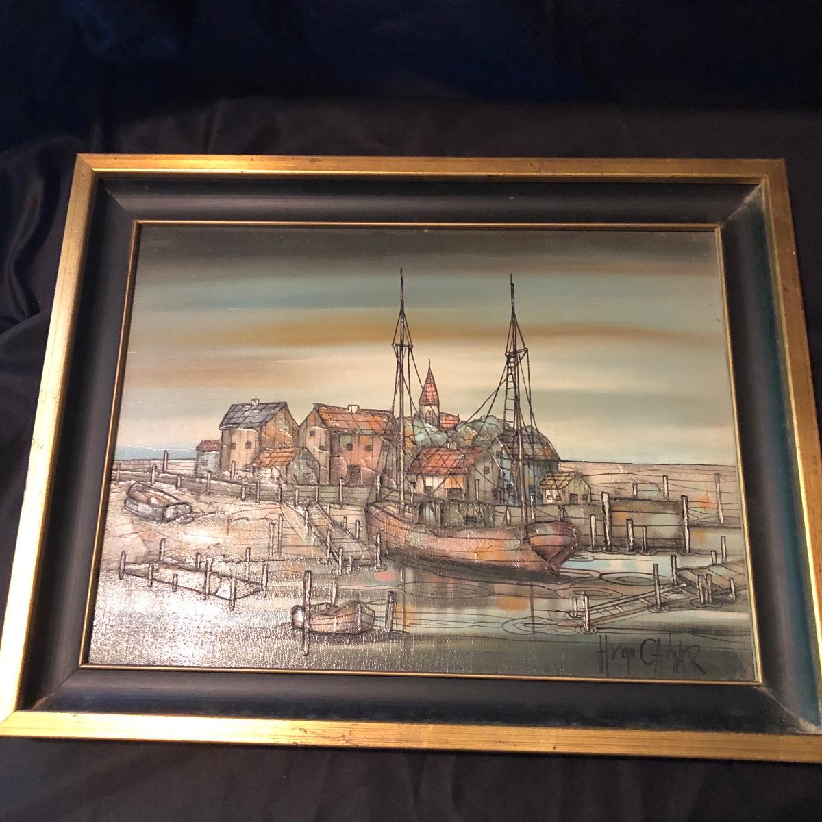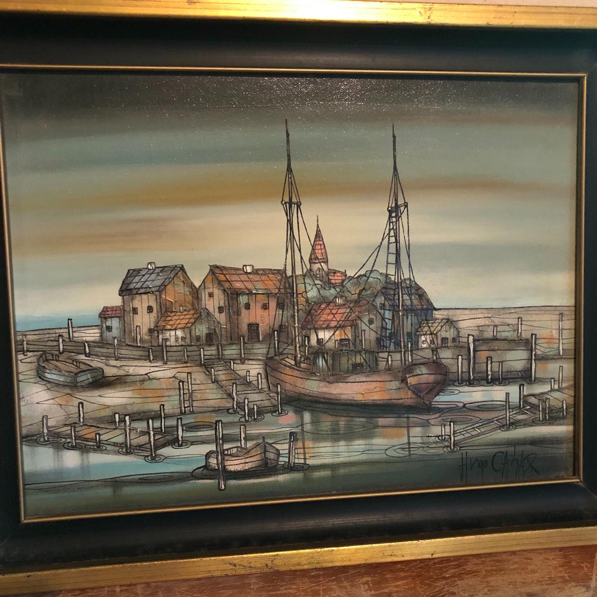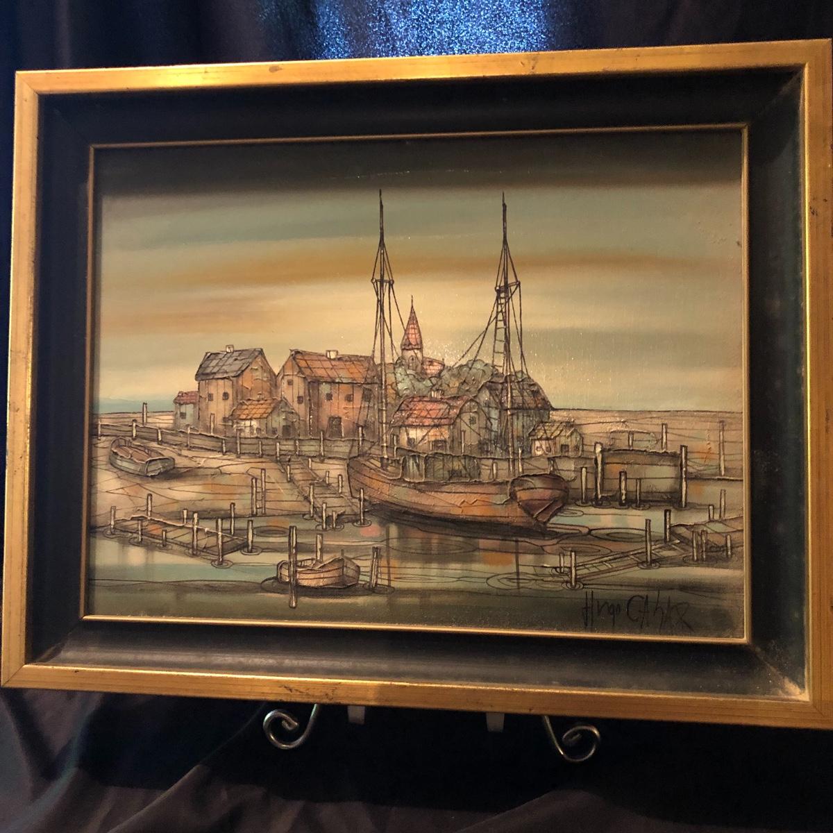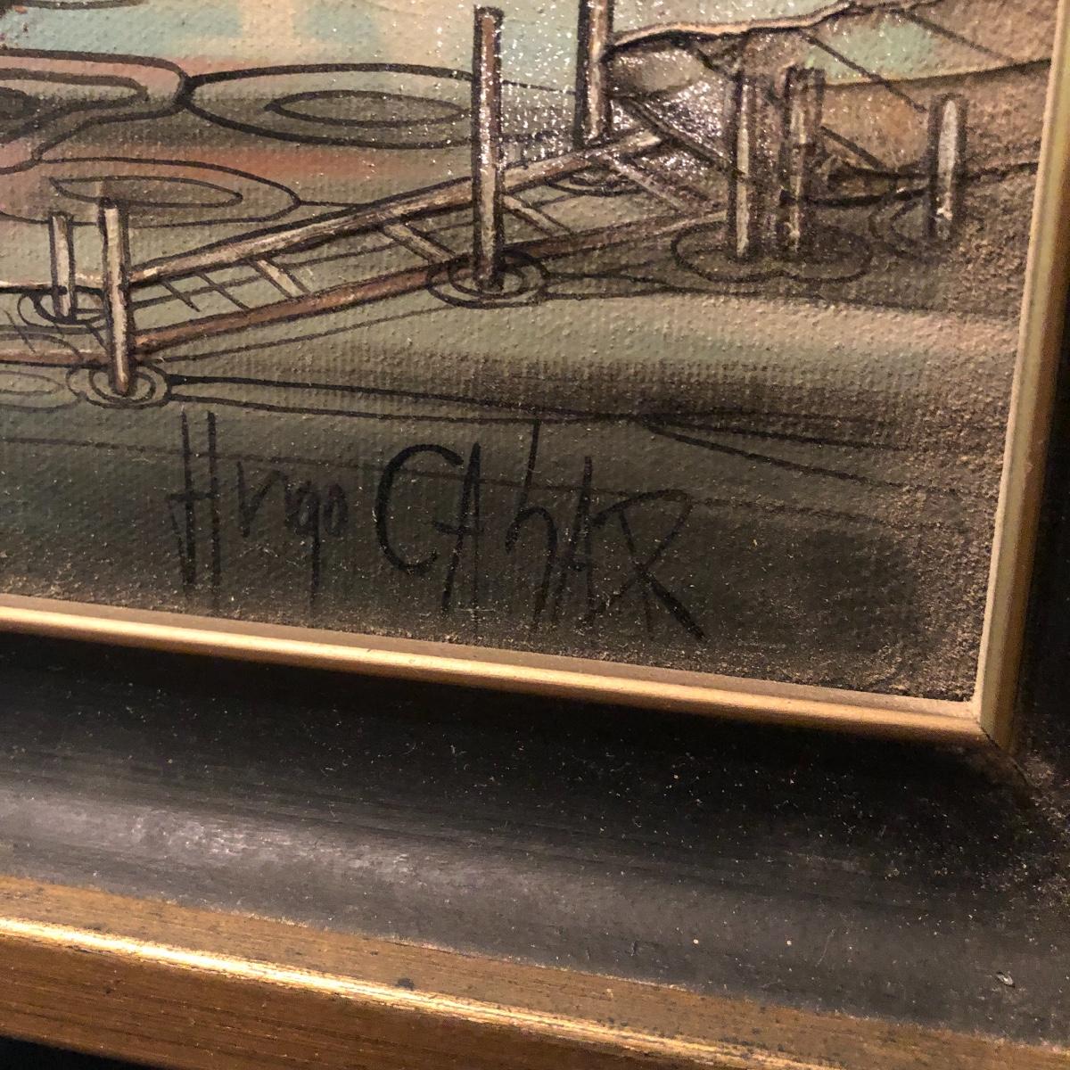 This stunning oil painting has the signed name - Hugo Cahar. Its a wonderful depiction of a harbor scene and measures 19” x 15”. Shipping Available; please call UPS for a quote as shipping art can be costly.