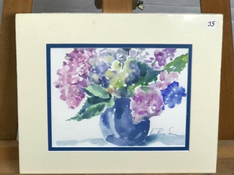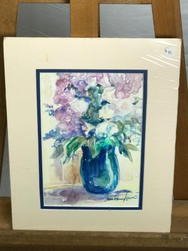 Four small Jean Ranney Smith signed original watercolor paintings “Blue Vase” measures 14”x11” “Purple Vase” measures 12”x10”, “Red Mug” measures 10”x8-1/2” and “Garden Scenery” measures 11”x9”