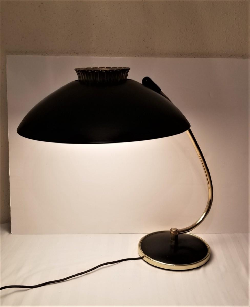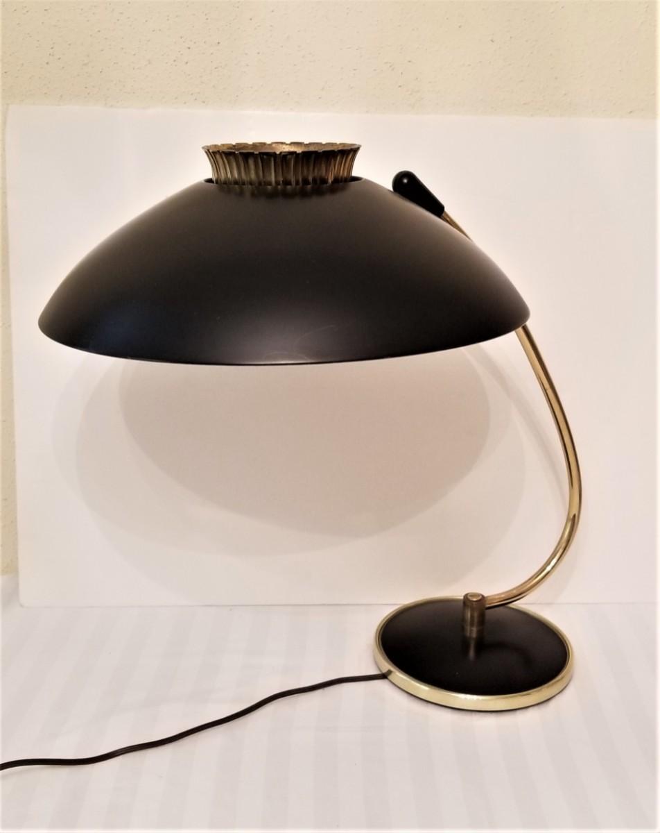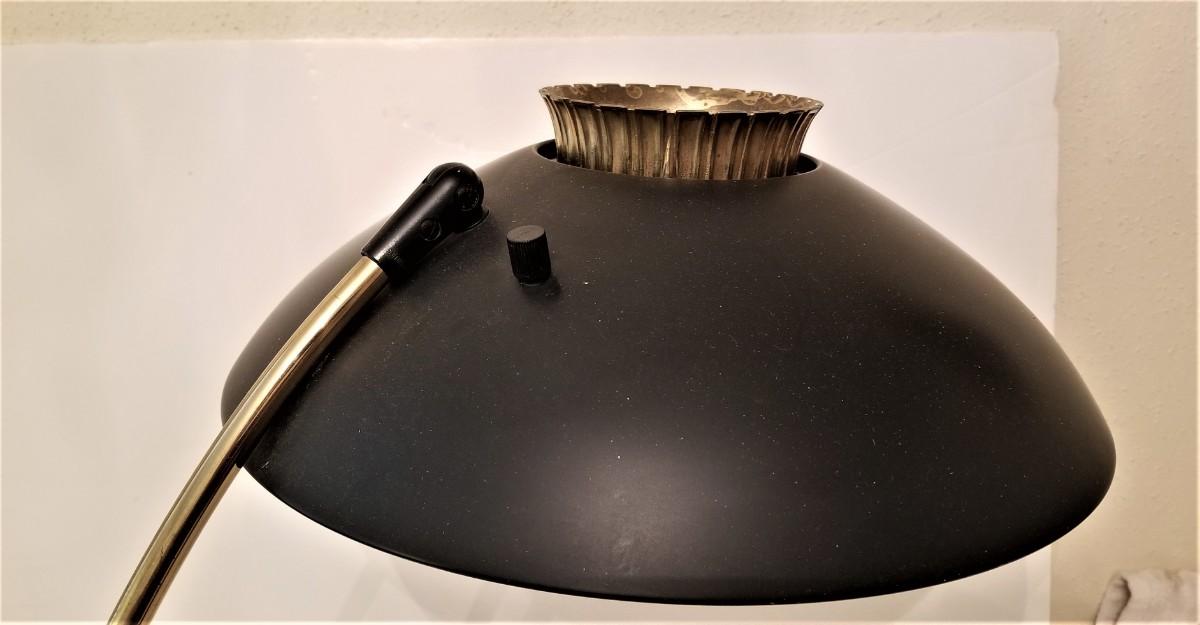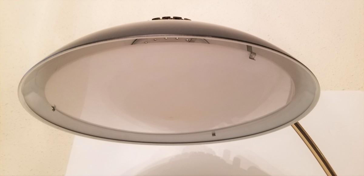 This sleek mid-century modern table/desk lamp is in good working condition. Metal shade and base. Glass insert over bulbs diffuses the light and is intact. Vintage cord - switch on the top. About 20" tall.