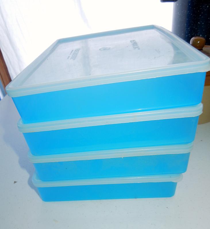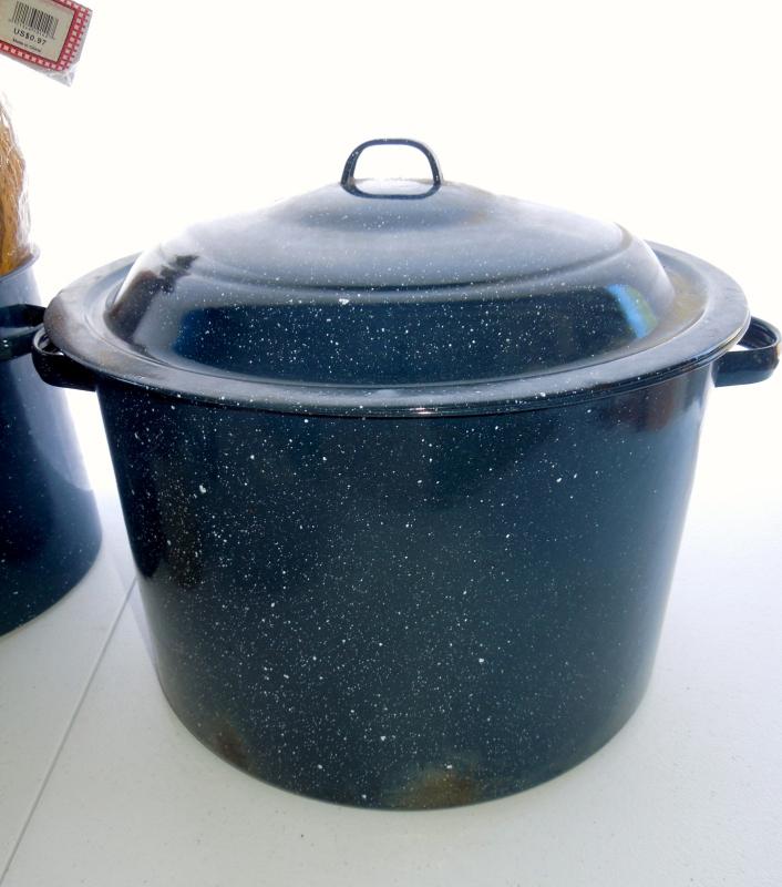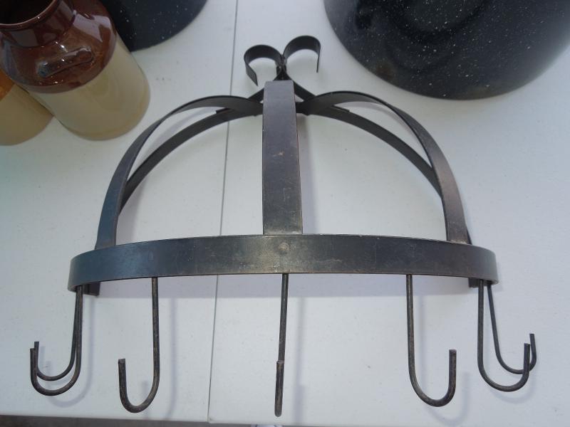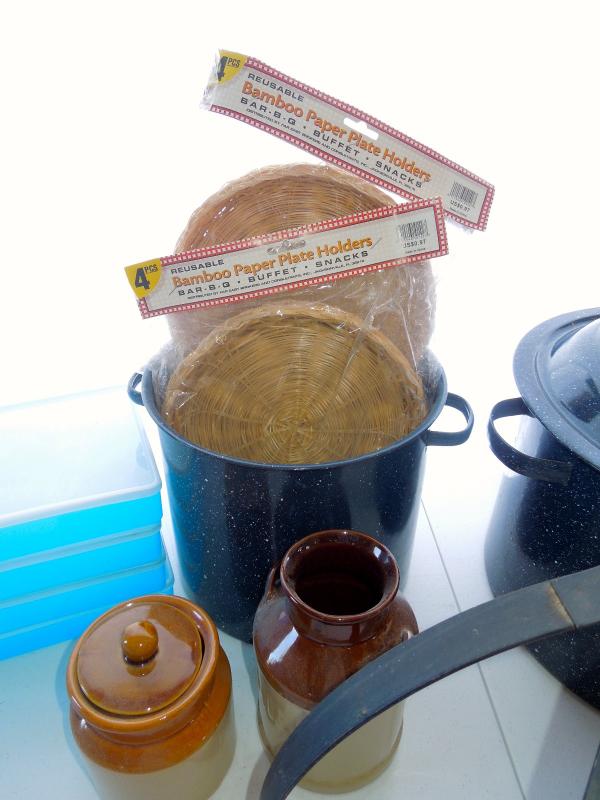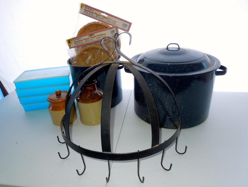 Four covered lid rectangular plastic storage containers; 2 brown ceramic crocks; 8 rattan paper plate holders in package; 1 smaller iron hanging pot rack; 2 blue enamel stock pots (one no lid).