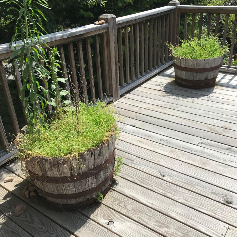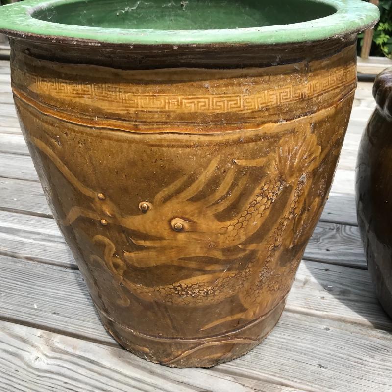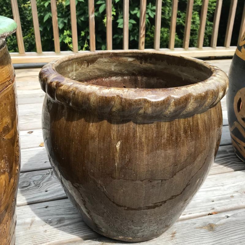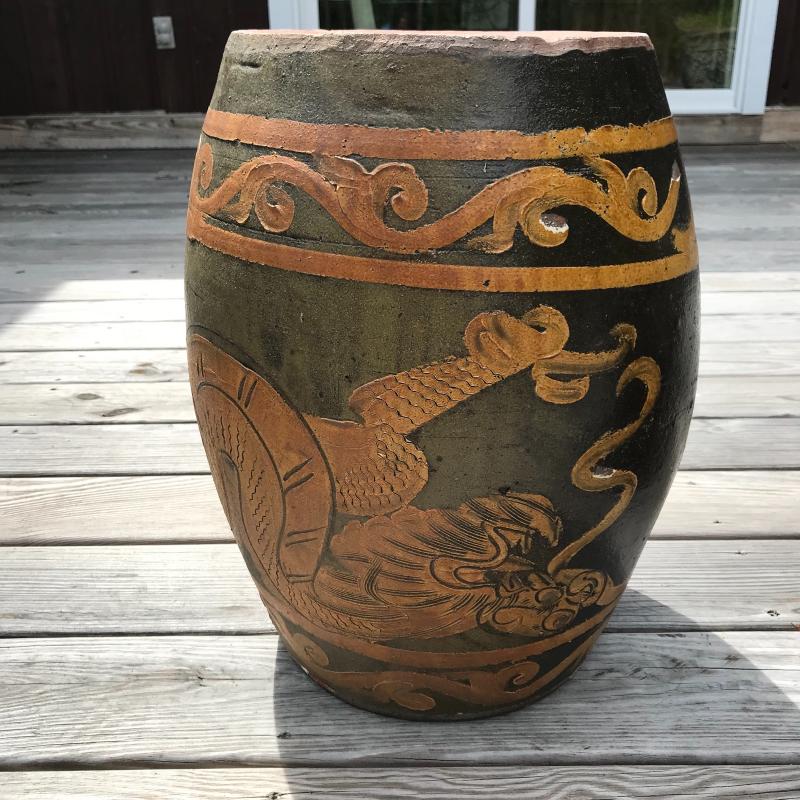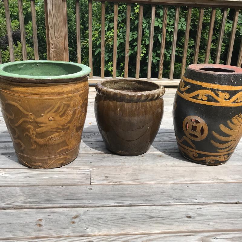 Lot includes two barrel planters that have been outside so are a bit worn. Also includes Two ceramic pots (Largest is 17”d x 18”h) and a ceramic stool or plant stand that is 14”d by 19”h No shipping. Local pick up only.